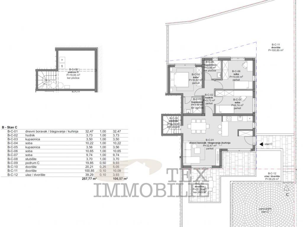 This spacious apartment features a well-thought-out layout, including a generous living room with a kitchen and dining area, three comfortable bedrooms, and two bathrooms. The associated courtyard with an area of 140.14 m², a basement of 19.85 m², and two parking spaces make it additionally suitable for comfortable living. For your comfort, the apartment will be equipped with underfloor heating and an inverter air conditioning unit for optimal heating and cooling throughout the year. An excellent opportunity for your new home or for tourist rentals!