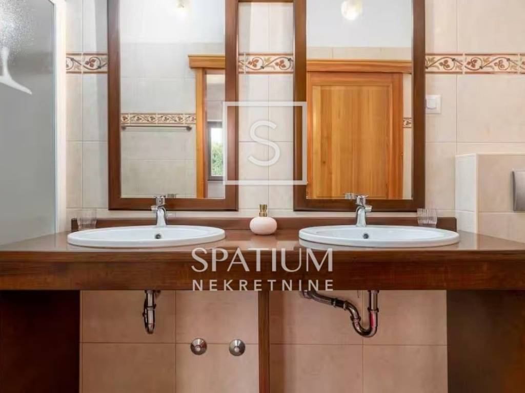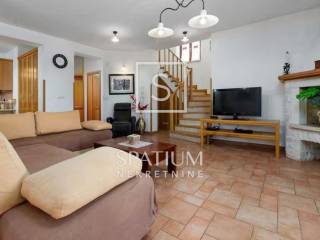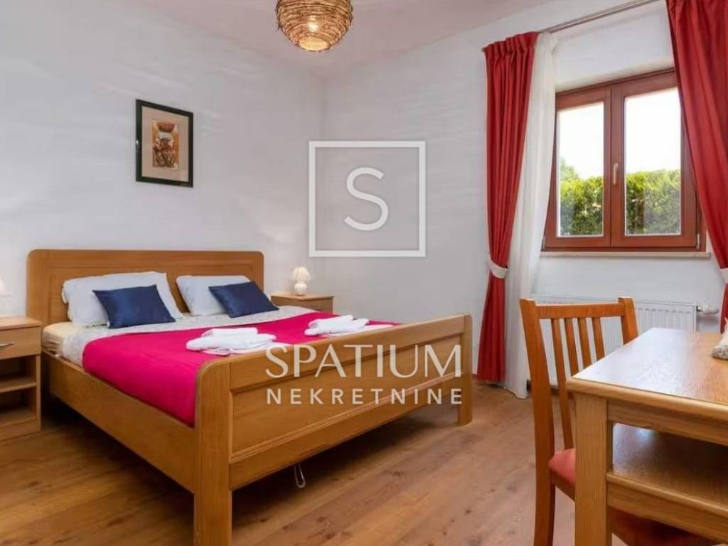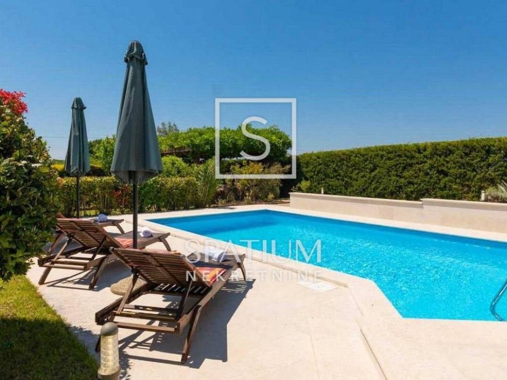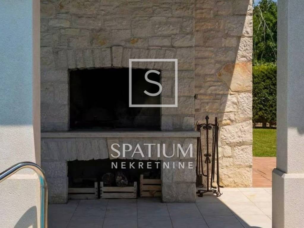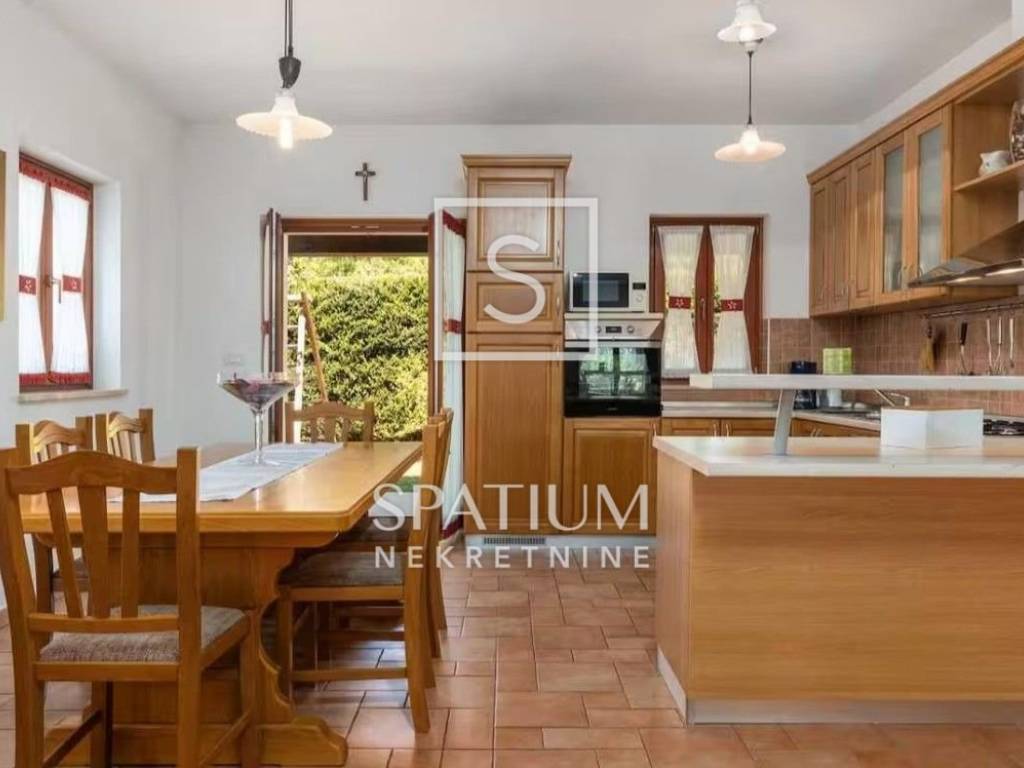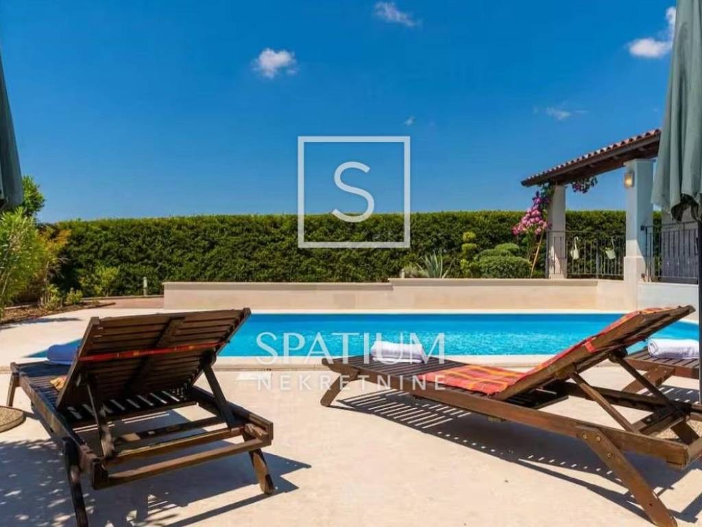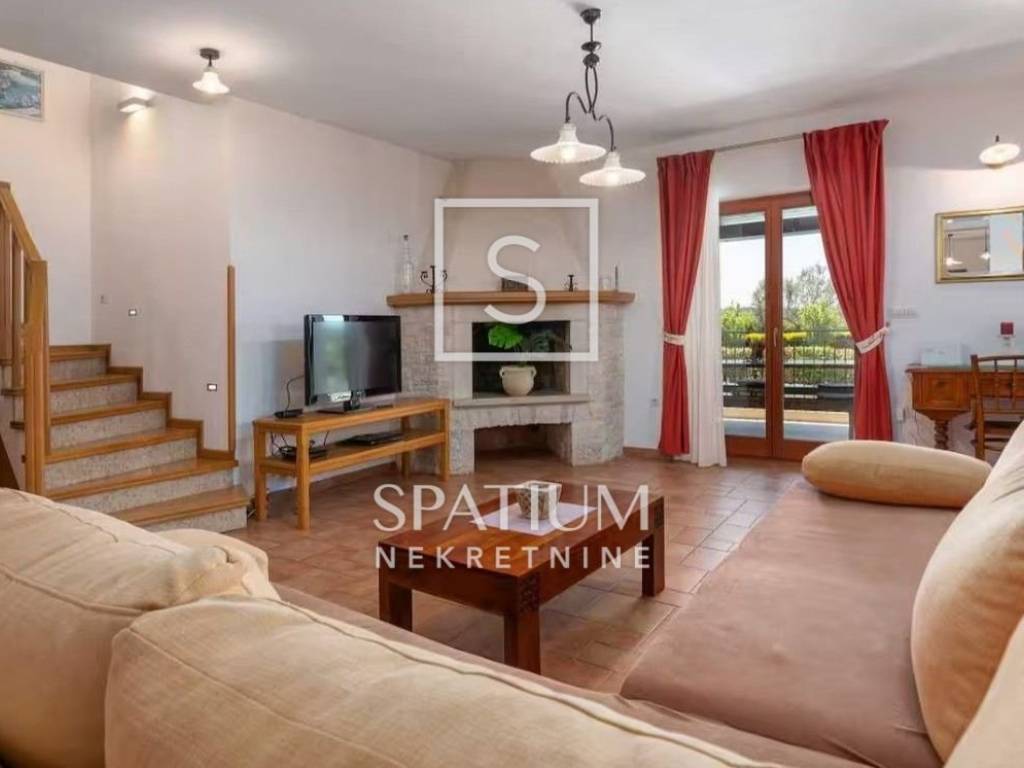 TINJAN, we offer a family house of 144 m², situated on a landscaped plot of 824 m² that provides complete privacy and tranquillity. The ground floor features a spacious kitchen with a dining area, a comfortable living room with a traditional fireplace, a guest toilet, a storage room, and a bedroom with its own bathroom. On the upper floor there are two generous bedrooms, each with its own bathroom, and from the hallway there is access to an uncovered terrace with a distant sea view. The house is equipped with gas underfloor heating, air conditioning and a fireplace for year-round comfort, while the beautiful garden offers a 25 m² pool, sunbathing area, outdoor shower and a covered terrace with a fireplace. The entire property is enclosed by walls and tall greenery, features electric courtyard gates, two parking spaces, and the house is sold fully furnished and ready to move into.