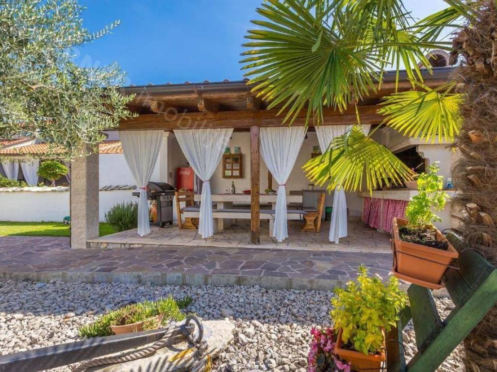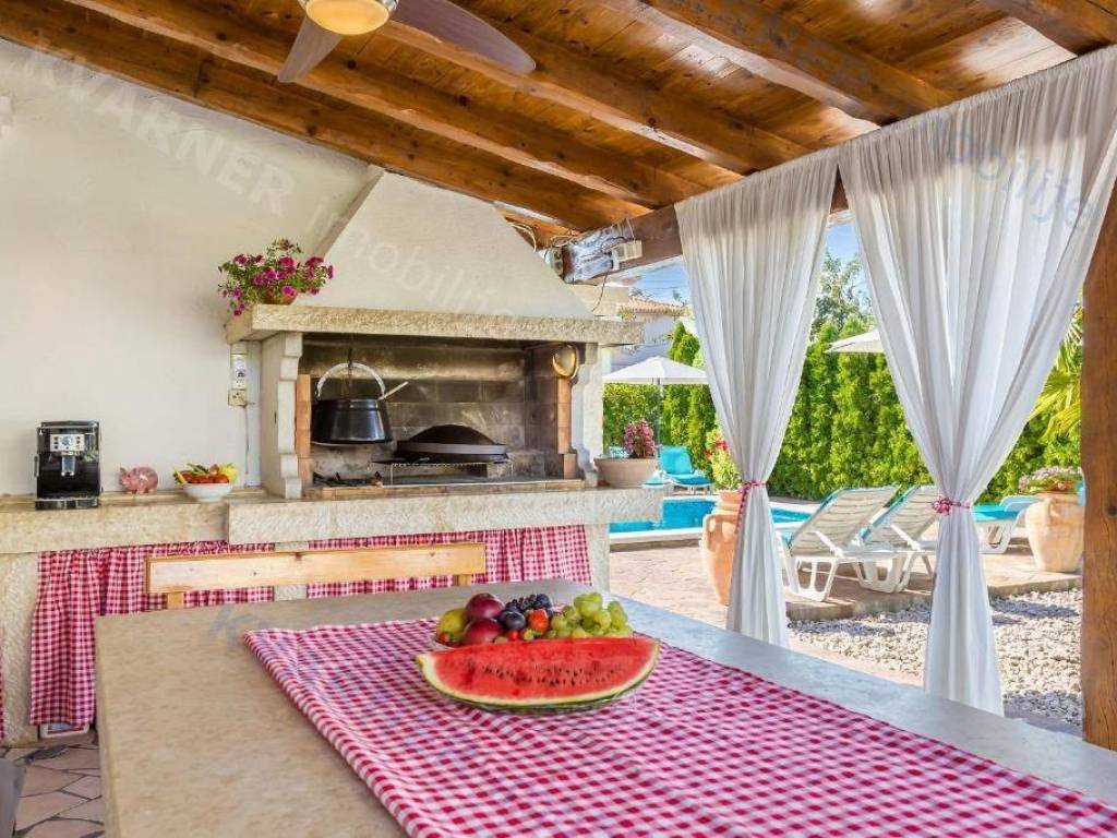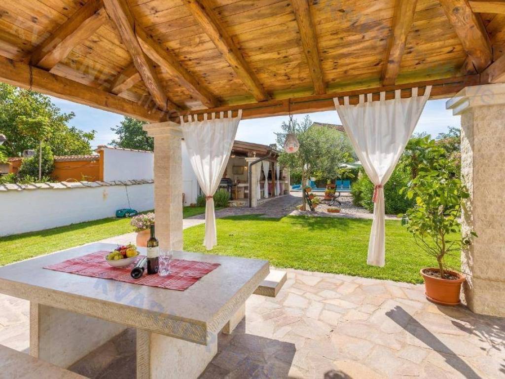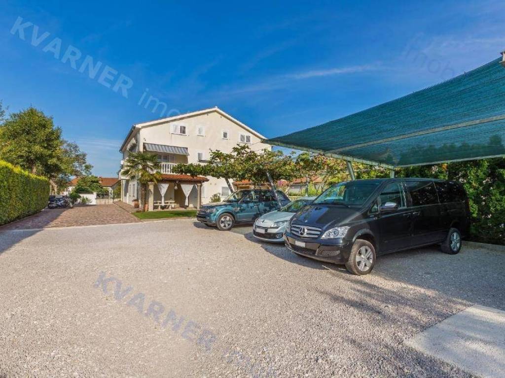 Next to the swimming pool and sunbathing area is a covered canopy, which is the main place for gathering and socializing. In the back part of the yard there is a covered parking lot for several cars as well as an additional parking space.