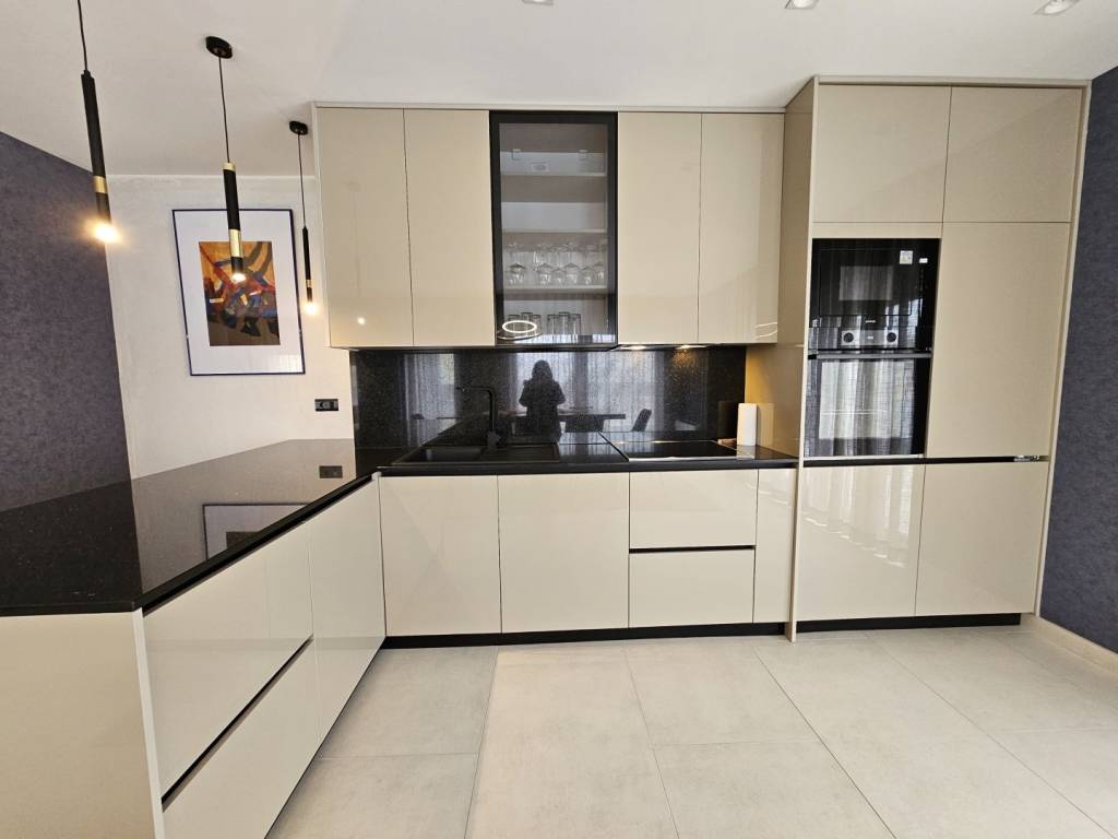 The house is spread over two floors. On the ground floor there is a hallway, toilet, storage room, living room, kitchen with dining room and living room in one open space. Large glass walls allow daylight throughout the day. On the first floor, there are three bedrooms, each with its own bathroom, and the main master bedroom has a covered terrace.