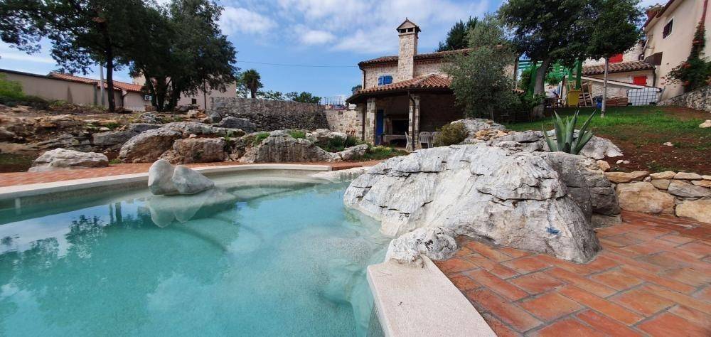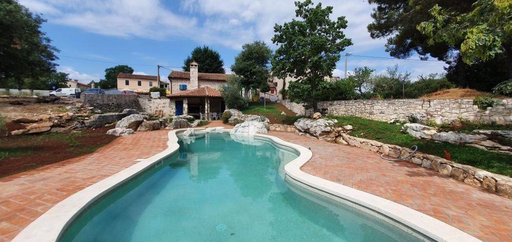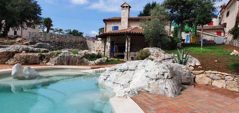 We present to you this beautiful stone house with a swimming pool and a large garden area of 233 m2. In the basement there is a covered terrace of 35 m2, a bathroom and a storage room. Total 11.68 m2 without terrace. The ground floor also consists of a covered terrace of the same area, a sauna, a tavern with a fireplace, a kitchen, a living room and a toilet. Total 69.16 m2 of living space without terrace. The stairs lead to the first floor where there are two bedrooms, a bathroom and a balcony. There is a beautiful swimming pool, a summer kitchen and an auxiliary building on the spacious garden of 2300 m2. The auxiliary building in the basement has an apartment in a high renovation phase and a boiler room, while on the ground floor there is a garage with two parking spaces that can be arranged as desired. Then there is another bathroom and a prepared installation for the apartment in the basement. The house is connected to the septic tank and offers the possibility of central heating with gas, wood or air conditioning. There are two parking spaces in the garage and a parking lot next to the house.