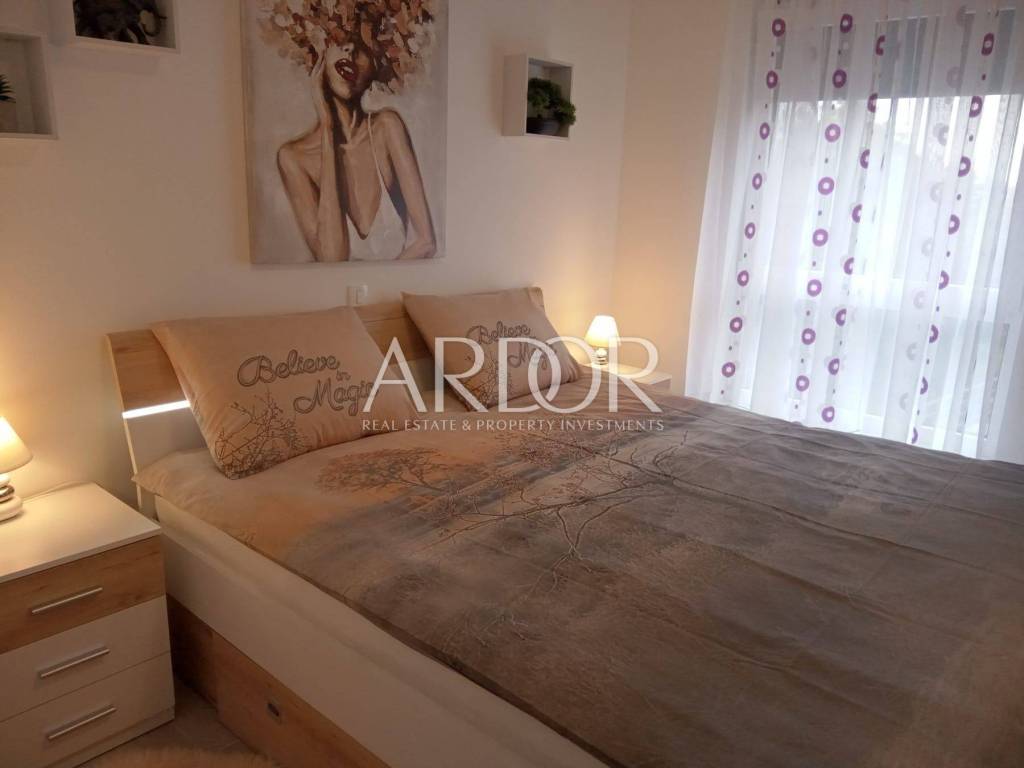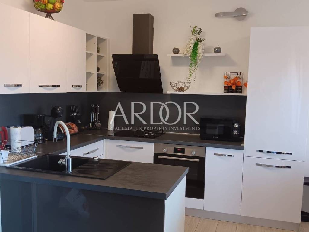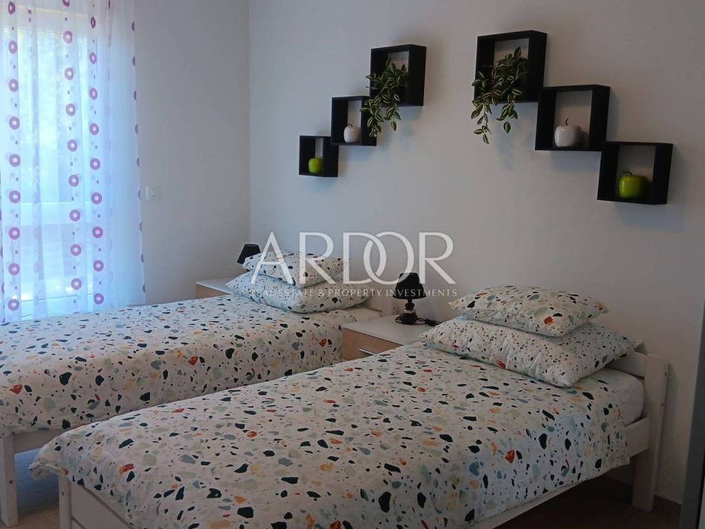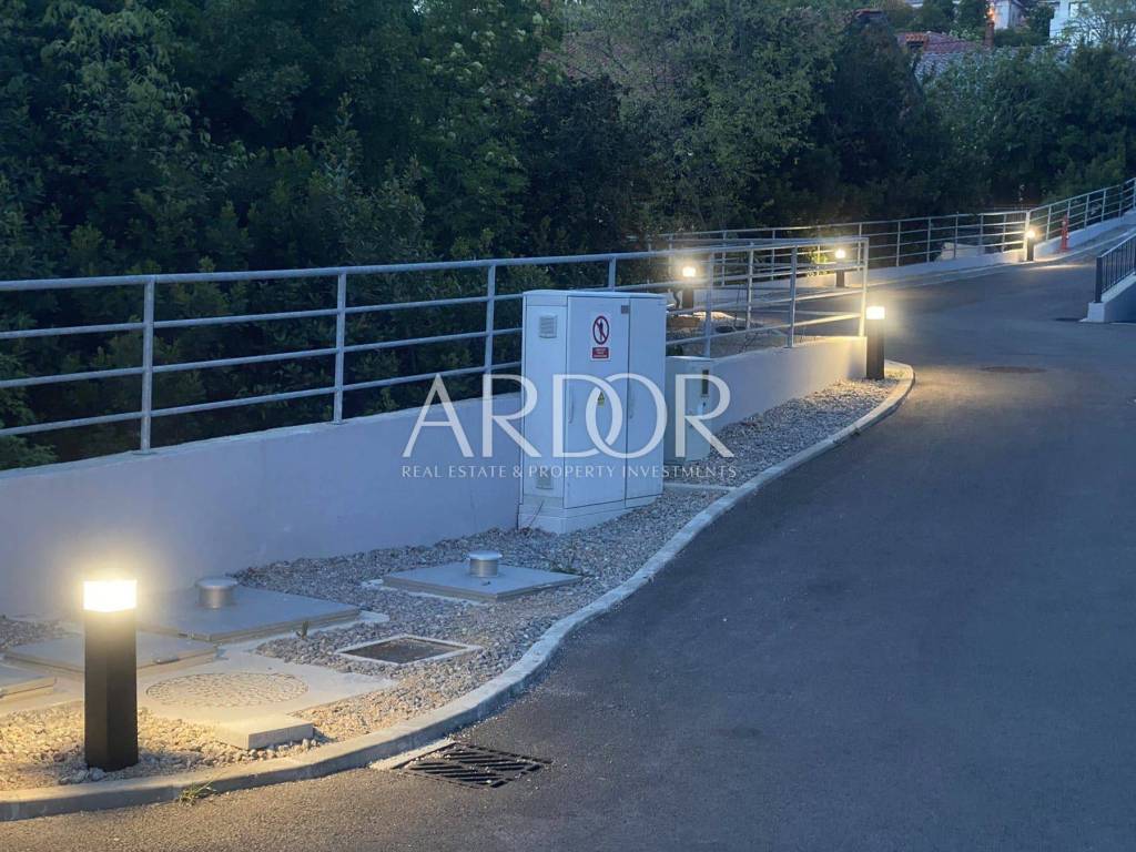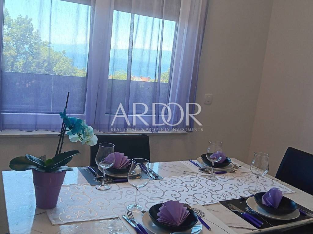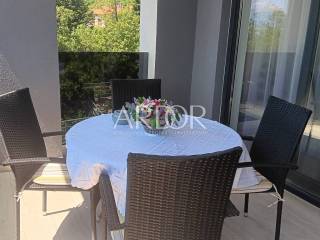 We mediate the rental of a luxuriously furnished apartment in Kostrena of 85 m2. It is located on the first of the three floors of the building. The apartment consists of two bedrooms, a nicely decorated kitchen, a living room, a dining room, a toilet and a bathroom. The apartment has underfloor heating and inverter air conditioning for cooling and heating, and there is a water heater in the bathroom and toilet. The terrace is 20 m2 and offers a beautiful view of the sea and the islands. The building has an elevator and a common gym that all tenants can use, and the apartment has two private parking spaces. It is close to the sea and all other facilities such as shops, post office, kindergarten, school, public transport, parks and playgrounds.