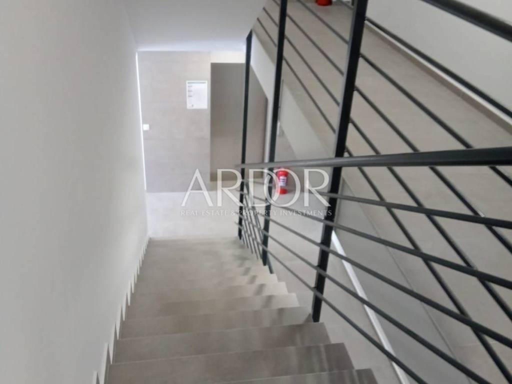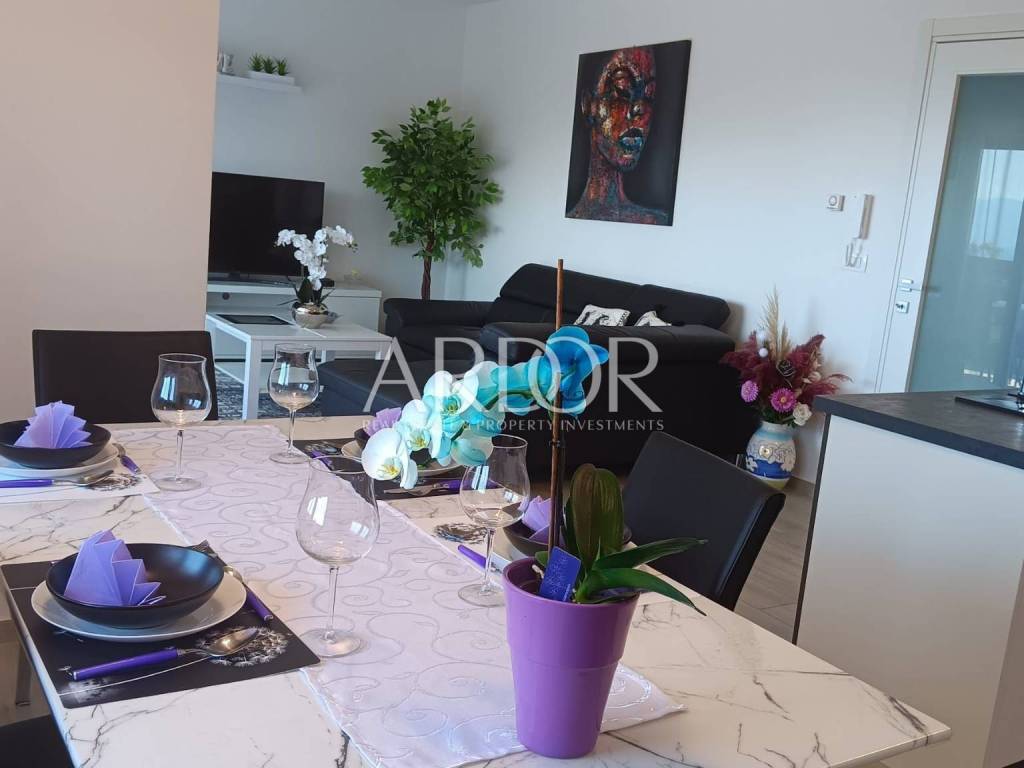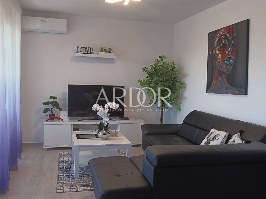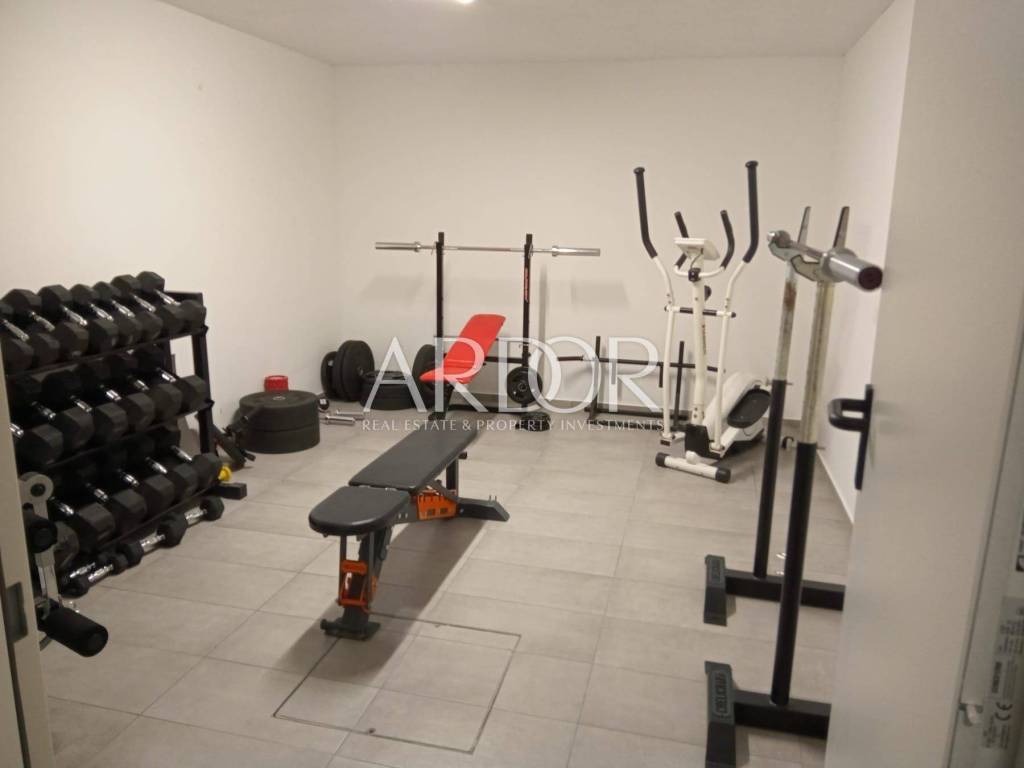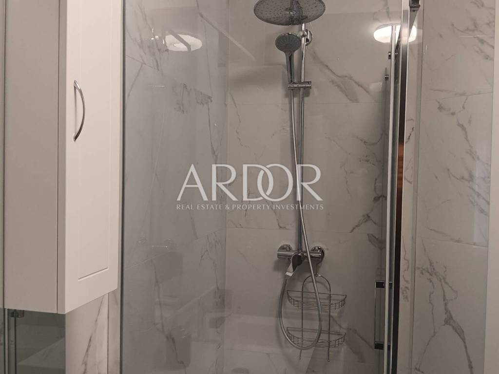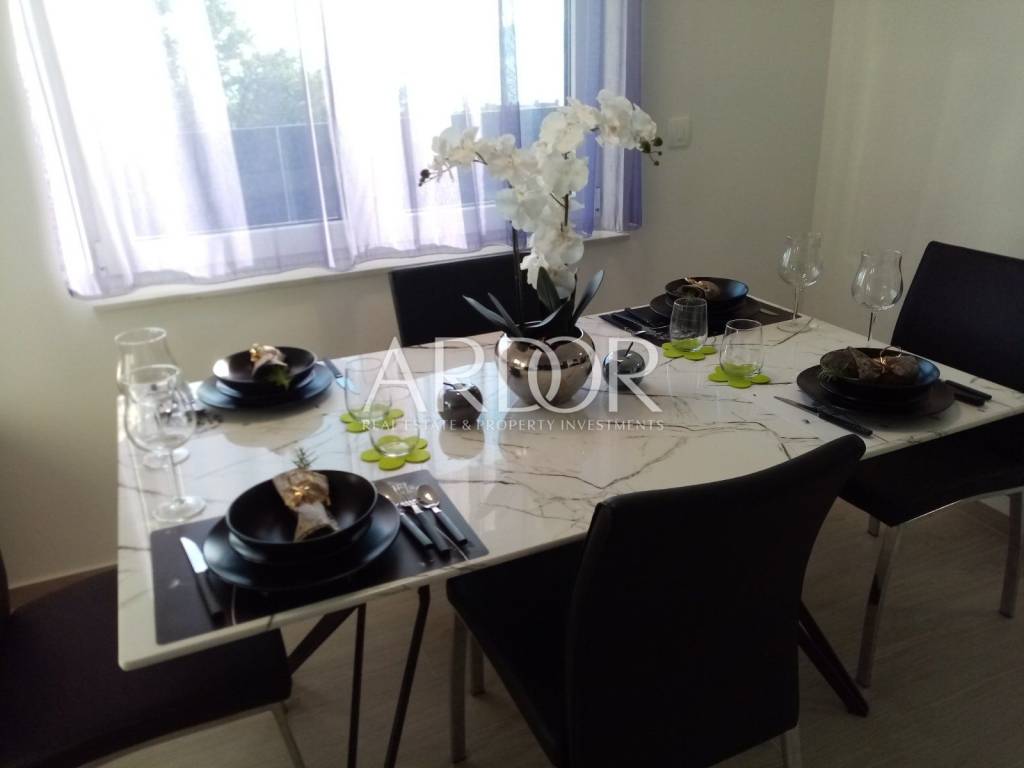 We mediate the rental of a luxuriously furnished apartment in Kostrena of 85 m2. It is located on the first of the three floors of the building. The apartment consists of two bedrooms, a nicely decorated kitchen, a living room, a dining room, a toilet and a bathroom. The apartment has underfloor heating and inverter air conditioning for cooling and heating, and there is a water heater in the bathroom and toilet. The terrace is 20 m2 and offers a beautiful view of the sea and the islands. The building has an elevator and a common gym that all tenants can use, and the apartment has two private parking spaces. It is close to the sea and all other facilities such as shops, post office, kindergarten, school, public transport, parks and playgrounds.