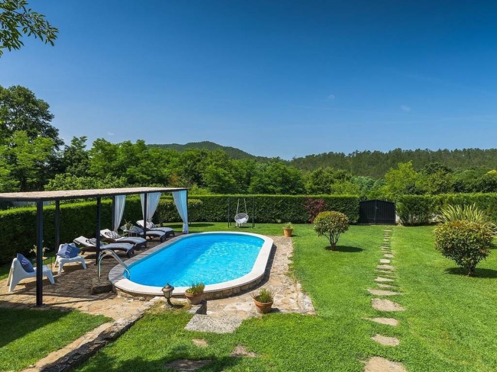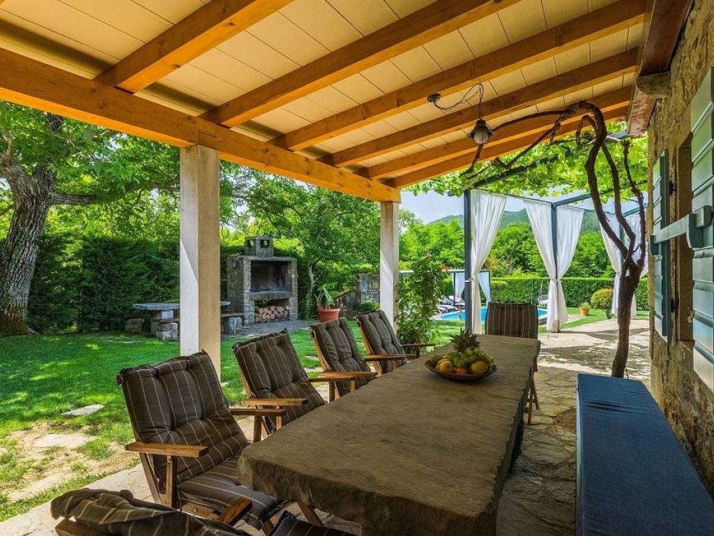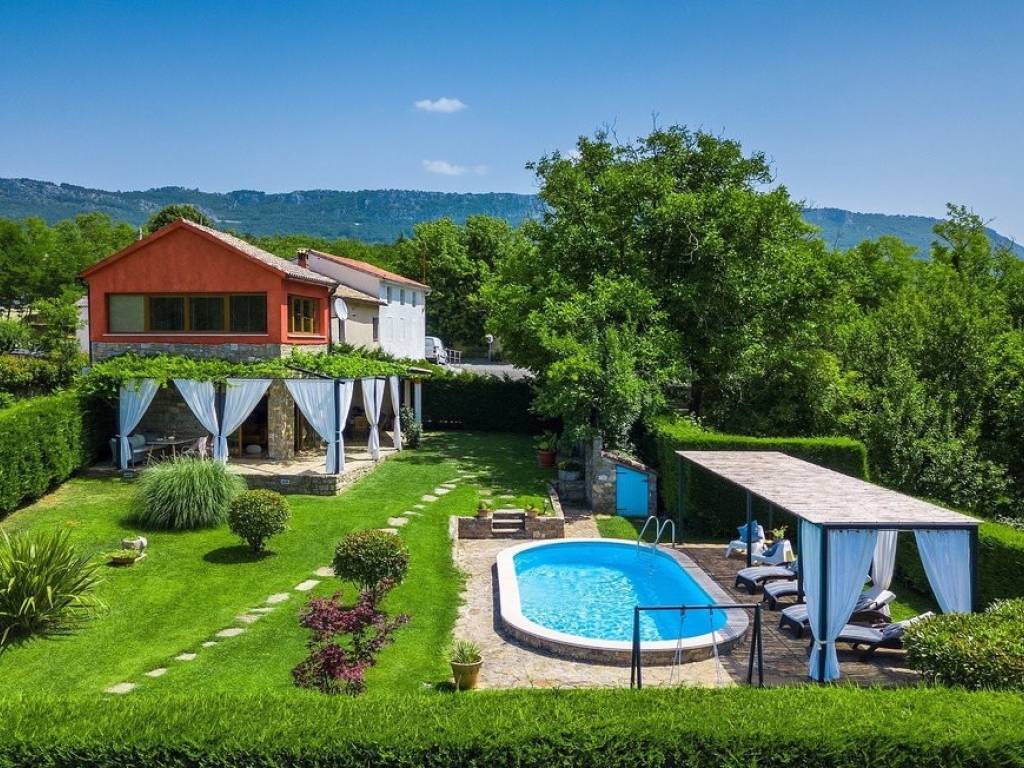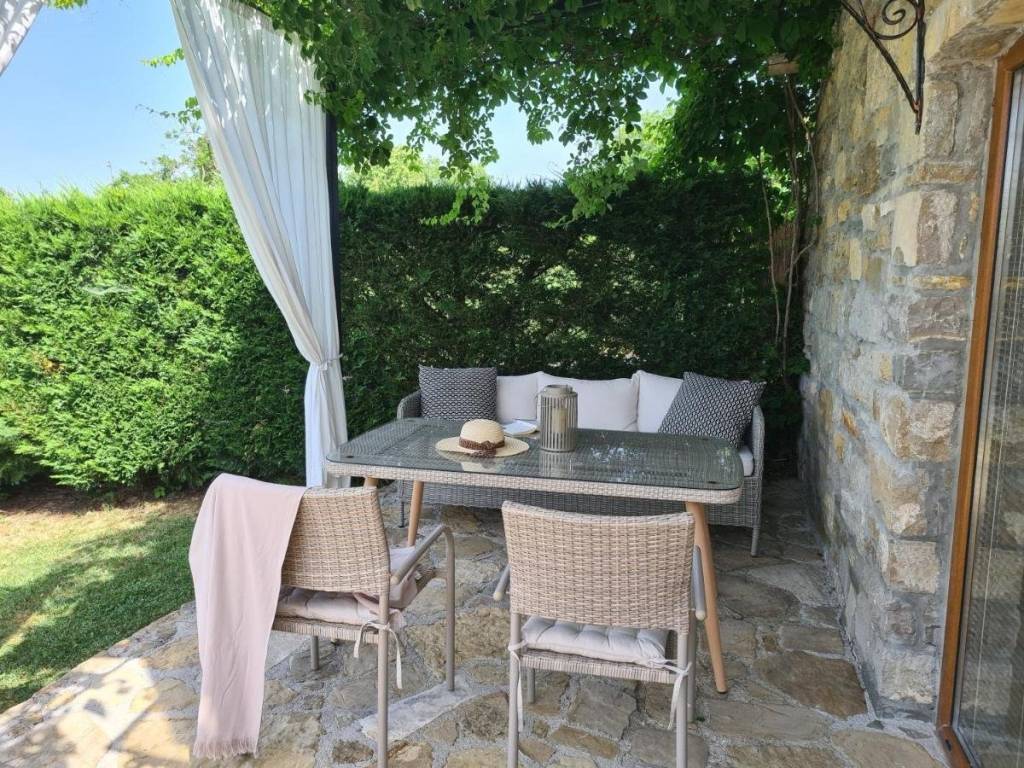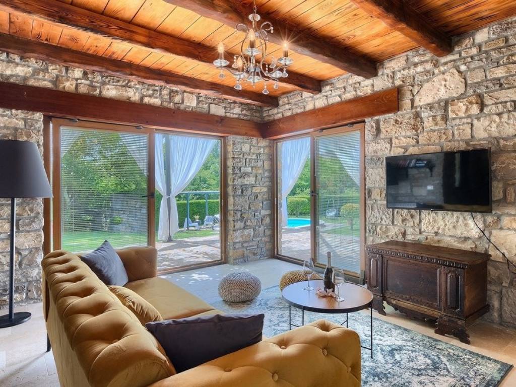 This beautiful stone semi-detached house is located in the vicinity of Buzet in central Istria, surrounded by beautiful nature. The house has an area of 116 m2, was renovated in 2015 and was renovated while maintaining the rustic style that fully suits this type of property. The ground floor consists of a kitchen, dining room and living room with a beautiful fireplace. Internal stairs lead to the first floor of the house where there are two bedrooms, both with their own bathrooms. The special feature of this house is certainly the large landscaped garden area of 1,070 m2, where there is a 24 m2 swimming pool and a landscaped garden with a barbecue. The house is in a long-term and well-established lease. More on request.