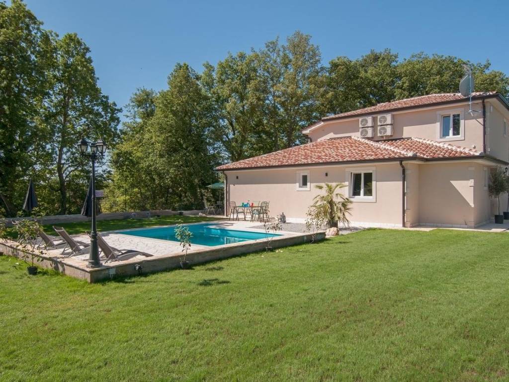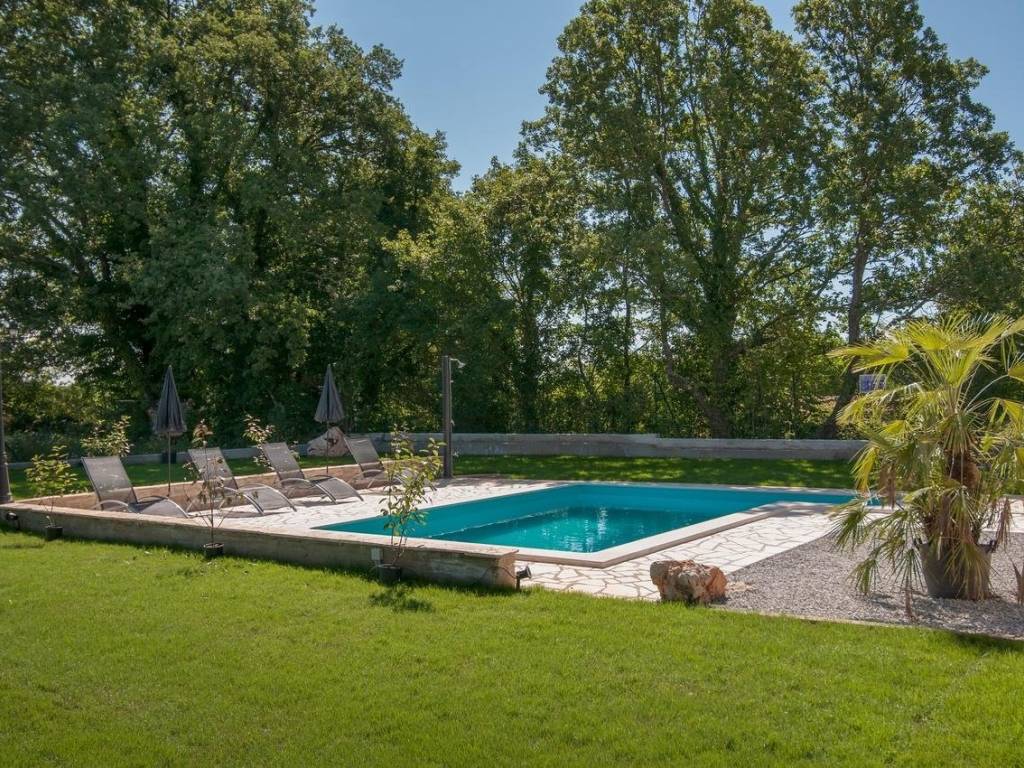 In the vicinity of Tinjan, in a quiet location surrounded by greenery, this beautiful holiday home with a swimming pool is for sale. On the ground floor there is a kitchen, dining room, living room with access to a covered terrace, 2 bedrooms, 2 bathrooms and 1 guest toilet. The stairs lead to the first floor of the house, where there are 2 additional bedrooms, a bathroom and a terrace. A 22 m2 swimming pool with a sunbathing area is located in the beautiful and well-kept garden. The house has a well-established rental business. The owner of the property is a legal entity. More on request.