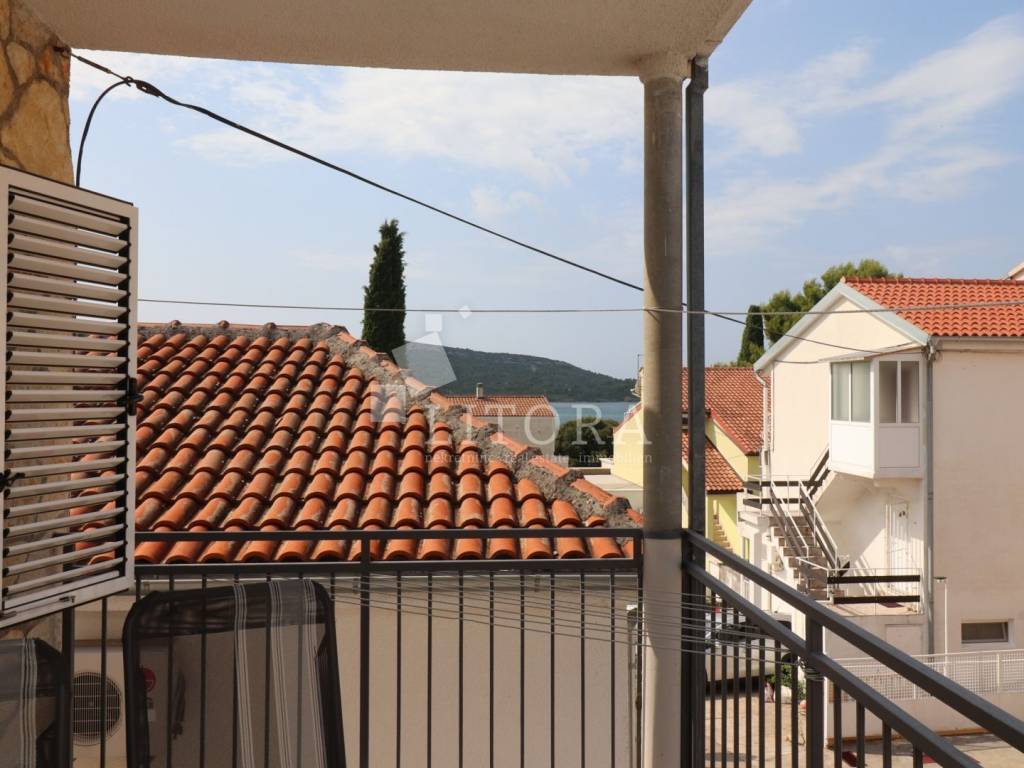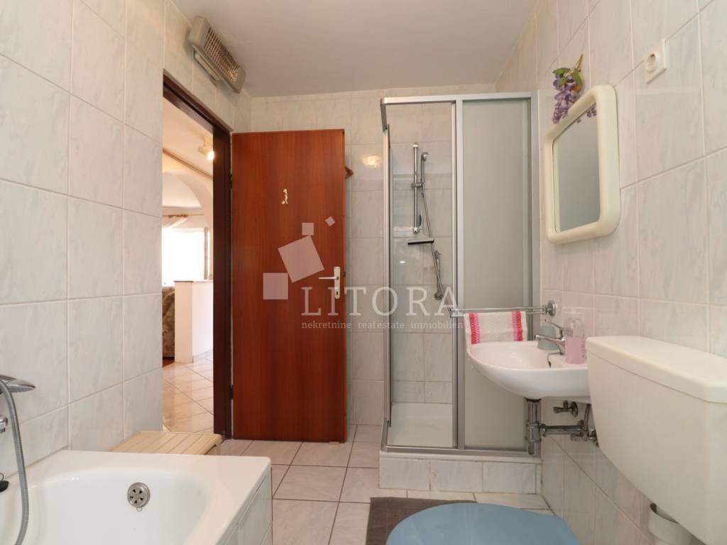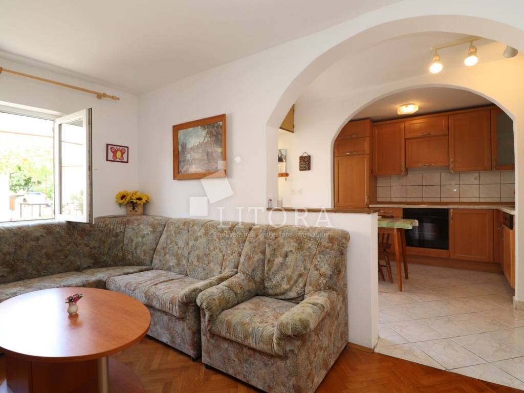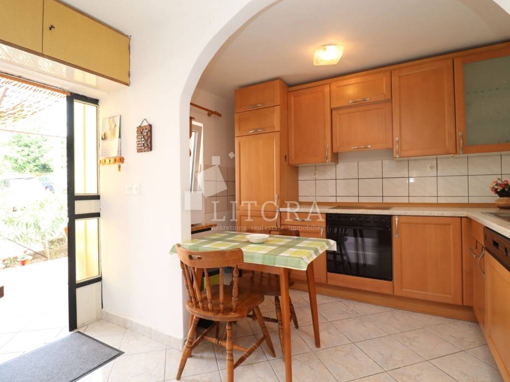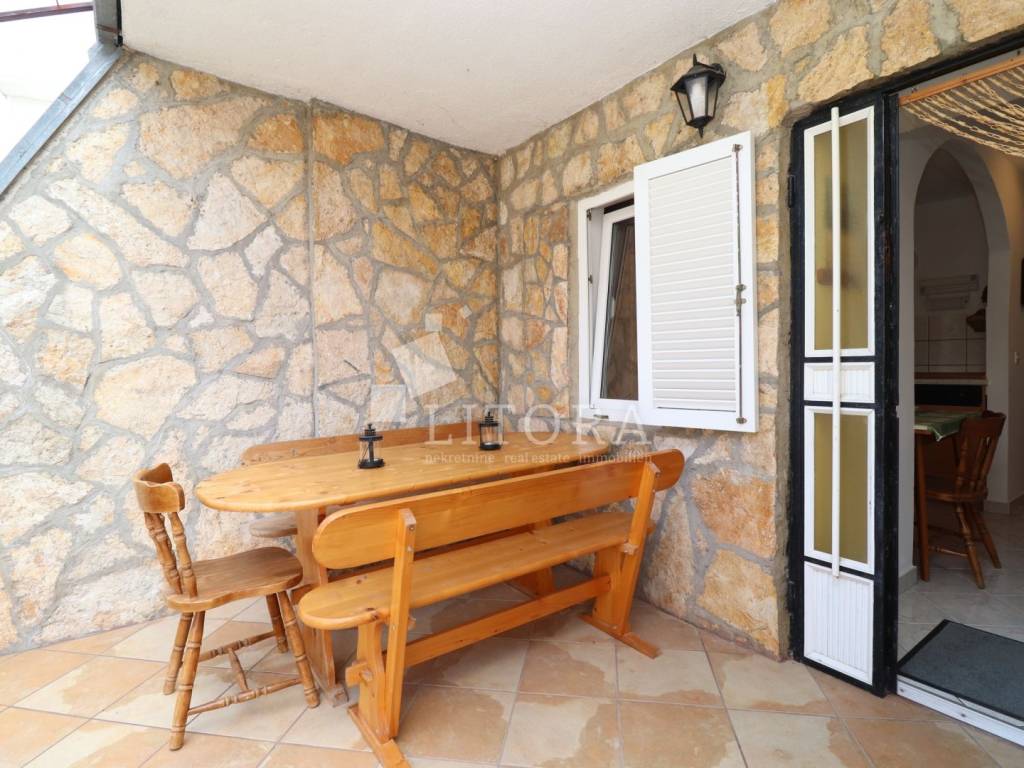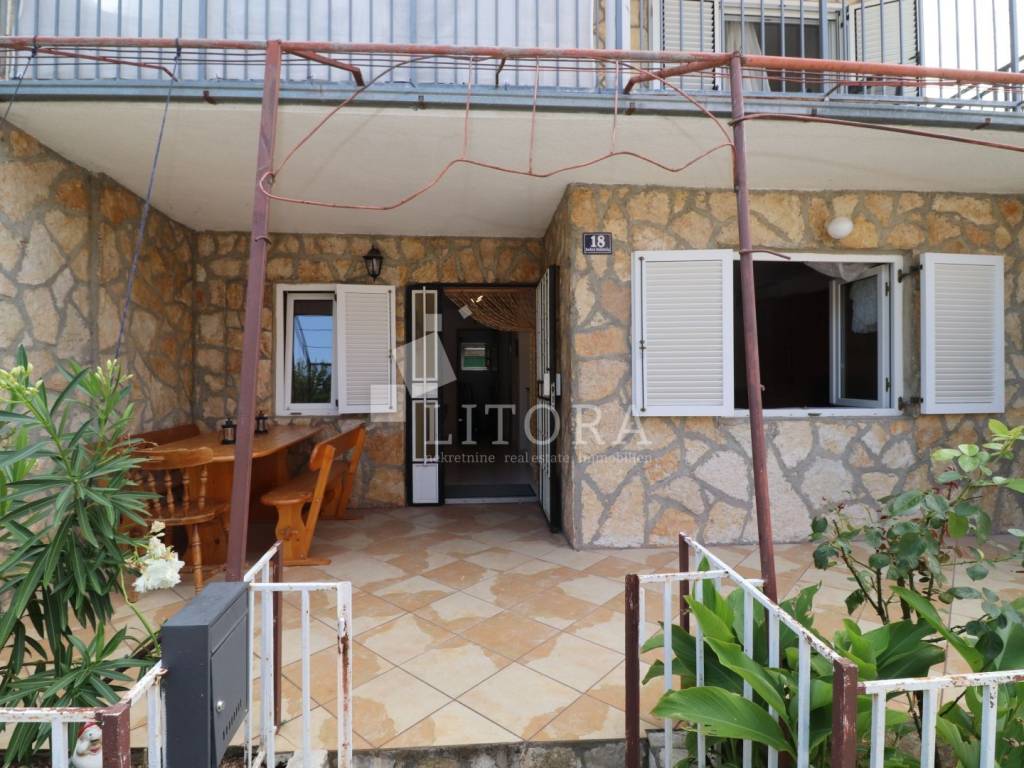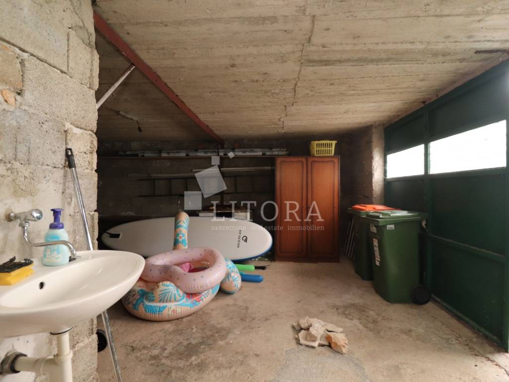 Family house on two floors with two residential units and a garage, with a total usable area of 128.38 m². The house was built in 1970 and renovated in 2000, including a refurbished façade. The property consists of two separate apartments and an additional courtyard annex/garage. Ground floor: covered terrace, entrance, bedroom, hallway, living room with kitchen, bathroom. First floor: external staircase leading to two bedrooms, hallway, bathroom, kitchen with dining area and living room, and access to a covered terrace offering a sea view. The house is detached and built on a plot of 160 m². It includes one parking space and a garage of 25.02 m².