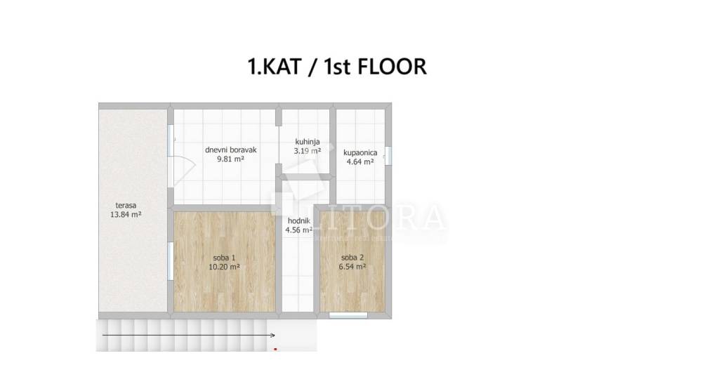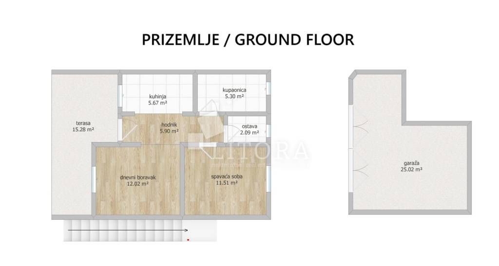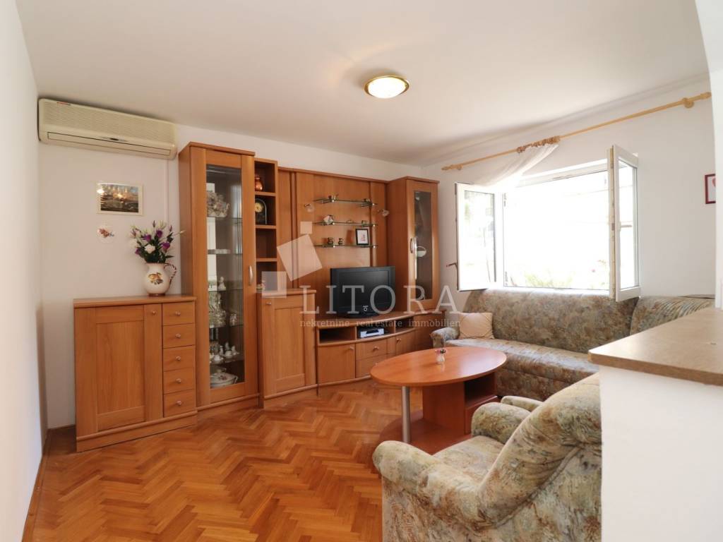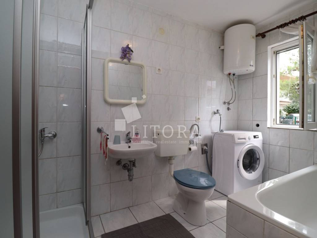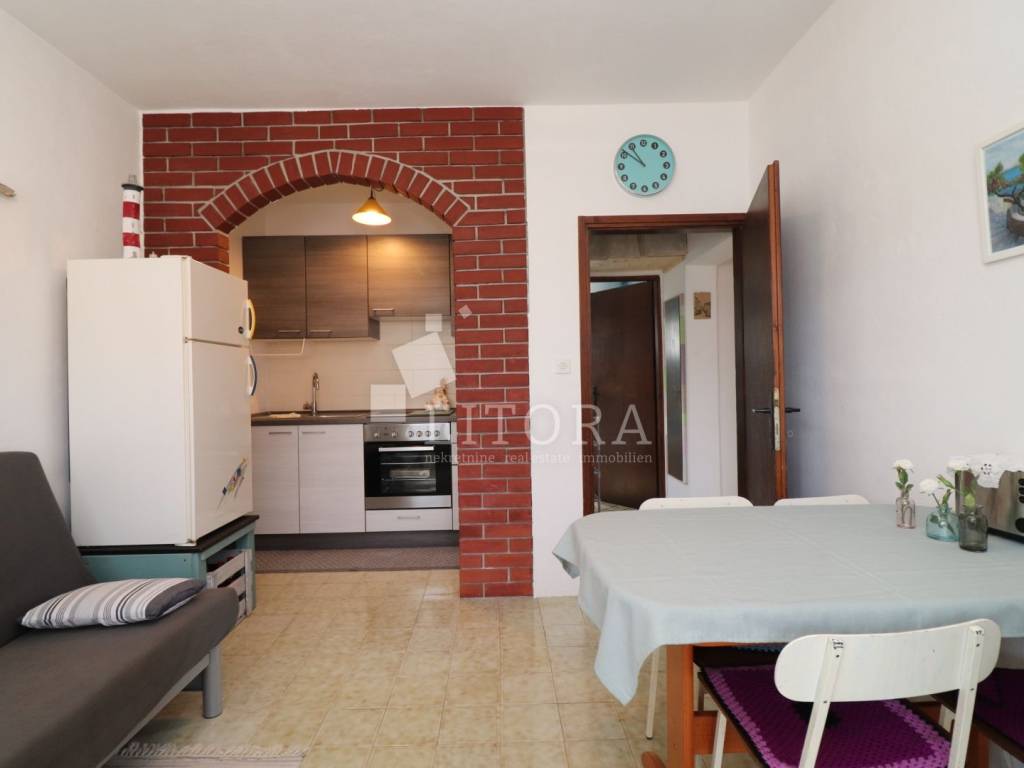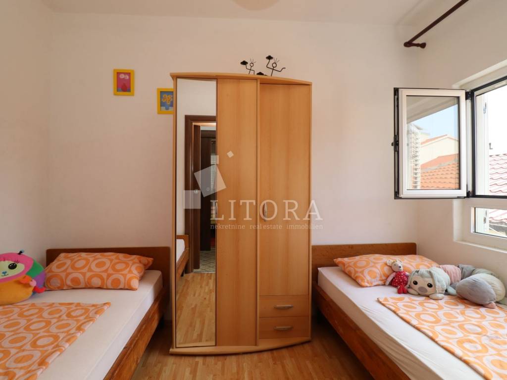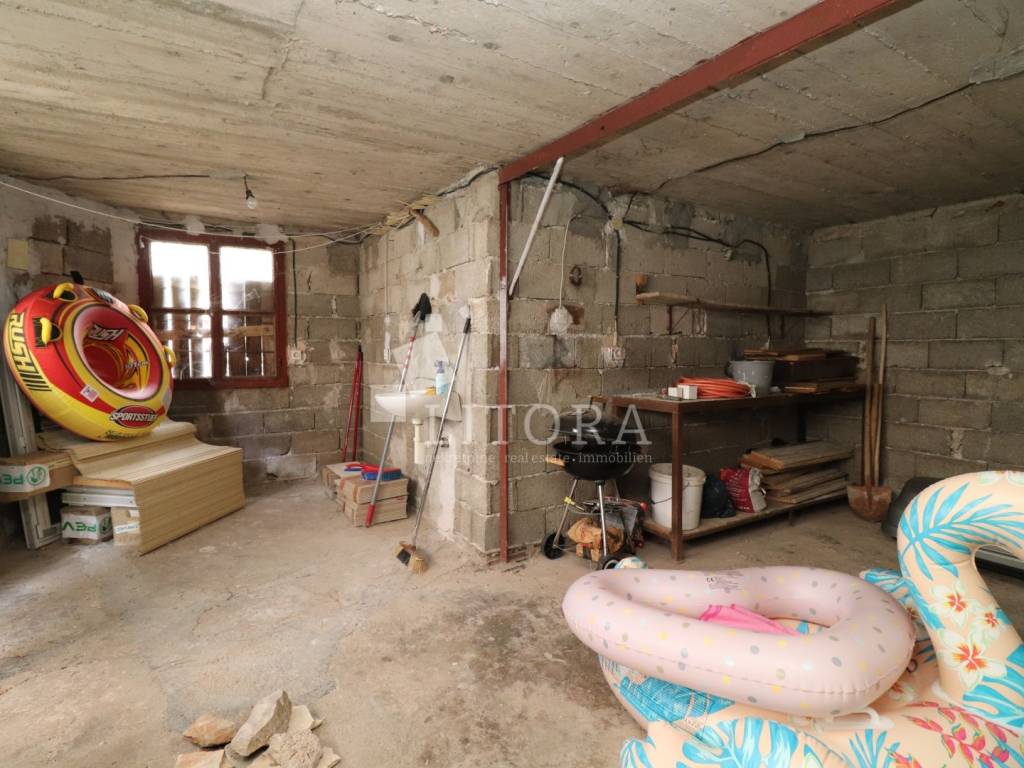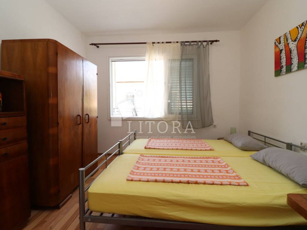 Family house on two floors with two residential units and a garage, with a total usable area of 128.38 m². The house was built in 1970 and renovated in 2000, including a refurbished façade. The property consists of two separate apartments and an additional courtyard annex/garage. Ground floor: covered terrace, entrance, bedroom, hallway, living room with kitchen, bathroom. First floor: external staircase leading to two bedrooms, hallway, bathroom, kitchen with dining area and living room, and access to a covered terrace offering a sea view. The house is detached and built on a plot of 160 m². It includes one parking space and a garage of 25.02 m².