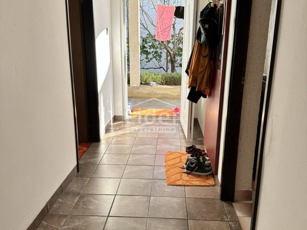 On the ground floor of the house, there is a 60 m² apartment with two bedrooms, a living room with a kitchen and pantry, a bathroom, and a hallway. A storage room is located under the stairs. In front of it is a large covered terrace of approximately 30 m².