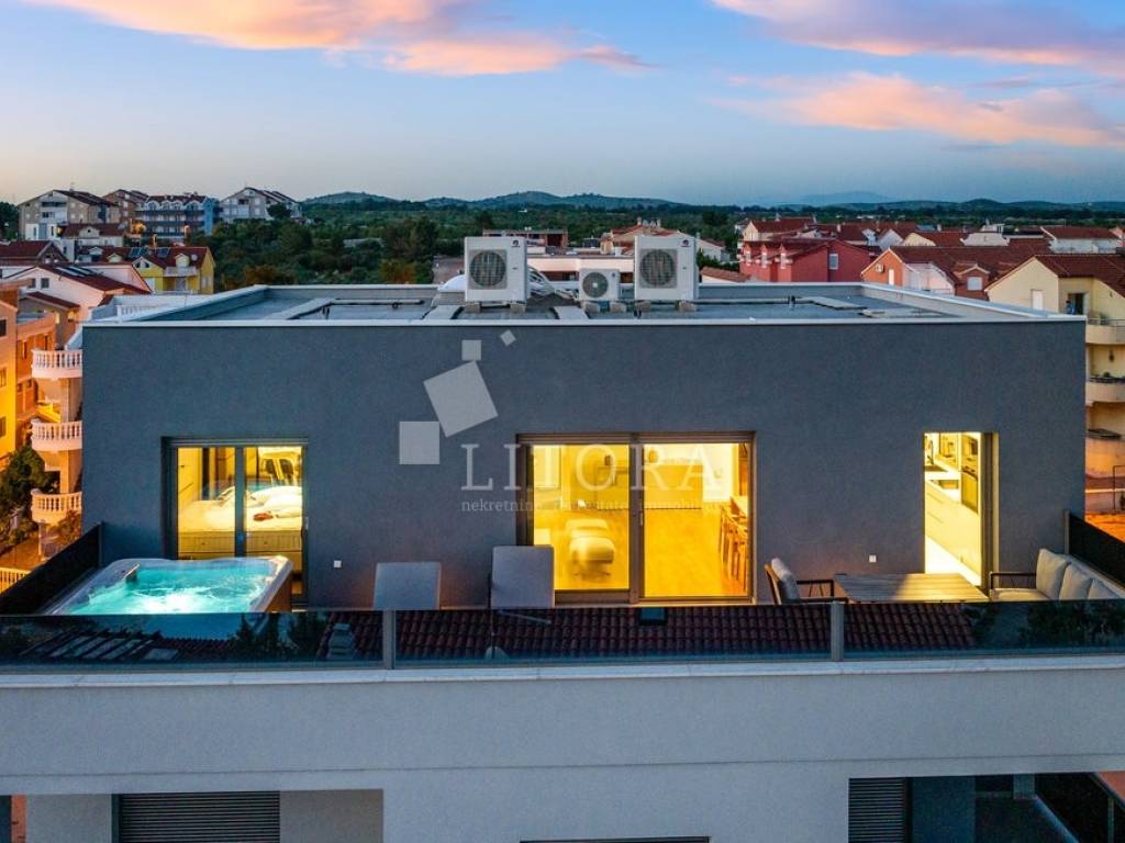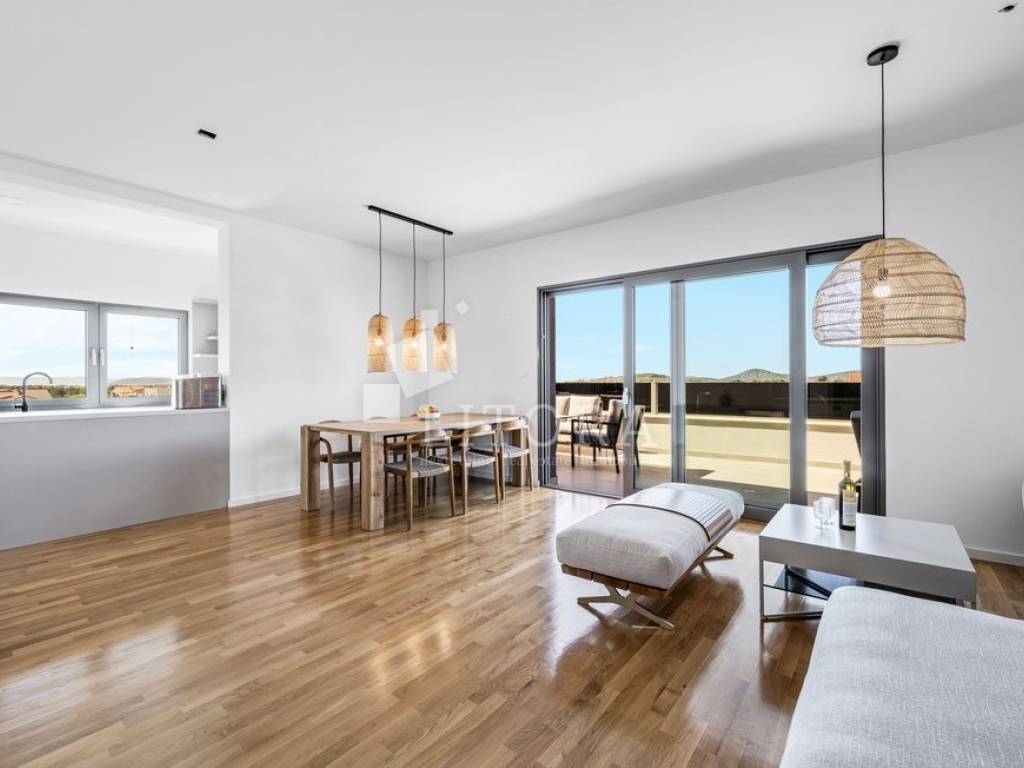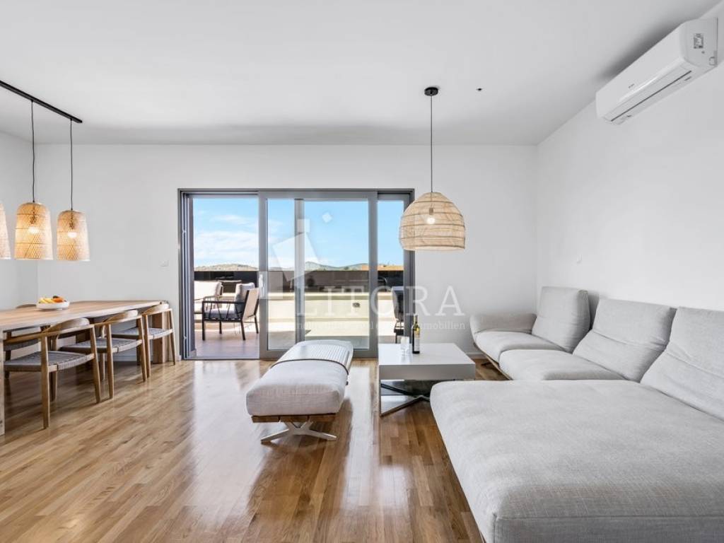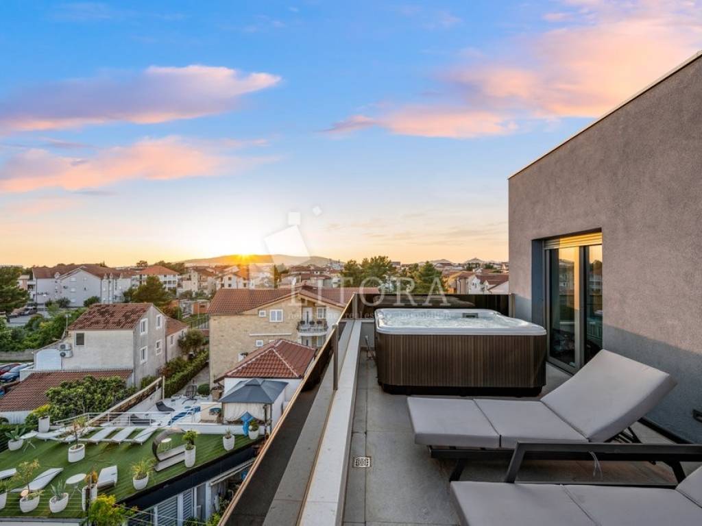 Vodice – modernly furnished penthouse with sea view and jacuzzi, near Hangar Beach. Located in a quiet area of Vodice, close to the popular Hangar Beach, this newly built penthouse occupies the entire top floor (3rd floor) of a small residential building. The apartment offers a total living area of 80 m² and features a contemporary layout with plenty of natural light. It consists of an entrance hall, a bathroom, a spacious living room with kitchen and dining area, and three bedrooms – each with access to its own terrace. The living room and kitchen open onto a large south-facing terrace of 30 m² with a jacuzzi and a beautiful sea view – an ideal place to relax and enjoy the Mediterranean atmosphere. The apartment is fully furnished, and all furniture is included in the selling price. It comes with one parking space in the courtyard and a storage room on the ground floor. The building is excellently located – only 700 m from Hangar Beach and 1,700 m from the town centre. This penthouse combines comfort, a peaceful setting, and modern design – a perfect choice for a holiday home or permanent residence.