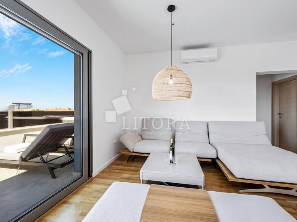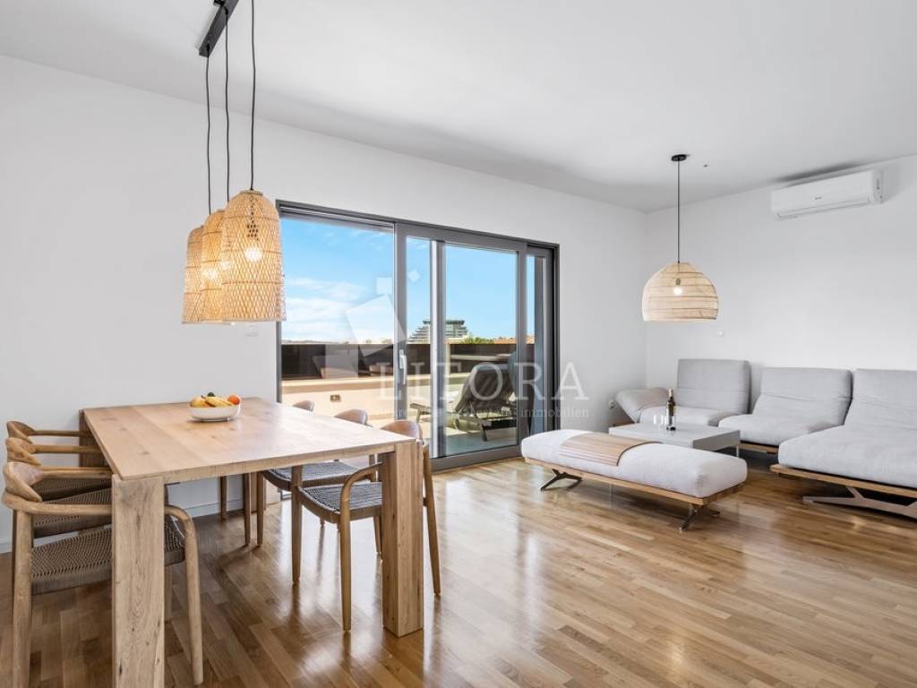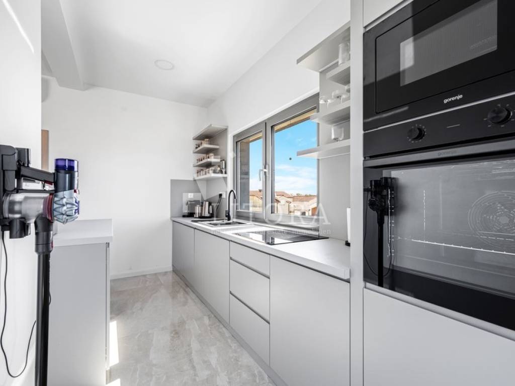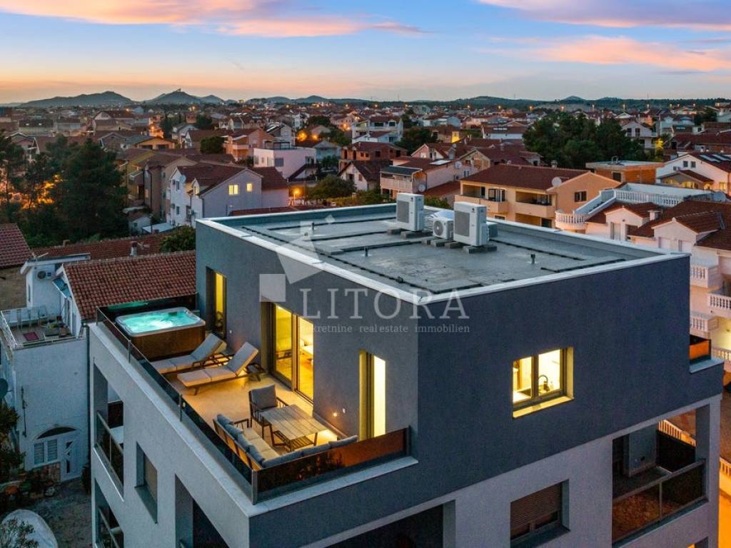 Vodice – modernly furnished penthouse with sea view and jacuzzi, near Hangar Beach. Located in a quiet area of Vodice, close to the popular Hangar Beach, this newly built penthouse occupies the entire top floor (3rd floor) of a small residential building. The apartment offers a total living area of 80 m² and features a contemporary layout with plenty of natural light. It consists of an entrance hall, a bathroom, a spacious living room with kitchen and dining area, and three bedrooms – each with access to its own terrace. The living room and kitchen open onto a large south-facing terrace of 30 m² with a jacuzzi and a beautiful sea view – an ideal place to relax and enjoy the Mediterranean atmosphere. The apartment is fully furnished, and all furniture is included in the selling price. It comes with one parking space in the courtyard and a storage room on the ground floor. The building is excellently located – only 700 m from Hangar Beach and 1,700 m from the town centre. This penthouse combines comfort, a peaceful setting, and modern design – a perfect choice for a holiday home or permanent residence.