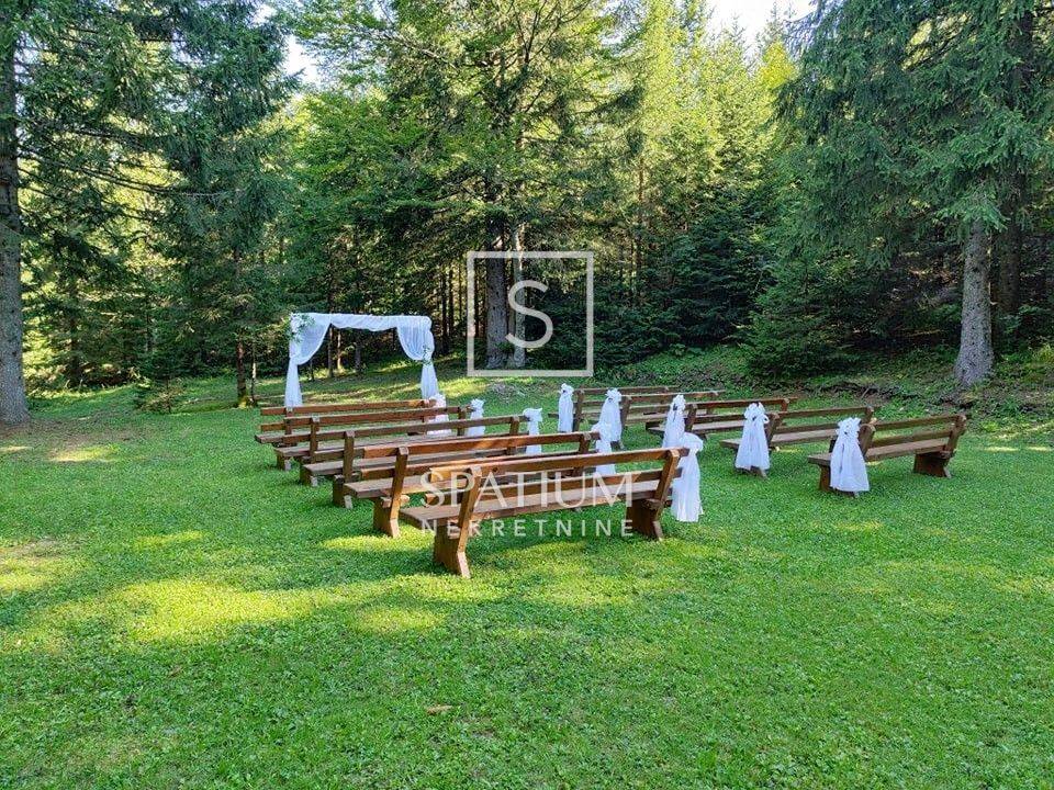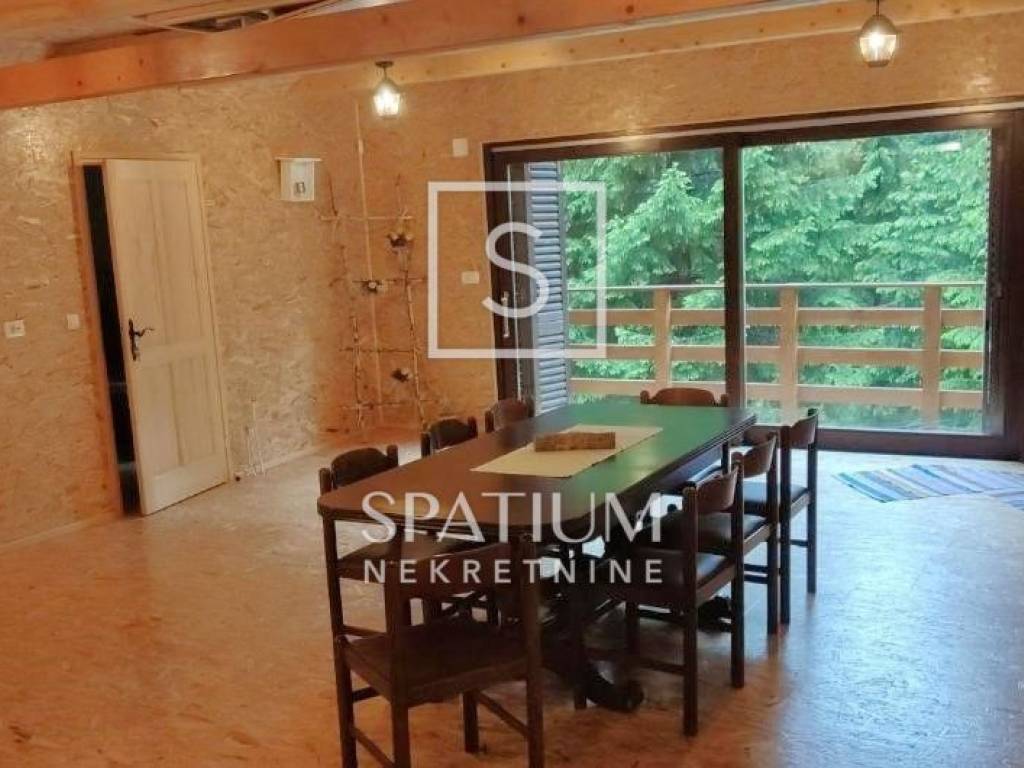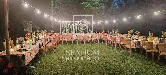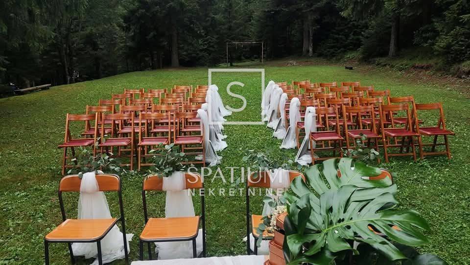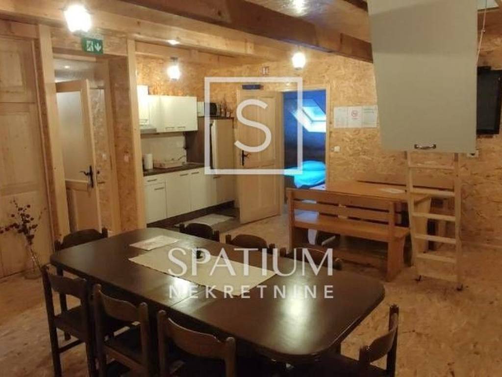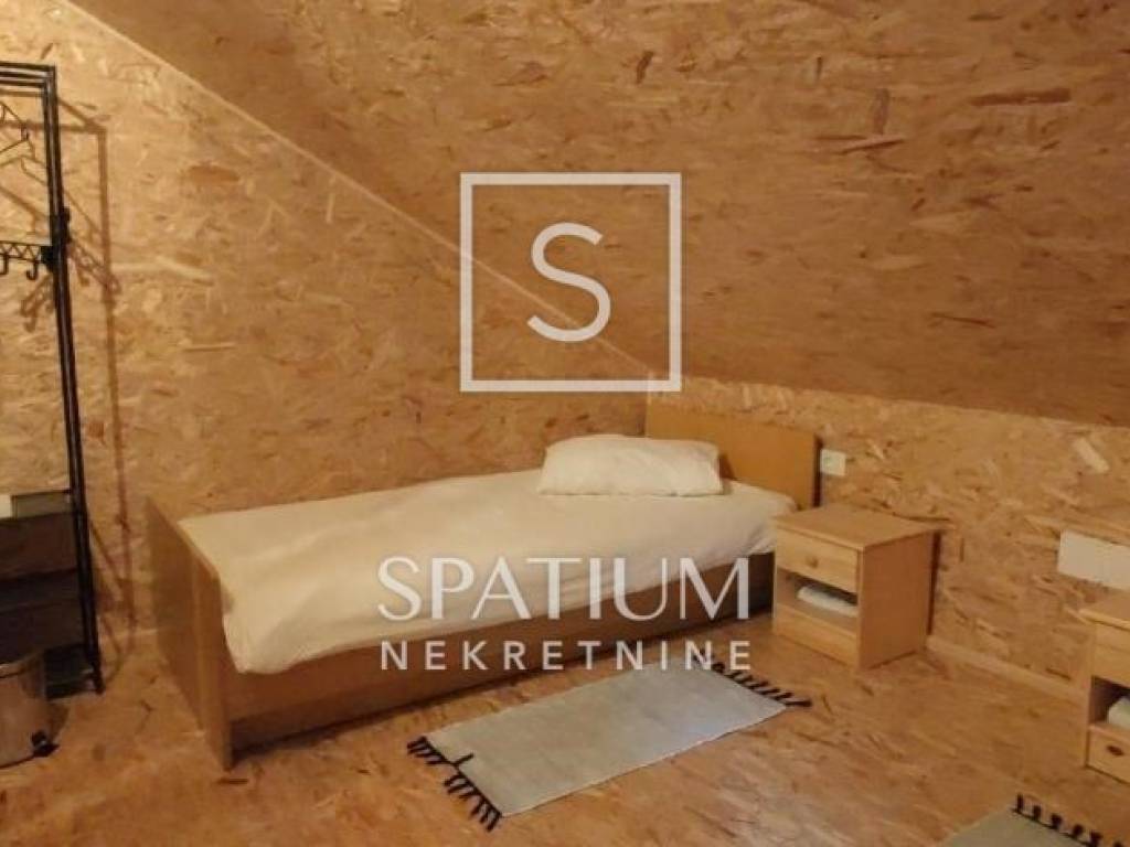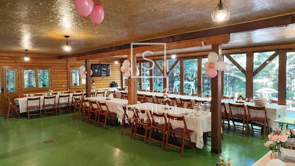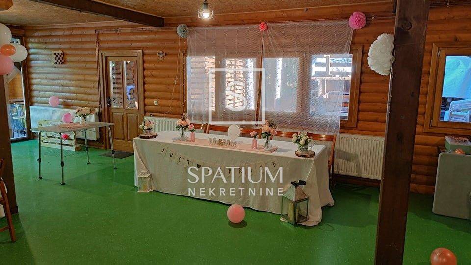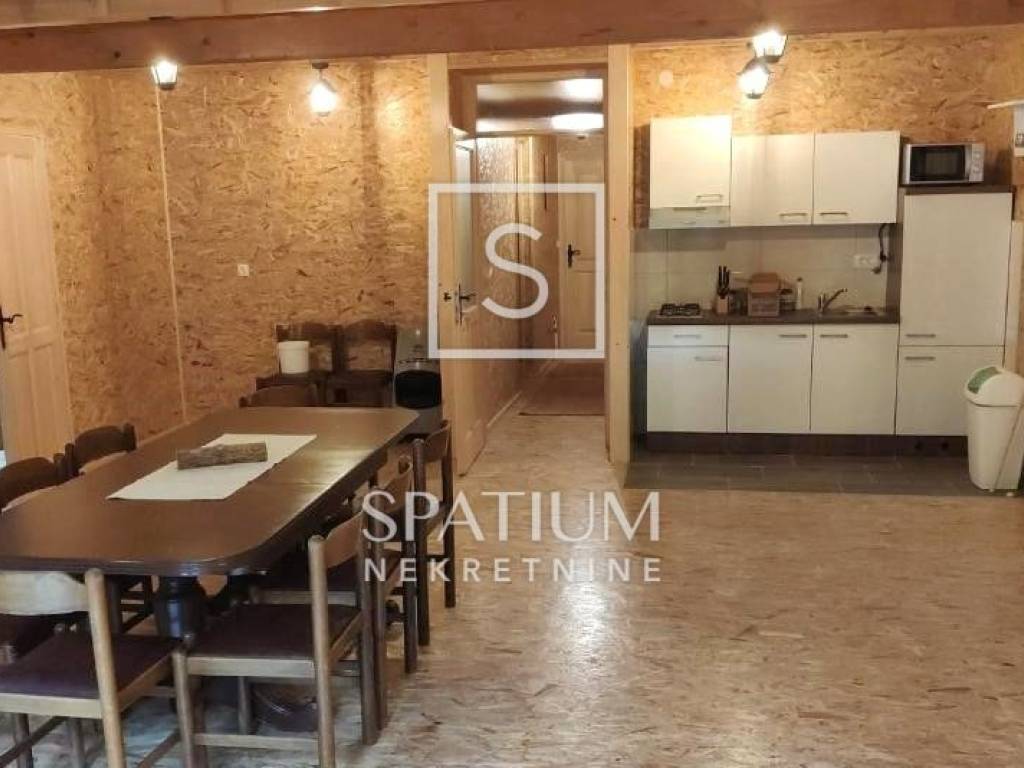 RAVNA GORA, we have received an indigenous wooden house for sale that serves as a weekend house in the forest, with a floor area of 144 m2. It consists of a ground floor and an upper floor. On the ground floor there is a large terrace, a social room, a kitchen, a woodshed. On the first floor there is a hallway, a large living room with a kitchen, six bedrooms, two bathrooms, and two toilets, on the first floor there is a spacious balcony. The building is heated by central heating, wood or pellets. It contains a boiler room with a new power generator, a heat pump and an alarm system. The garden area is 10,784 m2 and is surrounded by forest, on the land there is a small football pitch and a bowling alley, the house is suitable for rental for larger groups and weddings.