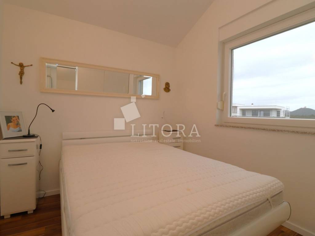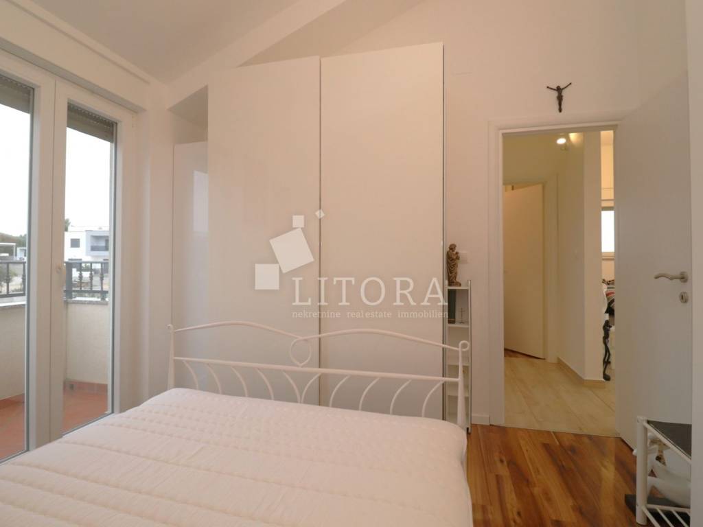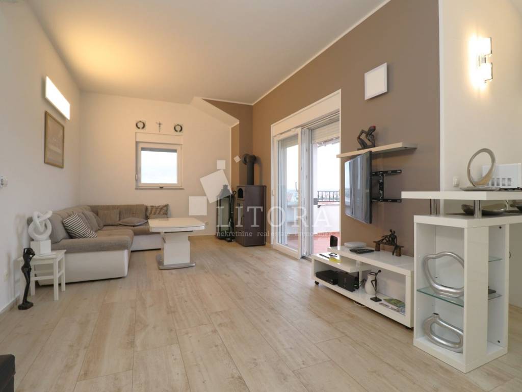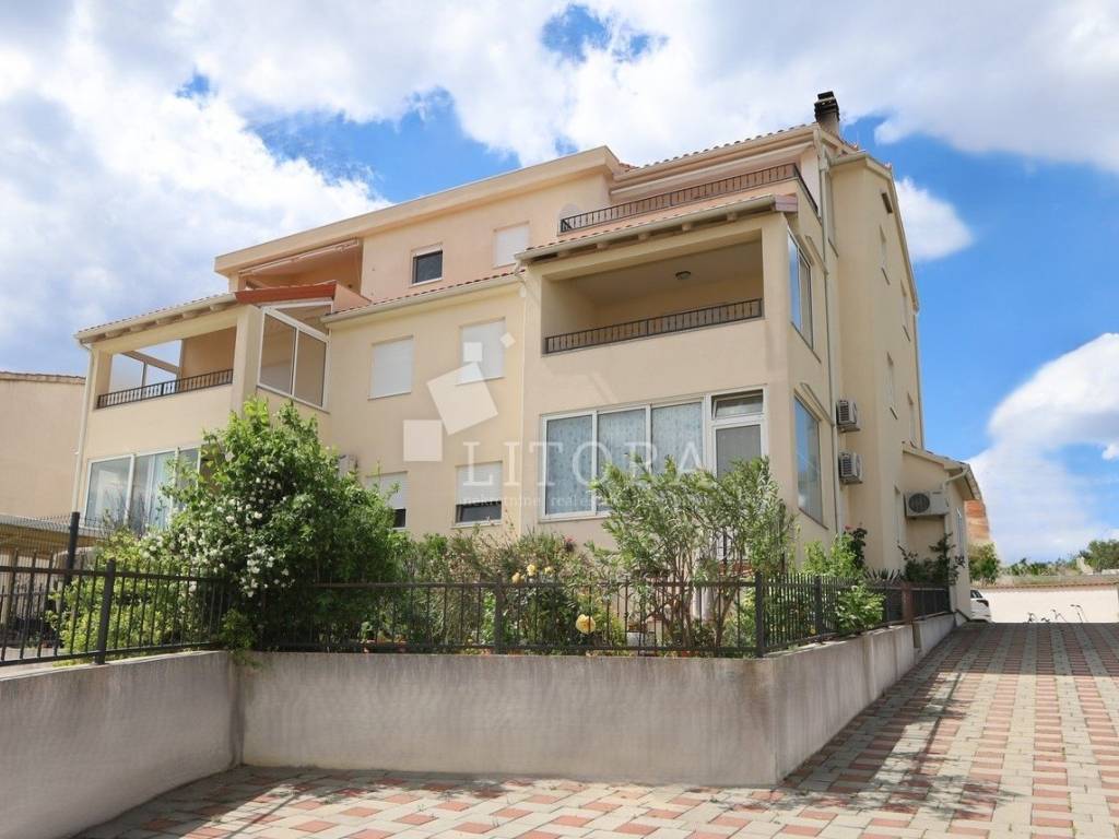 Vodice, a fully furnished and comfortable two-bedroom apartment with a beautiful sea view. It is located on the 2nd floor of a residential building, 1,500 meters from the beach and 1,100 meters from the town center. The apartment is south-facing and has 67.76 m² of usable living space. It consists of an entrance hall, a spacious living and dining area with access to a large covered terrace, a bathroom, and two bedrooms, one of which has its own balcony. The covered terrace of 14.51 m² offers a lovely sea view. The apartment is equipped with air conditioning and a wood-burning stove. It is sold fully furnished, with all furniture included in the price. The property includes a designated covered parking space with a storage room, as well as an additional storage room of 3.94 m² in the basement of the building.