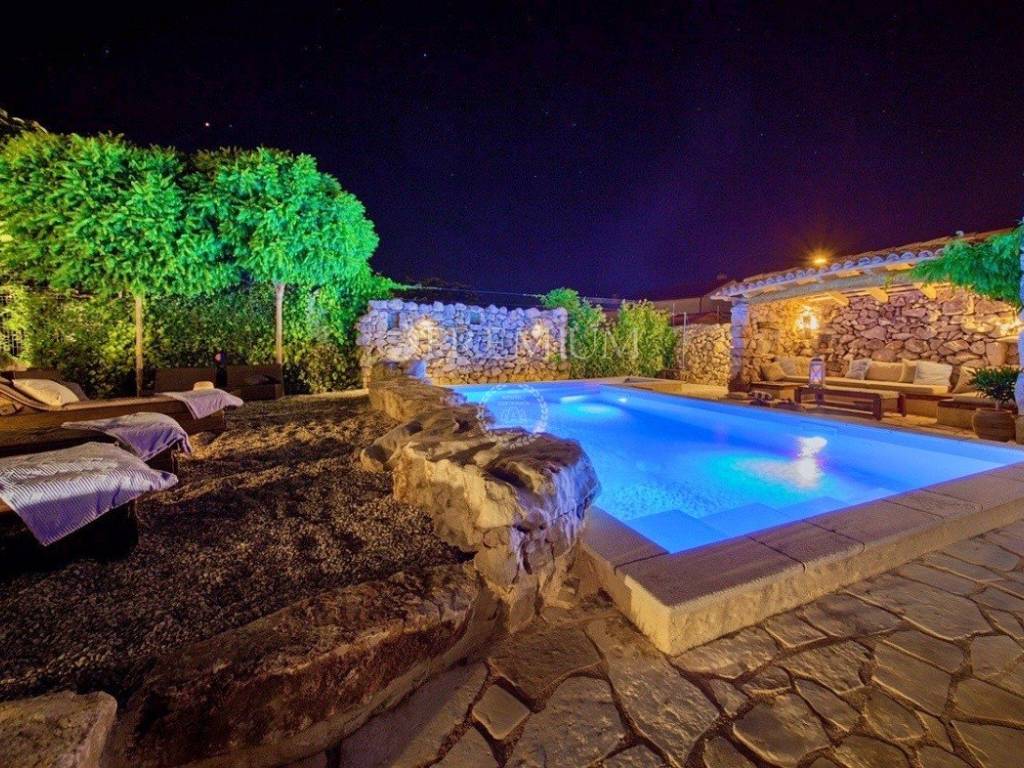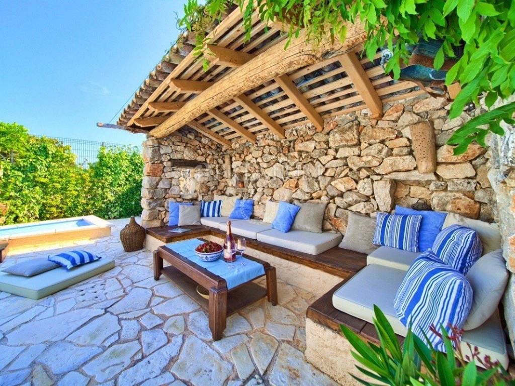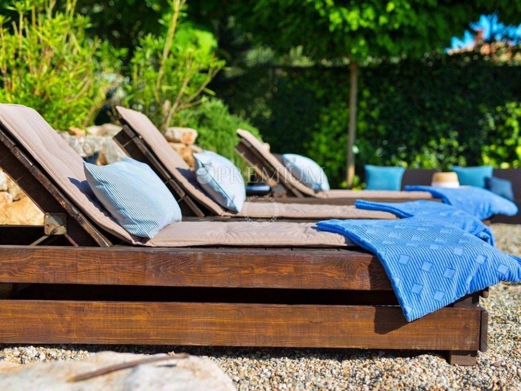 Next to the pool, there is the sunbathing area and the space for socializing with a stone table for 10 people.