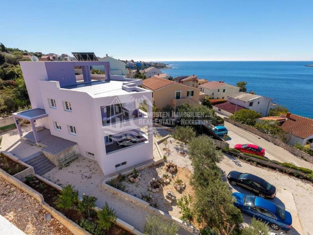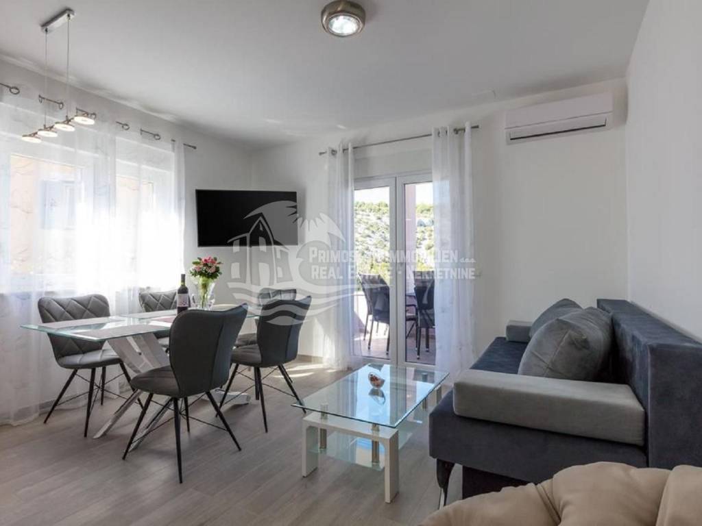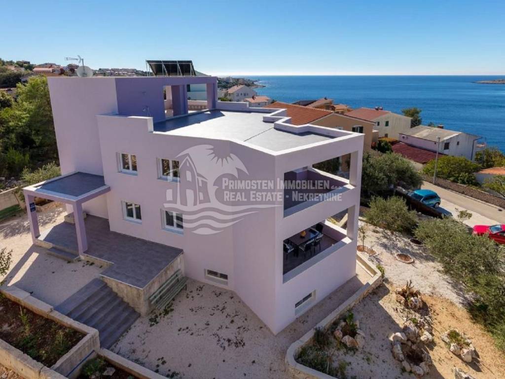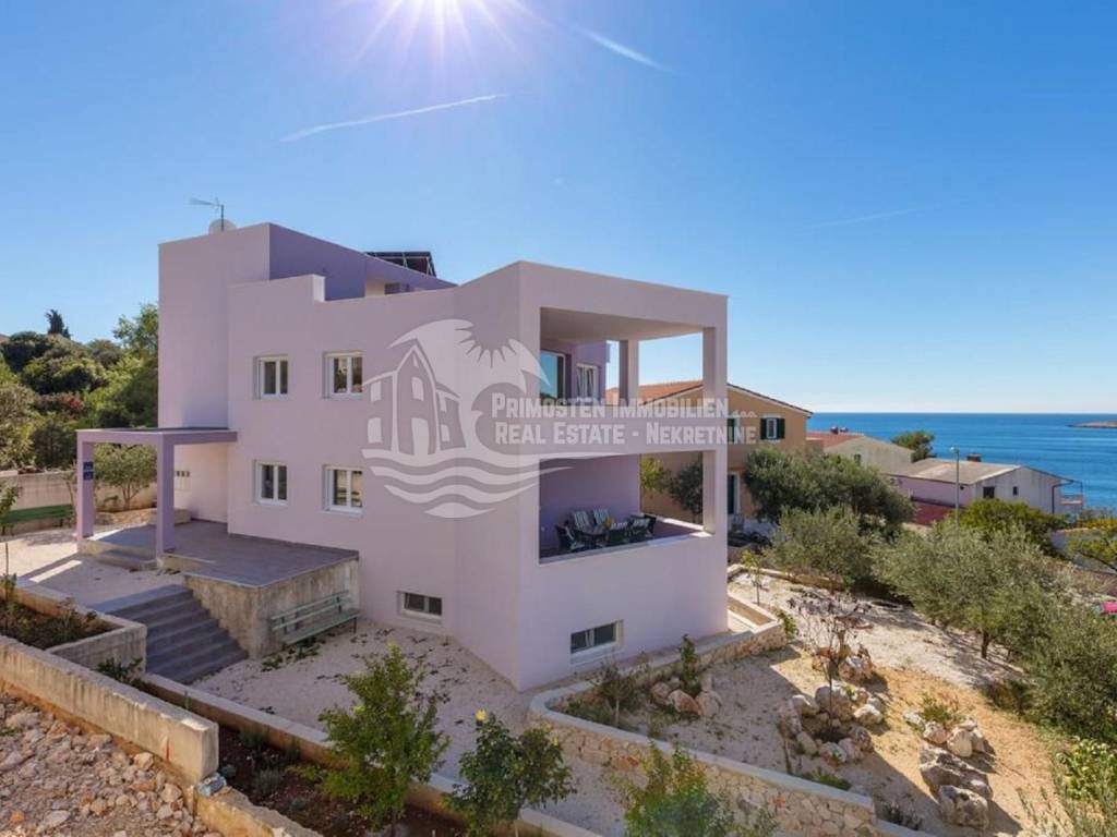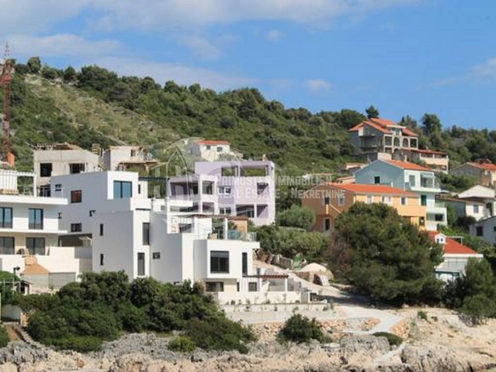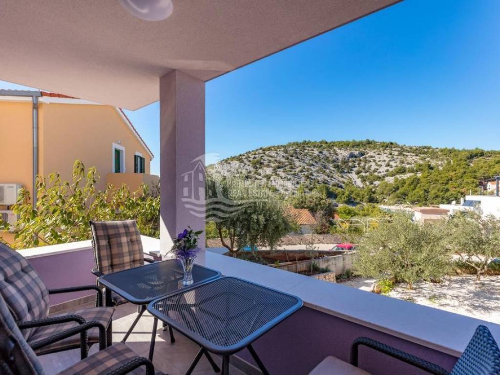 Apartment house for sale, 389 m², located near the sea. An infield has an area of 858 m², and the building consists of a basement, ground floor and two floors. In the basement there is a two-room apartment consisting of a living room, kitchen, bedroom and bathroom. On the ground floor there are two three-room apartments (approx. 60 m²) which are arranged in the same way: living room with kitchen, two bedrooms and a bathroom. On the first floor there is a spacious apartment in the high construction phase, and consists of a living room, kitchen, dining room, three bedrooms, two bathrooms and a toilet. On the top floor there is a large open terrace with a covered space that can be used to install a swimming pool or set up a jacuzzi. Furnished apartments are fully equipped and air conditioned, and the apartment under construction will be completed by the end of 2020. The house has a solar water tank, parking, a beautiful garden and an already well-established business in renting apartments. Nearby shops, restaurants and cafes are within 800 m, Trogir is 15 minutes away by car and Split Airport is about 30 km away. The place where the house is located is in great progress, it is attractive to many tourists who prefer peace and places without crowds and guarantees a complete real vacation from the daily hustle and bustle.
