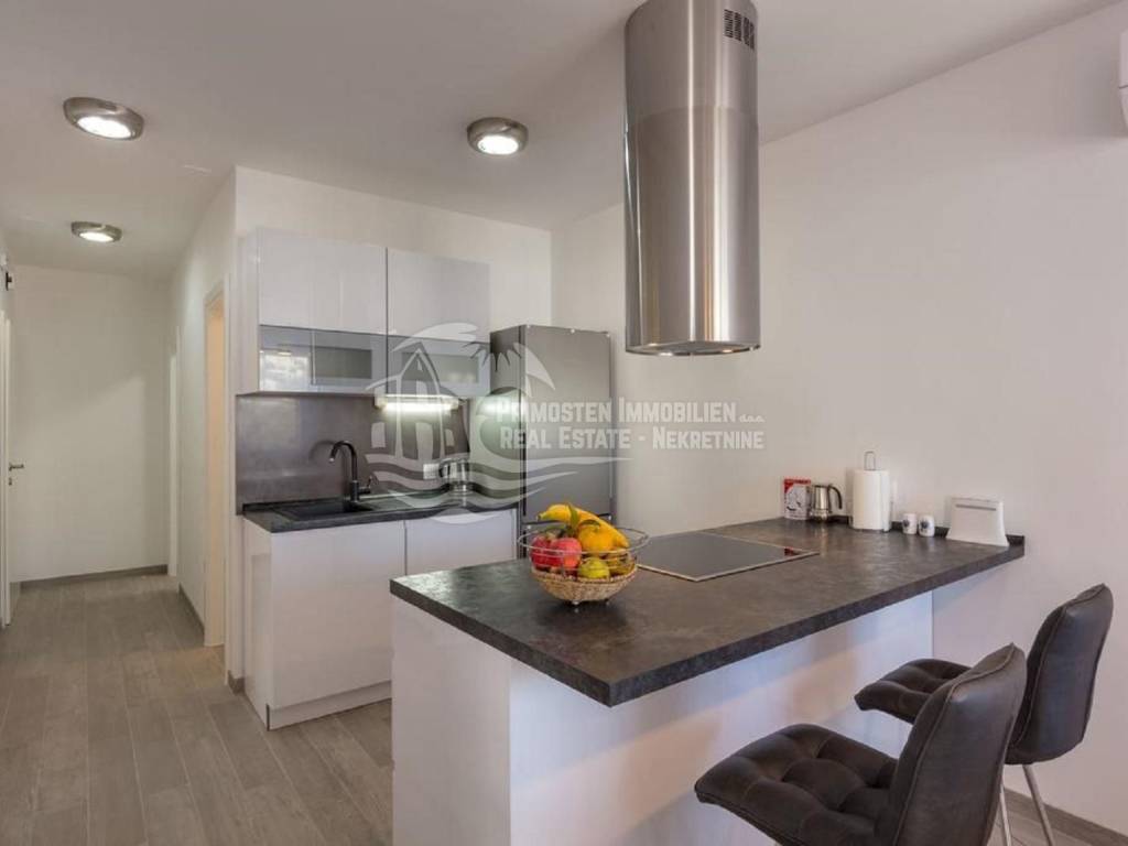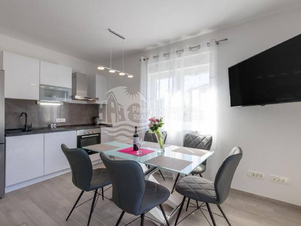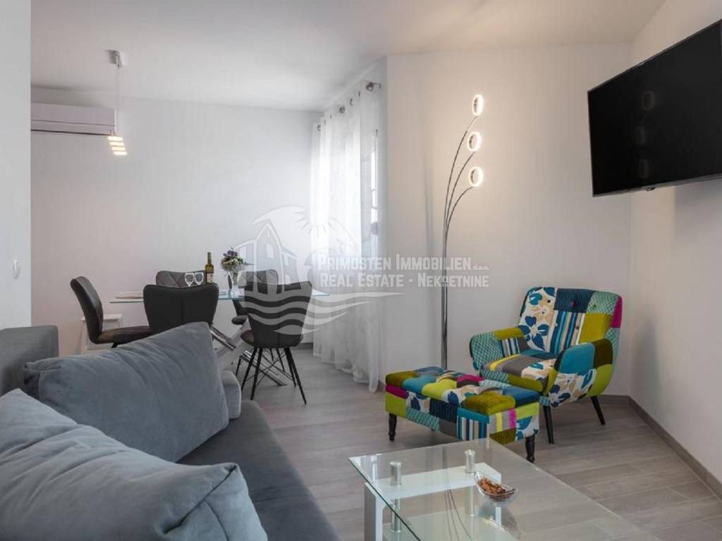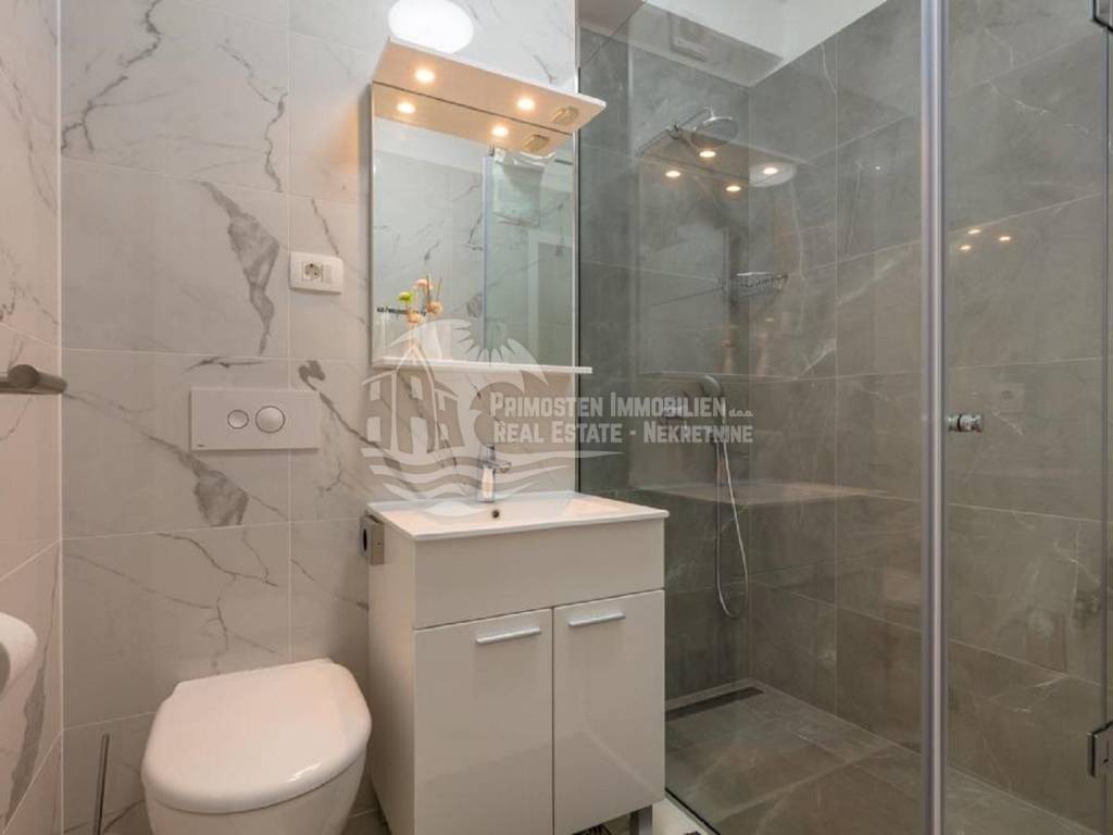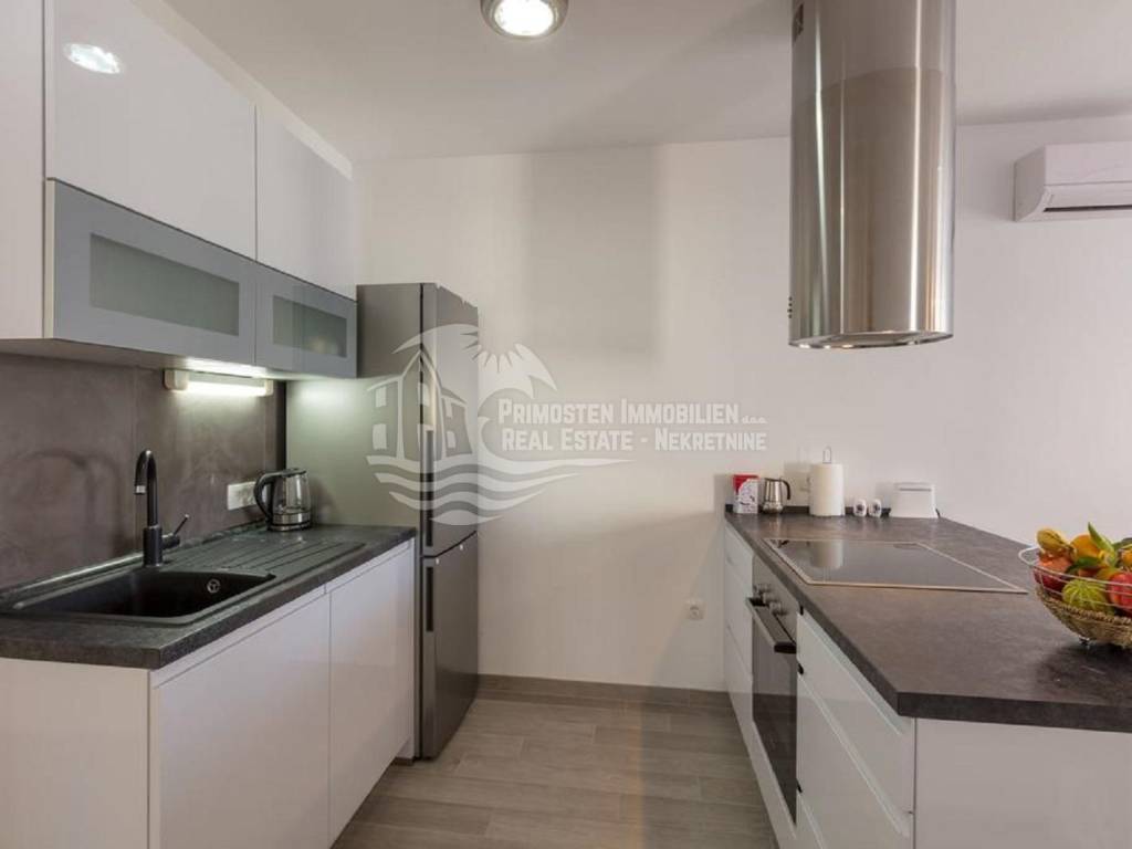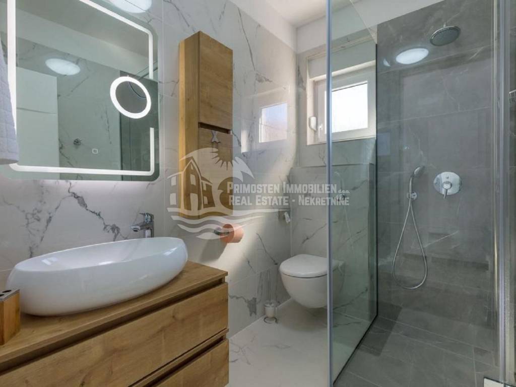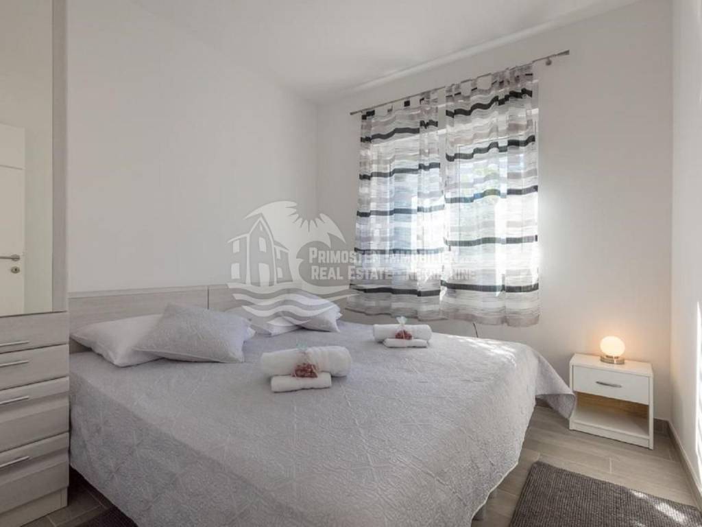 Apartment house for sale, 389 m², located near the sea. An infield has an area of 858 m², and the building consists of a basement, ground floor and two floors. In the basement there is a two-room apartment consisting of a living room, kitchen, bedroom and bathroom. On the ground floor there are two three-room apartments (approx. 60 m²) which are arranged in the same way: living room with kitchen, two bedrooms and a bathroom. On the first floor there is a spacious apartment in the high construction phase, and consists of a living room, kitchen, dining room, three bedrooms, two bathrooms and a toilet. On the top floor there is a large open terrace with a covered space that can be used to install a swimming pool or set up a jacuzzi. Furnished apartments are fully equipped and air conditioned, and the apartment under construction will be completed by the end of 2020. The house has a solar water tank, parking, a beautiful garden and an already well-established business in renting apartments. Nearby shops, restaurants and cafes are within 800 m, Trogir is 15 minutes away by car and Split Airport is about 30 km away. The place where the house is located is in great progress, it is attractive to many tourists who prefer peace and places without crowds and guarantees a complete real vacation from the daily hustle and bustle.