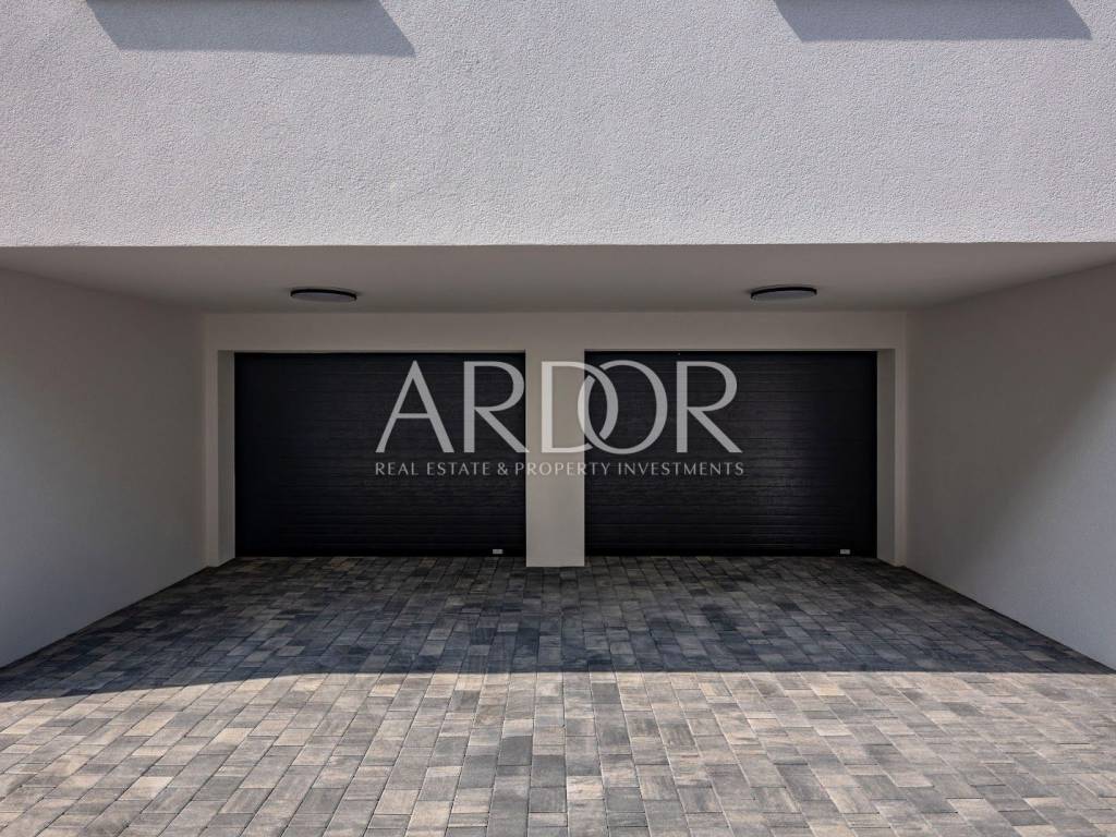 The villa features two large terraces with stunning sea views, a private 100 m² yard with a swimming pool, and a garage for two cars with an electric vehicle charging station.