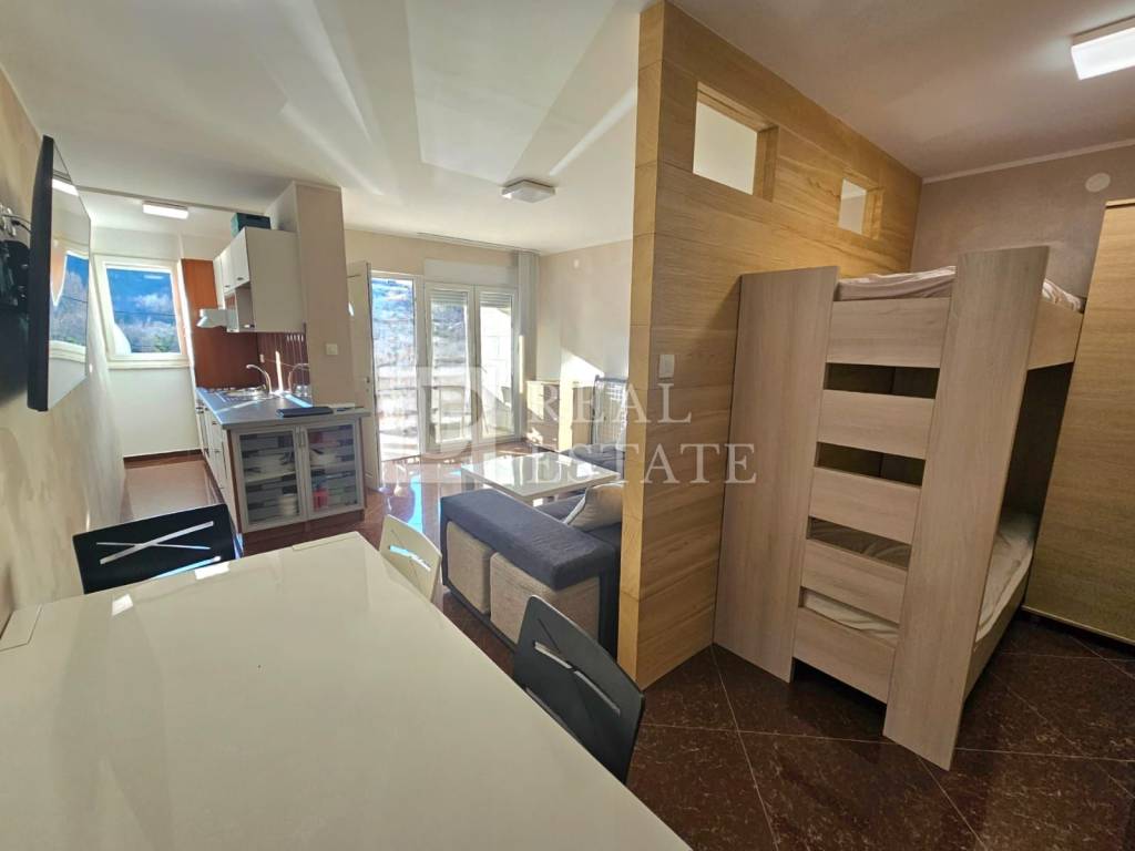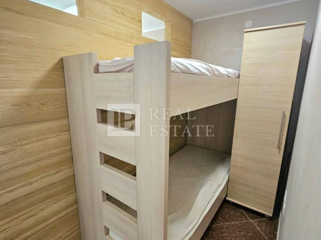 The living area has been partitioned off with a practical room partition, creating an additional bedroom with a bunk bed, which allows for the accommodation of a larger number of people.