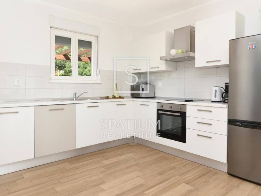 LABIN, SURROUNDINGS, we present an outstanding low-energy house with a swimming pool and sea view, ideal for living or tourist rental. The house is spread over three levels — basement, ground floor and first floor — offering a well-designed layout with a total of three comfortable bedrooms and three bathrooms. The entrance leads into a spacious open-plan area with a kitchen, dining room and living room that opens onto a covered terrace overlooking the pool and landscaped outdoor area with a barbecue. The ground floor also includes one bedroom with a bathroom, while the basement is connected internally and designed as an entertainment zone with the possibility of further customization. The first floor features two additional bedrooms, two bathrooms and a terrace with unobstructed sea views.