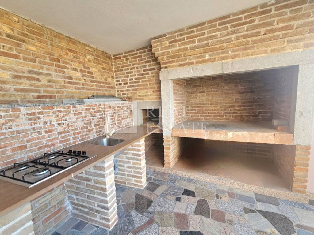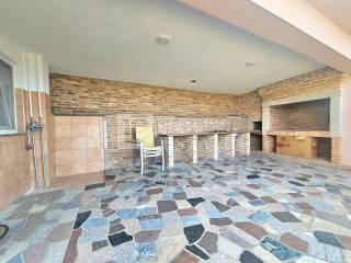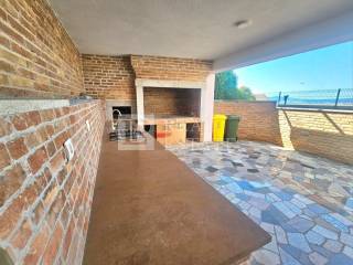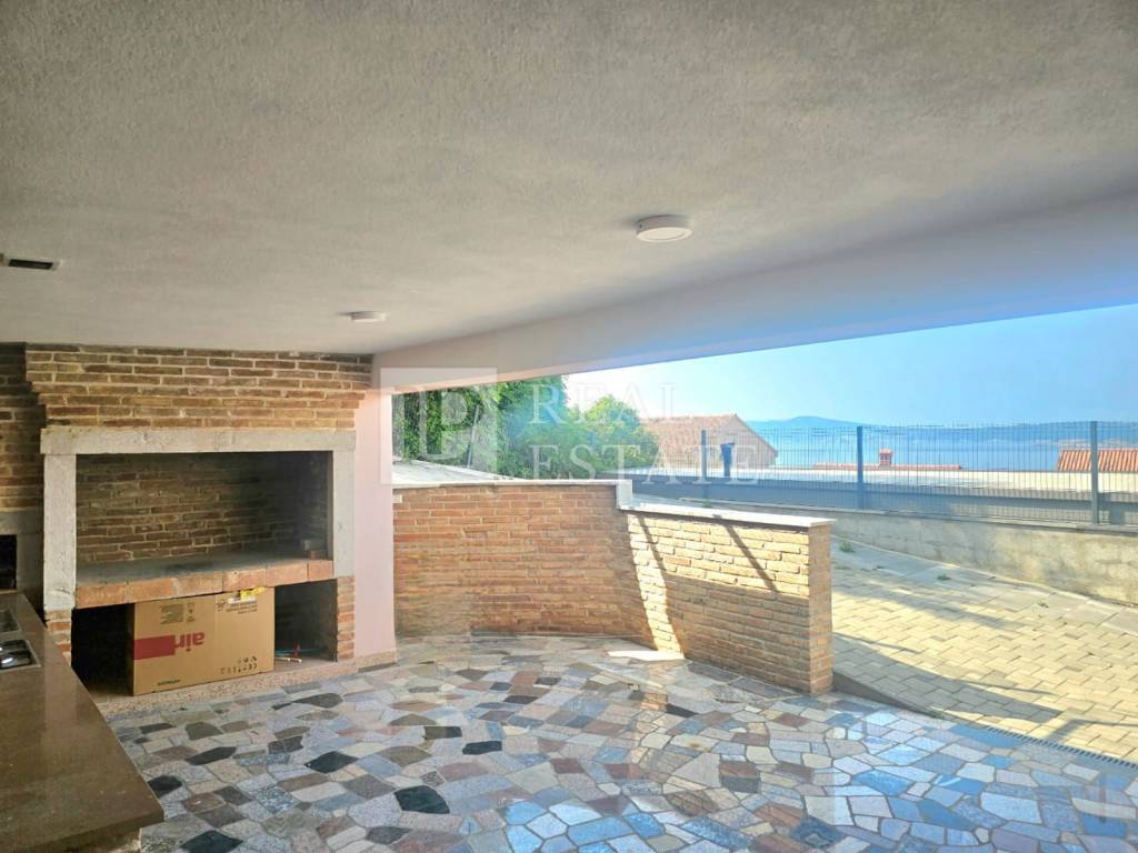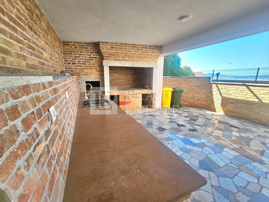 The spacious covered terrace, which includes a built-in barbecue and a summer kitchen, offers a view of the sea.