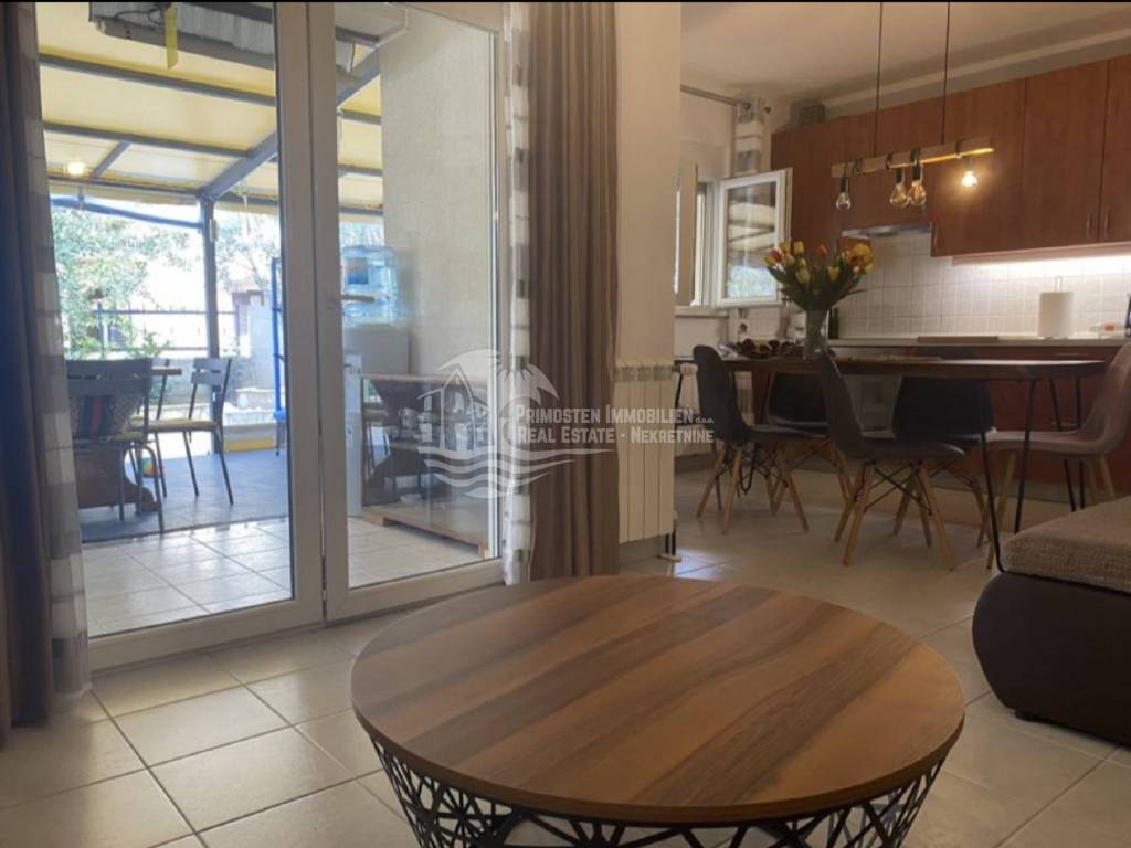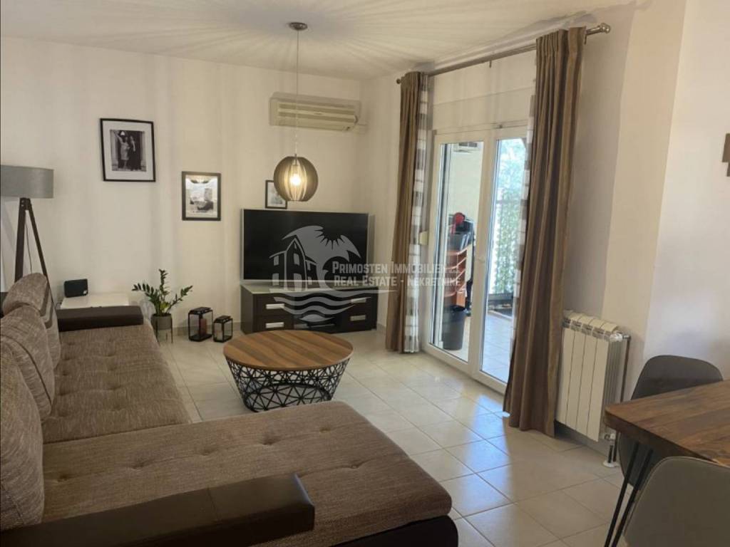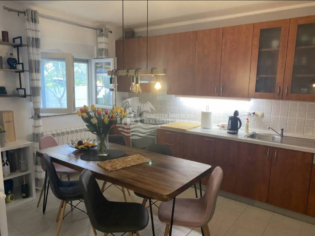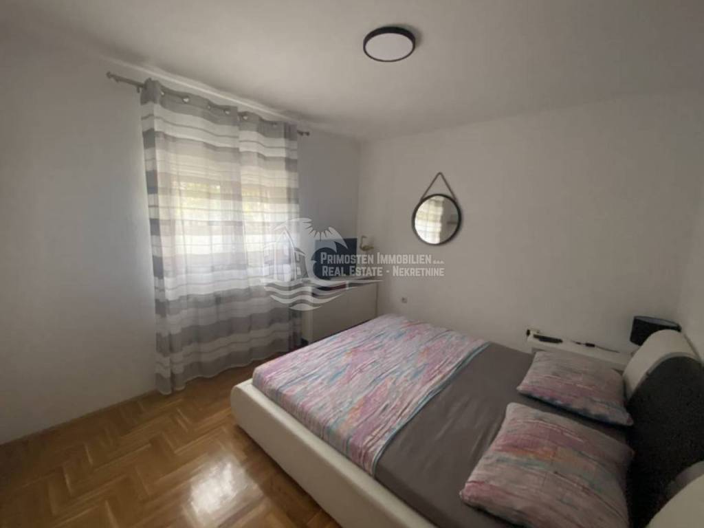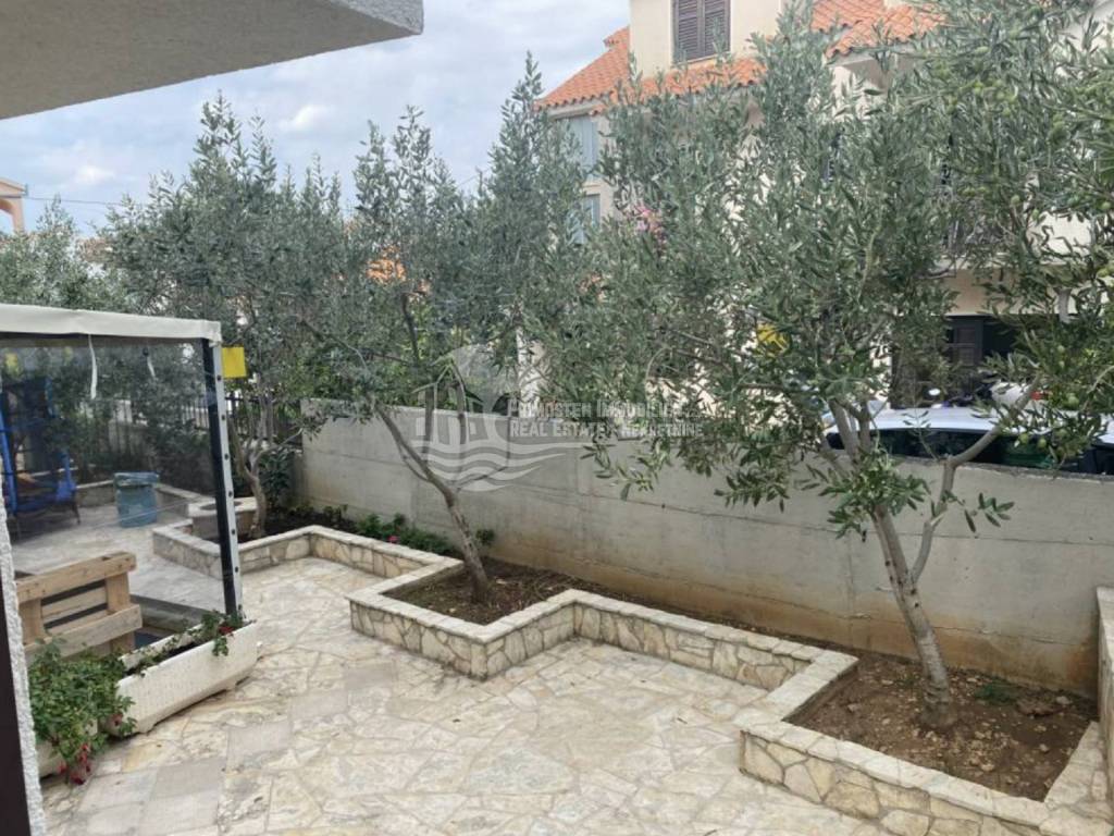 In an extremely attractive location, only 200m from the famous beach in Okrug Gornji, with excellent access road, we are selling a comfortable three-bedroom apartment. The apartment is located in a smaller, recently built residential building. The living area of the apartment is 70 m2 plus a covered terrace of 5m2. The attached garden with a total area of 161m2 provides the owner with complete intimacy and privacy, and enormous possibilities for decoration. Along with the apartment, a garage with a total area of 76m2 is also being sold. The garden is maintained and cultivated, and the apartment is being sold fully furnished.