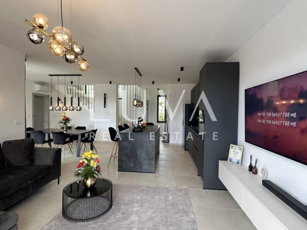 A newly built modern villa is for sale in Kaštel Stari, situated on a spacious plot of 938 m² with a captivating sea view. The villa, covering 245 m² of living space, offers contemporary luxury in a peaceful setting, making it an ideal opportunity for family living or investment in tourism.
