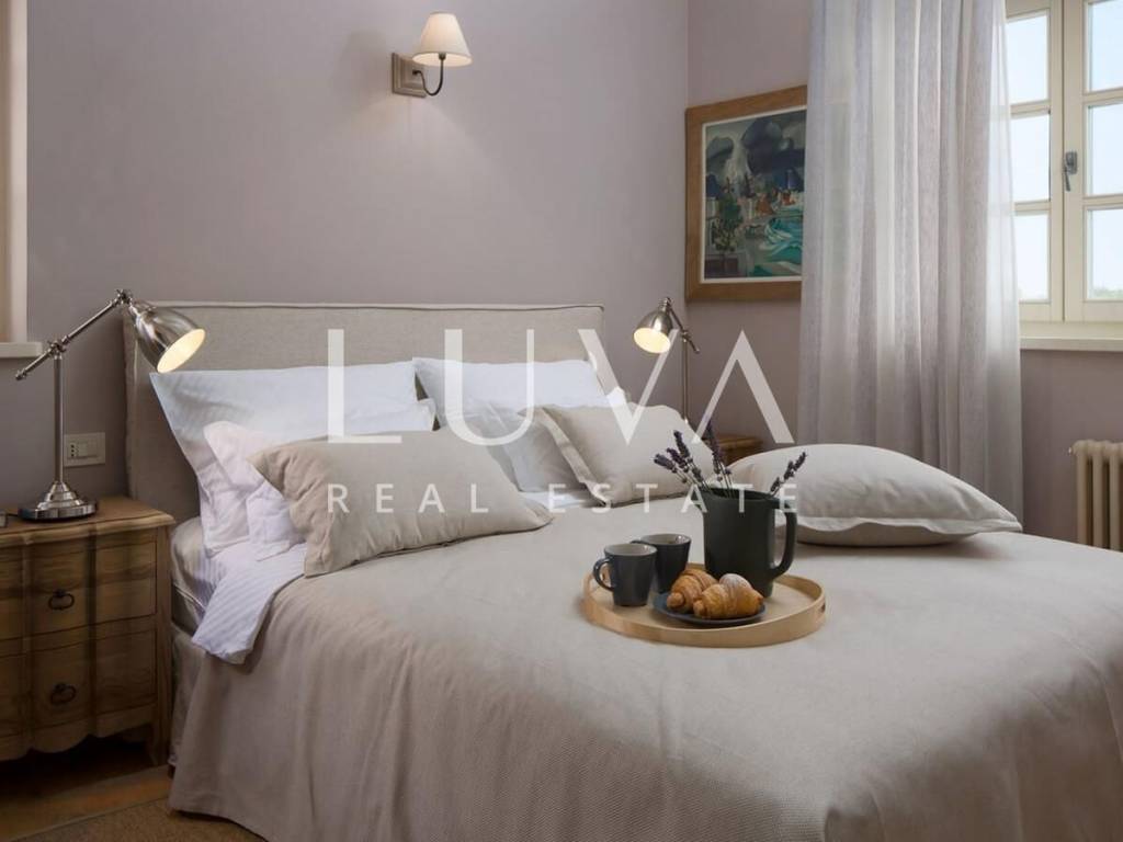 A luxury villa with a pool is for sale in the quiet village of Ladići, near Kanfanar. Kanfanar is well-connected by the Istrian highway, and the famous town of Rovinj is nearby. This luxury villa, built in 2016, covers 297 m² over 2 floors. It is constructed in traditional Istrian stone style with a sloped tiled roof. The exterior and interior feature a traditional style with stone walls, wooden beams, and rustic wooden furniture. The ground floor includes a spacious living room with a fireplace, a fully equipped kitchen with designer appliances, and a large dining table. Outside, there is a pool, a covered terrace with a grill, and an outdoor dining area. The villa has 4 bedrooms, each with its own bathroom, and is being sold fully furnished and equipped. The villa has been successfully rented as a tourist property for several years, and additional sister villas are also for sale, offering a great investment opportunity in Croatian tourism.
