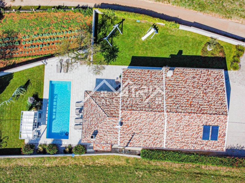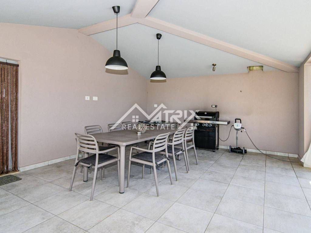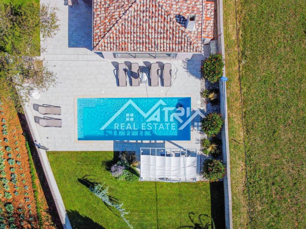 Located in a quiet neighborhood in the vicinity of the Renaissance town of Svetvinčenta, this beautiful modern one-story house with a swimming pool is spread over a spacious plot of land of 990 m2, and the total living area of the house is 130 m2.