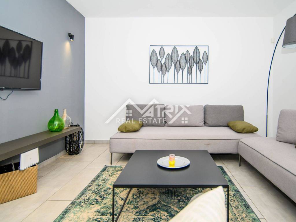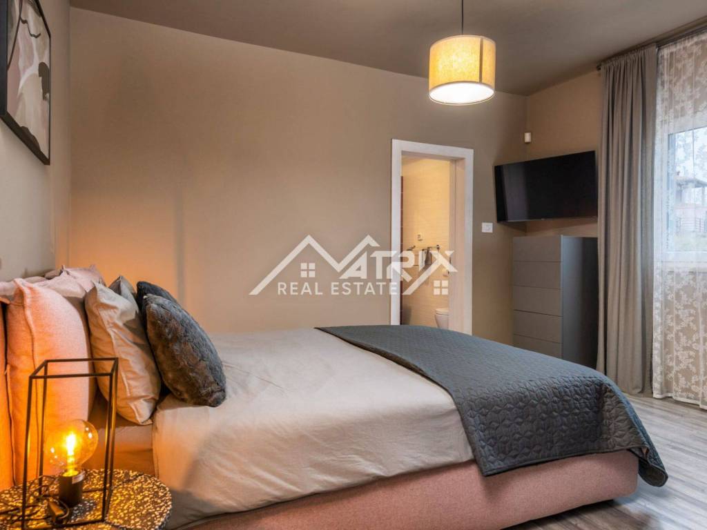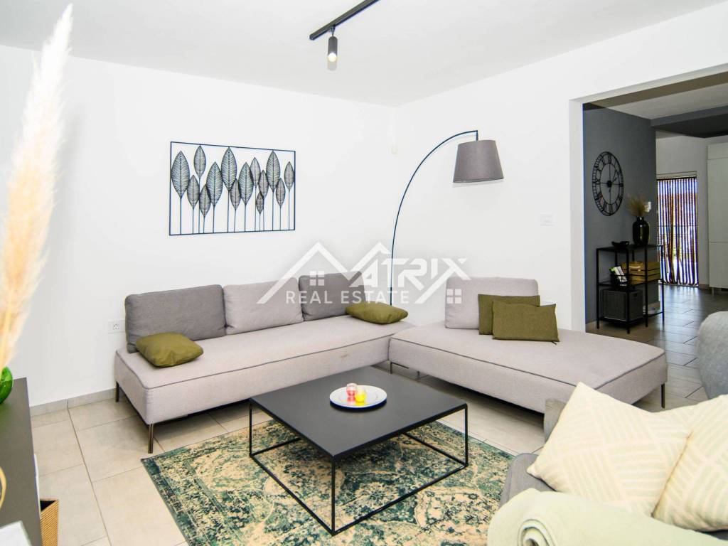 The central part of the fenced yard is certainly the swimming pool with a lounge area and a spacious terrace for sunbathing, and a covered part of the terrace with a dining table. A landscaped grass area with Mediterranean plants and a parking lot for at least 3 vehicles complete the beautiful fenced yard.