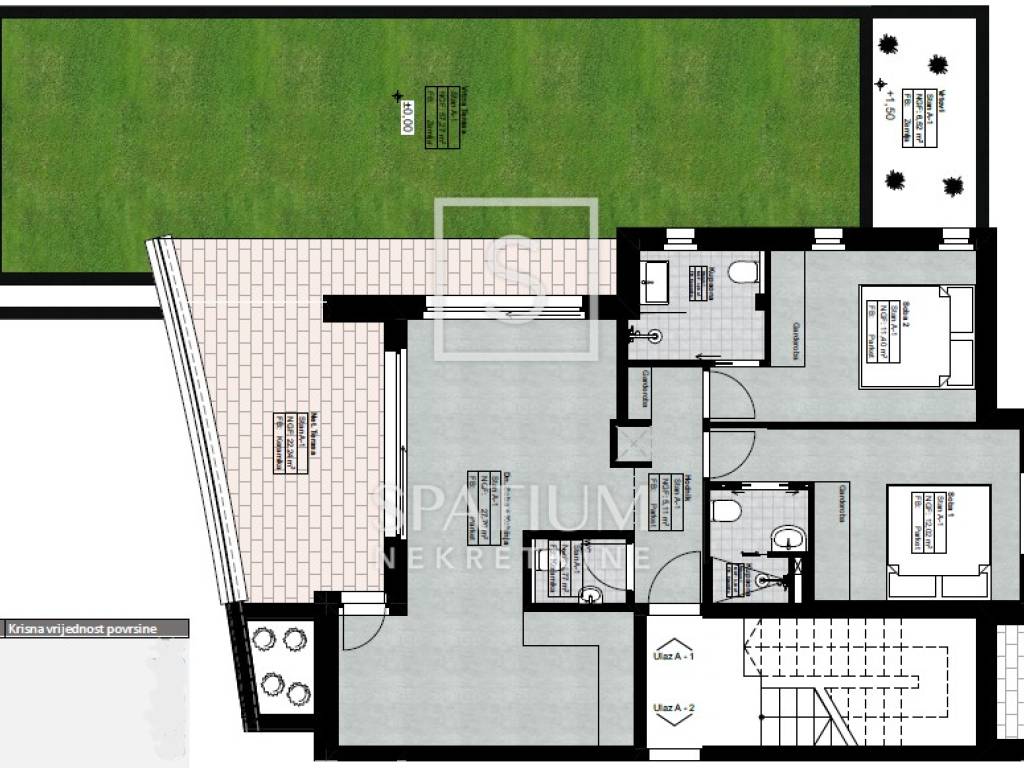 LOVRAN, in the offer we got an apartment with a panoramic view in an attractive location. It is located in an exclusive building with a total of six residential units, with a total net area of 118.19 m2. It consists of an entrance hall, a toilet, an open space where the kitchen, dining room and living room are located, from which there is access to a spacious terrace and garden. It has two bedrooms, each with its own bathroom and balcony. It has two parking spaces (garage and outside) and a storage room in the basement. Quality construction, top-quality materials and finishing are the guarantee of comfortable living in this property (high-quality aluminum joinery with three-layer glass, top-class ceramics and sanitary ware, air conditioning, underfloor heating and heat pump, glass fences). Intelligent design, functionality and practicality and the latest construction techniques have been used to ensure durability, sustainability and provide the best possible living experience. It is located in an excellent location that provides easy access to the sea and the center of Lovran. The facility is under construction, and the expected completion of the works is the beginning of 2025. Mr. Lovran was named after the laurel that grows wildly in abundance in his surroundings. The climate is Mediterranean with an average of 269 sunny days per year. Lovran has been attracting travelers for thousands of years, conquering them with its natural beauty and keeping them on its coast. What attracted travelers from all parts of Europe for centuries still captivates visitors to this small town. Mandrać in the heart of the town, the tower and the Old Town full of historical stories and legends. A great gastronomic offer based on original ingredients. A unique climate that combines fresh mountain air and sea aerosol and beautiful nature that captivates at first sight. For other information, please contact us with confidence. Igor Stanić mediation assistant + 385 91 533 9307 igor@spatium.hr Spatium nekretnine + 385 51 272 903 info@spatium.hr
