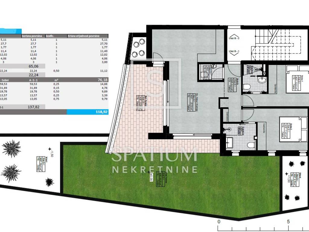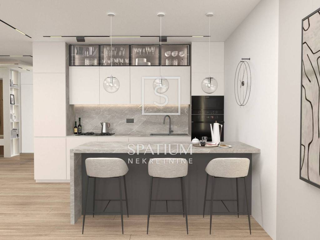 LOVRAN, in the offer we got an apartment with a panoramic view in an attractive location. It is located in an exclusive building with a total of six residential units, with a total net area of 118.19 m2. It consists of an entrance hall, a toilet, an open space where the kitchen, dining room and living room are located, from which there is access to a spacious terrace and garden. It has two bedrooms, each with its own bathroom and balcony. It has two parking spaces (garage and outside) and a storage room in the basement. Quality construction, top-quality materials and finishing are the guarantee of comfortable living in this property (high-quality aluminum joinery with three-layer glass, top-class ceramics and sanitary ware, air conditioning, underfloor heating and heat pump, glass fences). Intelligent design, functionality and practicality and the latest construction techniques have been used to ensure durability, sustainability and provide the best possible living experience. It is located in an excellent location that provides easy access to the sea and the center of Lovran. The facility is under construction, and the expected completion of the works is the beginning of 2025. Mr. Lovran was named after the laurel that grows wildly in abundance in his surroundings. The climate is Mediterranean with an average of 269 sunny days per year. Lovran has been attracting travelers for thousands of years, conquering them with its natural beauty and keeping them on its coast. What attracted travelers from all parts of Europe for centuries still captivates visitors to this small town. Mandrać in the heart of the town, the tower and the Old Town full of historical stories and legends. A great gastronomic offer based on original ingredients. A unique climate that combines fresh mountain air and sea aerosol and beautiful nature that captivates at first sight. For other information, please contact us with confidence. Igor Stanić mediation assistant + 385 91 533 9307 igor@spatium.hr Spatium nekretnine + 385 51 272 903 info@spatium.hr