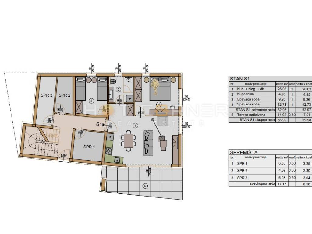 The price in the ad is for the apartment S1 2ss 59.98m2 + parking 2.50m2 + storage 2.30m2 = 64.78m2