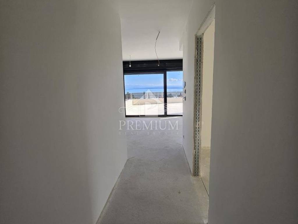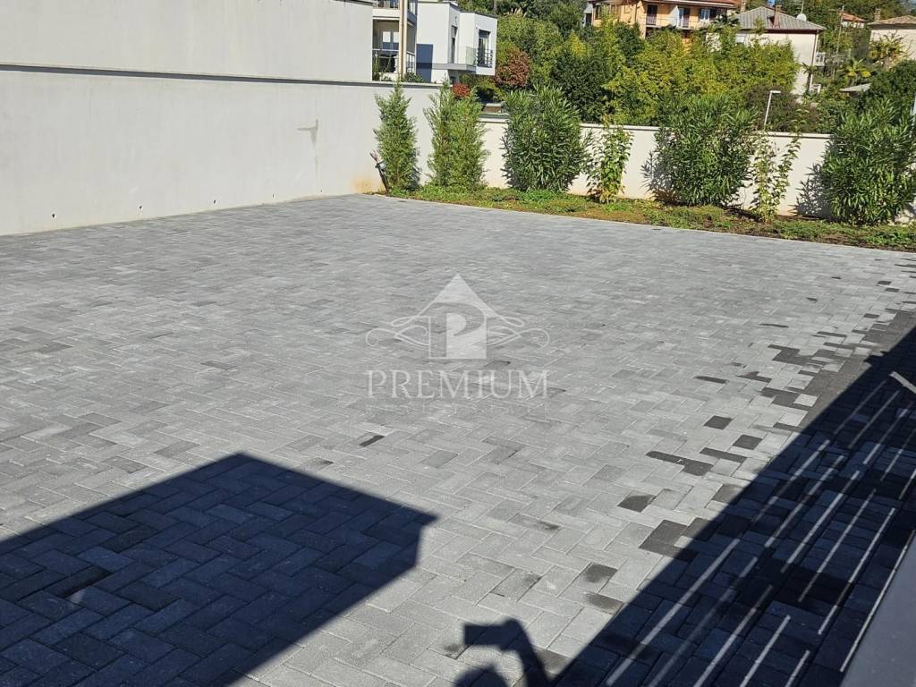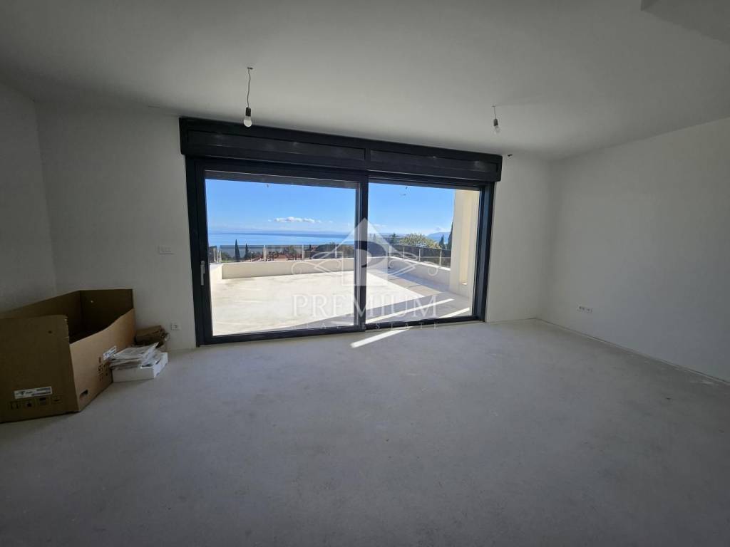 We are pleased to present you an apartment in a beautifully designed urban villa with two residential units, located just a few minutes' drive from the center of Lovran and only 300 meters from the sea and the Lungomare promenade. It is located in a dead-end street, surrounded by modern new buildings and is perfectly integrated into the Mediterranean landscape. Large glass walls allow for plenty of natural light, and spacious terraces offer a magnificent view of the entire Kvarner.