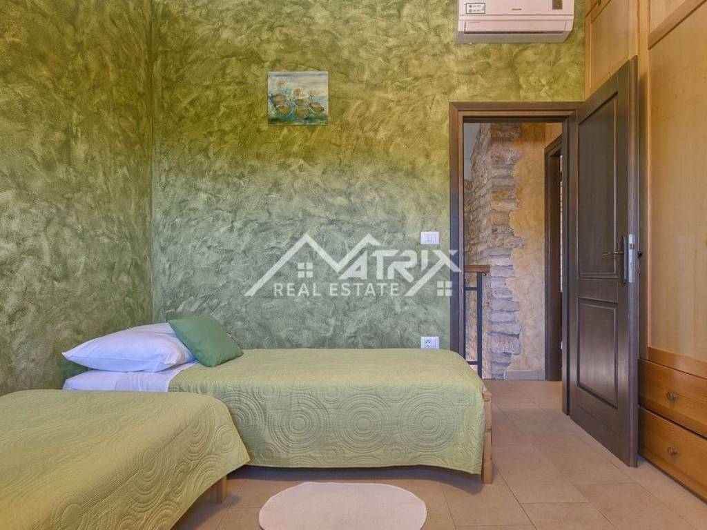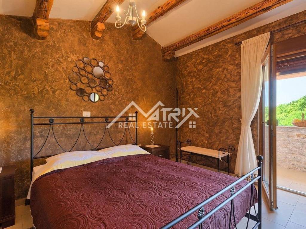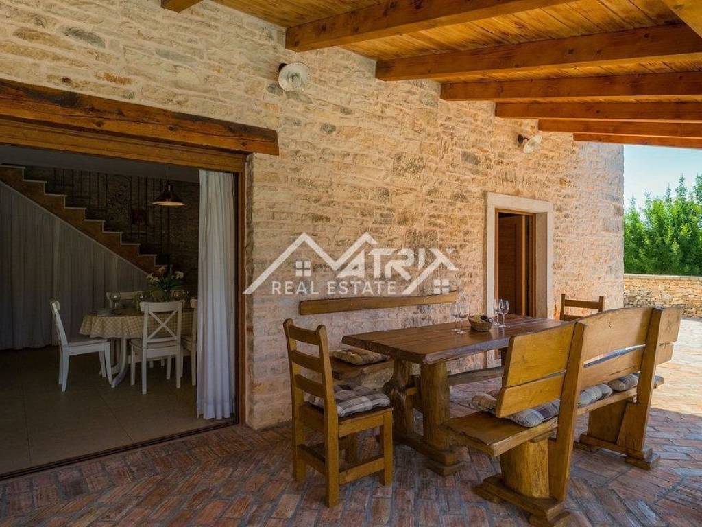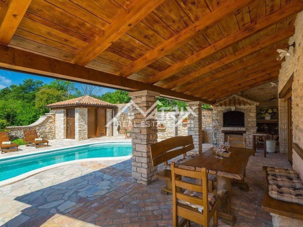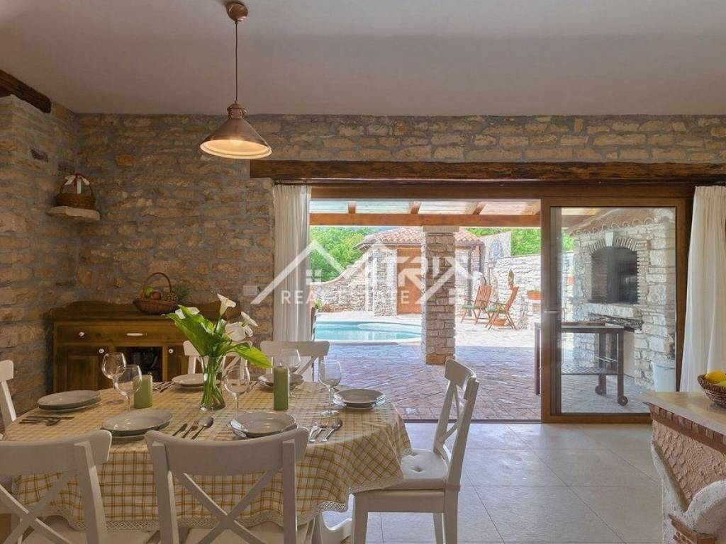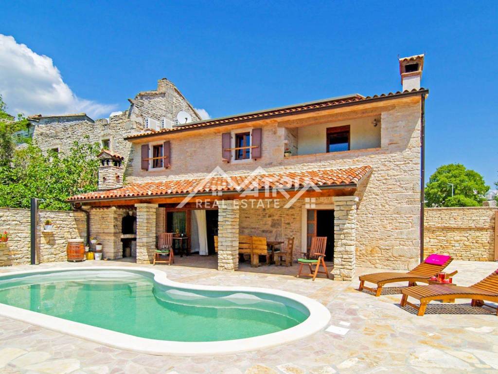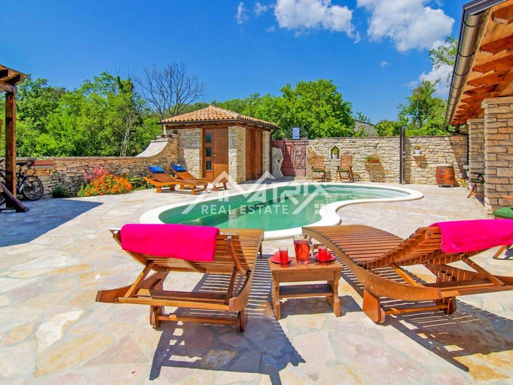 This beautiful stone villa with a swimming pool is for sale, fully equipped and furnished, with a total living area of 150 m2. The house is located in a quiet settlement on the very edge of the construction zone, offering a beautiful open view of nature. The house is very successfully rented during the summer months, and it is also the winner of the ECO certificate due to its own solar power plant and minimal electricity costs.