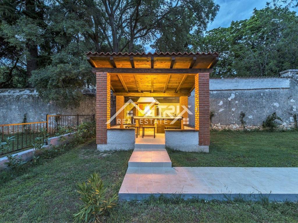 The central part of the garden is a beautiful small swimming pool with a terrace for sunbathing, and there is also a covered summer kitchen with a barbecue. There is also a covered part of the garden that is used as a parking lot for at least one vehicle. The yard is completely fenced, providing a sense of privacy.