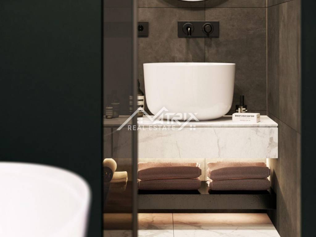 The villa extends over the ground floor and first floor, with a total living area of 198 m2. The ground floor of the house is designed as an open space that unites the living room with the dining room and kitchen, with one bedroom with its own bathroom and walk-in closet, and the ground floor is complete with a guest toilet, a laundry room and a technical room. The living room leads to the pool terrace through large glass walls that provide plenty of light throughout the day, as well as a beautiful view of the sea. An internal staircase leads to the first floor, where there are three bedrooms, each of which has its own bathroom and walk-in closet, and each room offers a view of the sea. The master bedroom has its own loggia