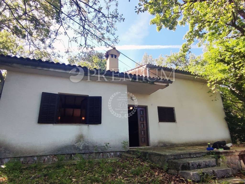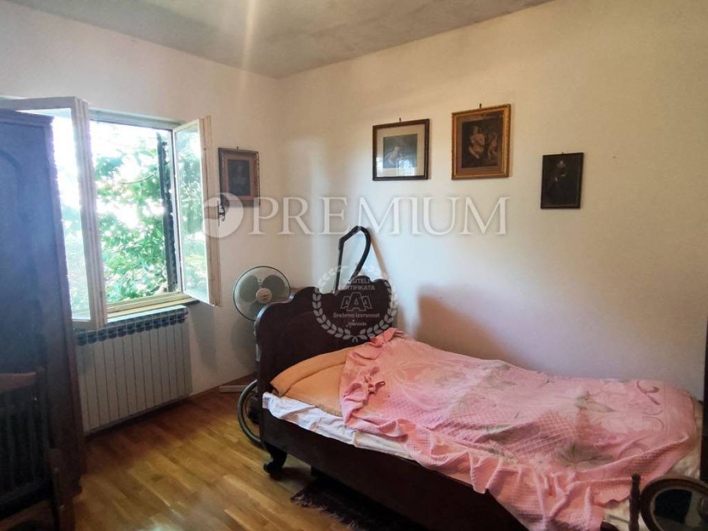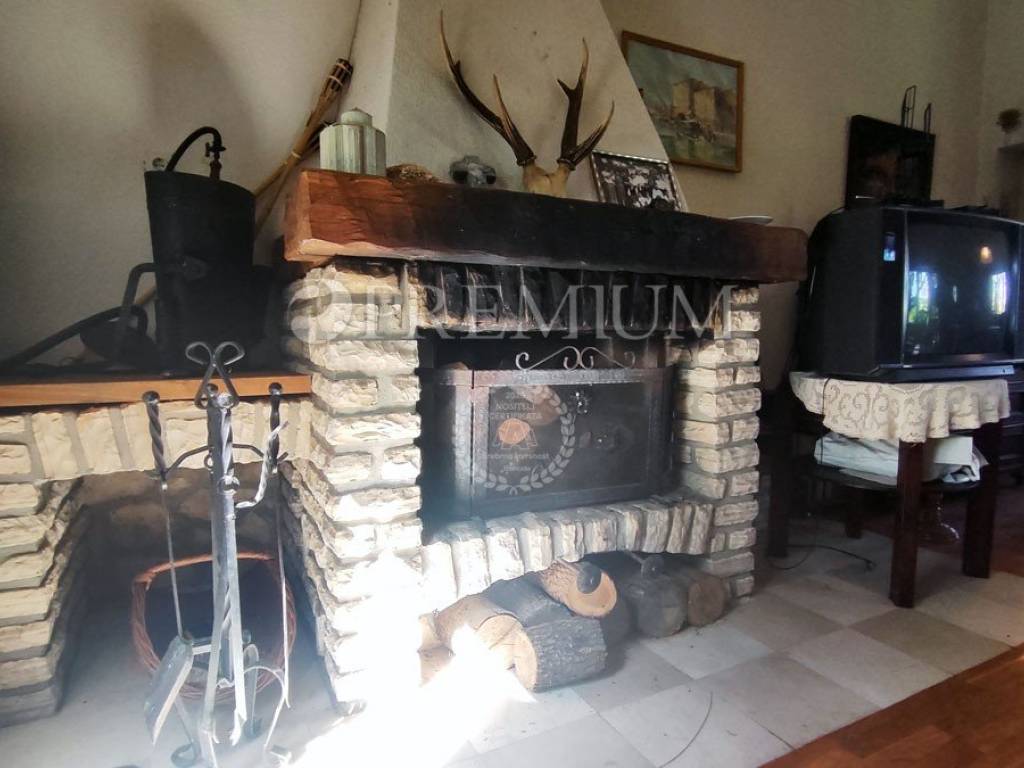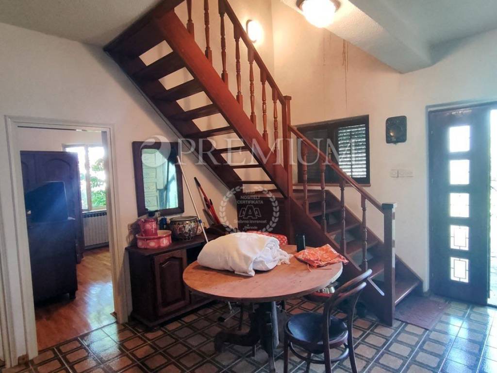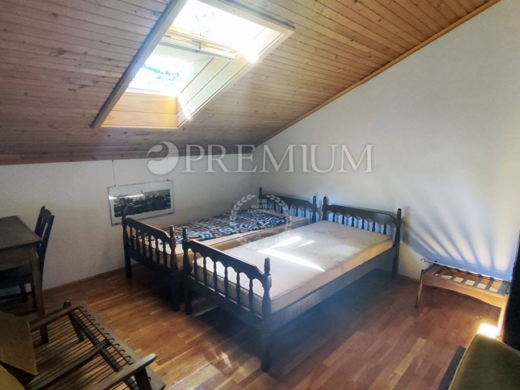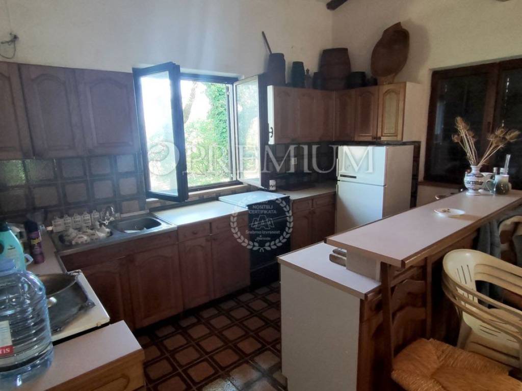 Island of Krk, Dobrinj, sale of a detached house with a garden of 2769 m2, an auxiliary facility of 23 m2, built in 1980. The house consists of a basement, ground floor, and first floor, with a total area of 139 m2. The basement features many stone details and can be an ideal place for a cellar. On the ground floor, there is an entrance hall, 2 bedrooms, a bathroom, an open space with a kitchen, dining area, and living room with a wood-burning fireplace. Additionally, there is access to the garden from the living area. On the first floor, there are 2 bedrooms, a bathroom, and a central heating boiler room. Wooden joinery with grilles, ceramic flooring, and parquet in the rooms are installed. The plot is of regular shape, fully fenced, and offers complete privacy. There is also the possibility of purchasing an olive grove, with an area of 600 m2.