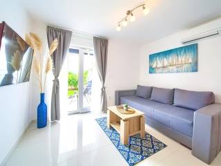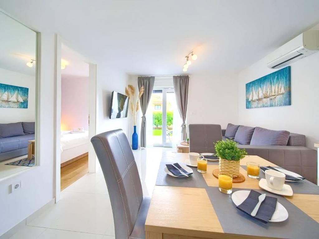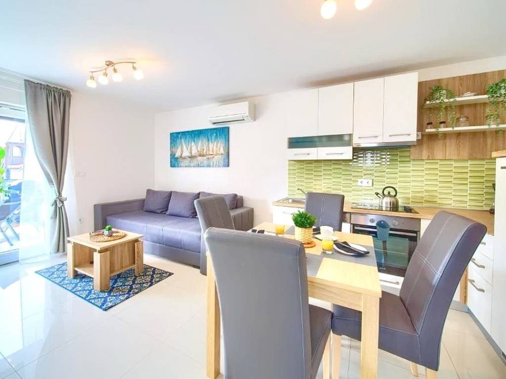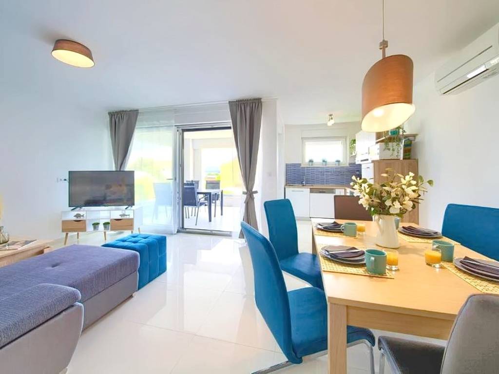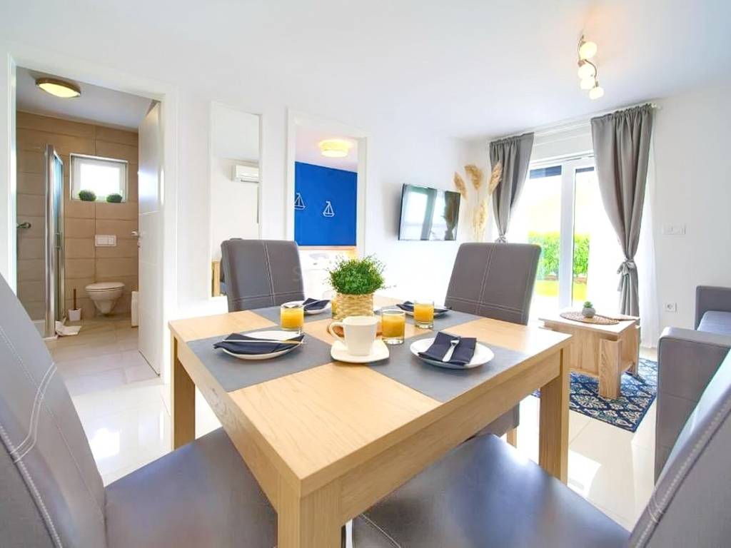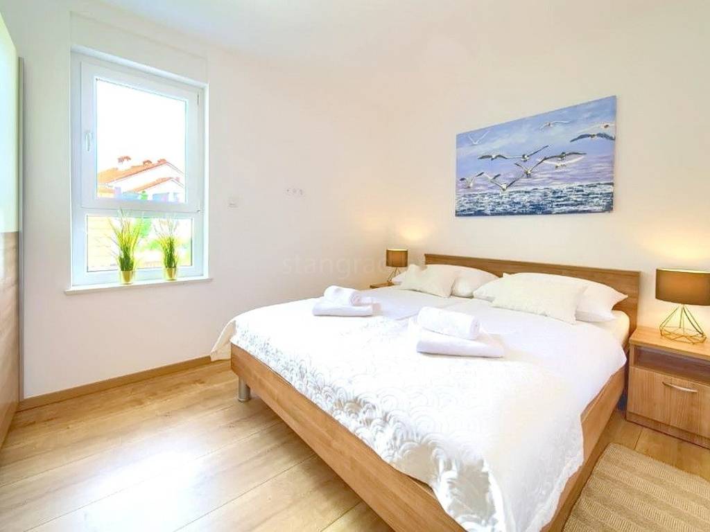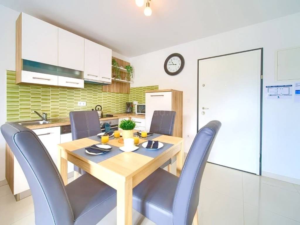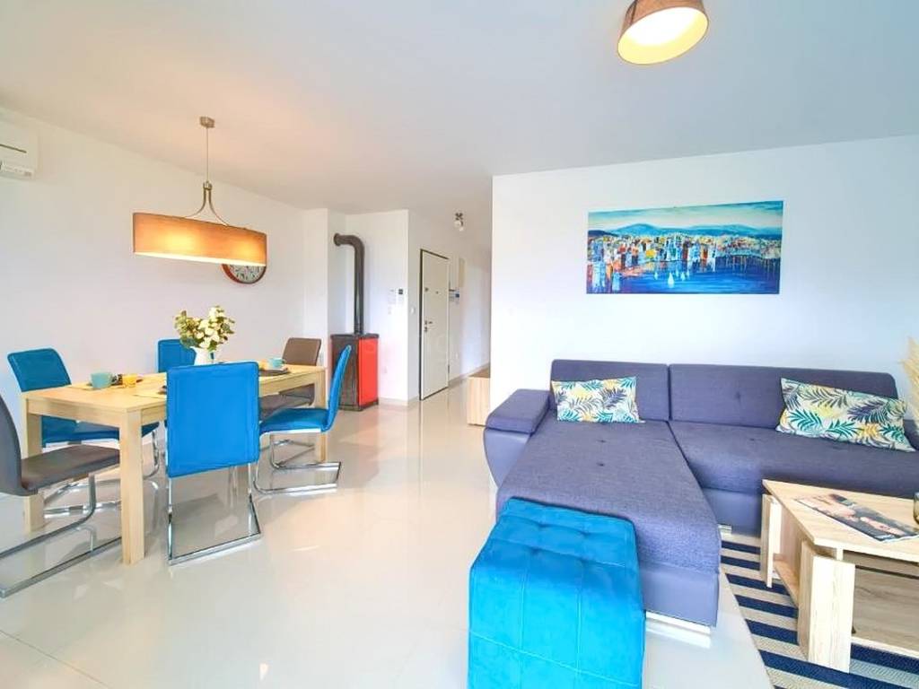 Within a modernly designed building, the apartments extend over the ground floor and the first floor with a total area of 107 m². On the first floor, there is a living room, a kitchen with a dining area, two bedrooms, a bathroom, and a terrace with a beautiful view. The ground floor apartment includes an entrance hall, living room, kitchen with dining area, bathroom, and bedroom, with the added benefit of a landscaped garden of 76 m². The interior spaces are equipped with functional furniture and the necessary technical equipment, ensuring comfortable living.