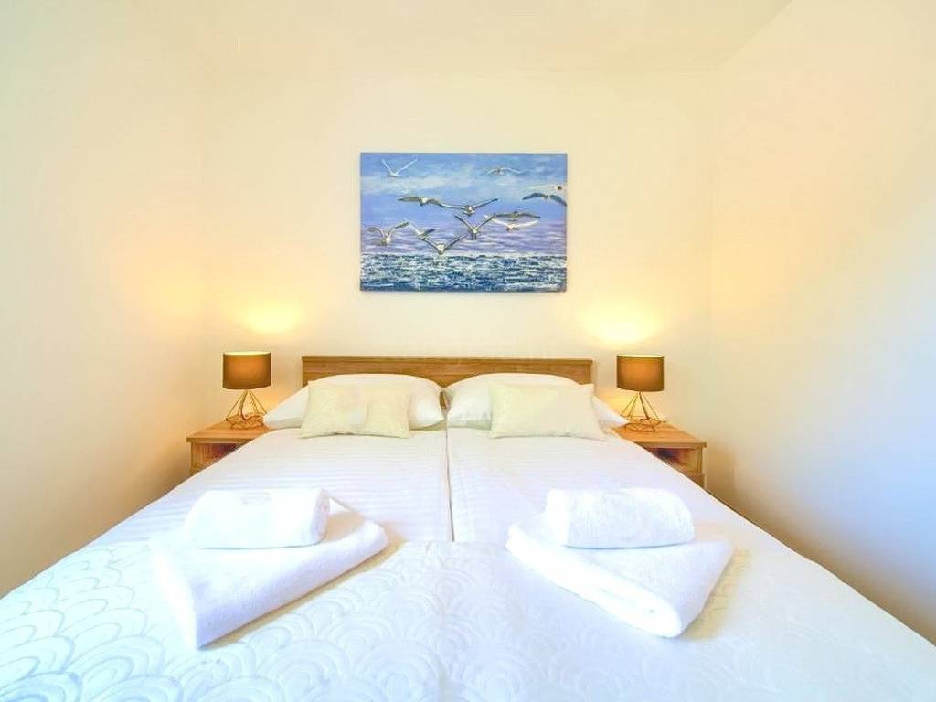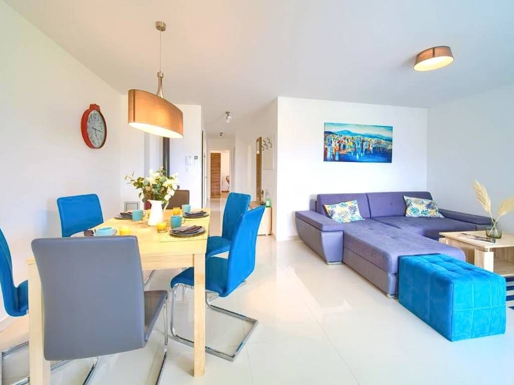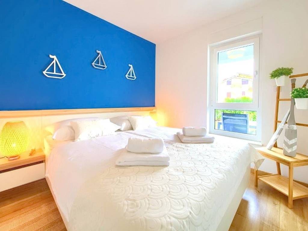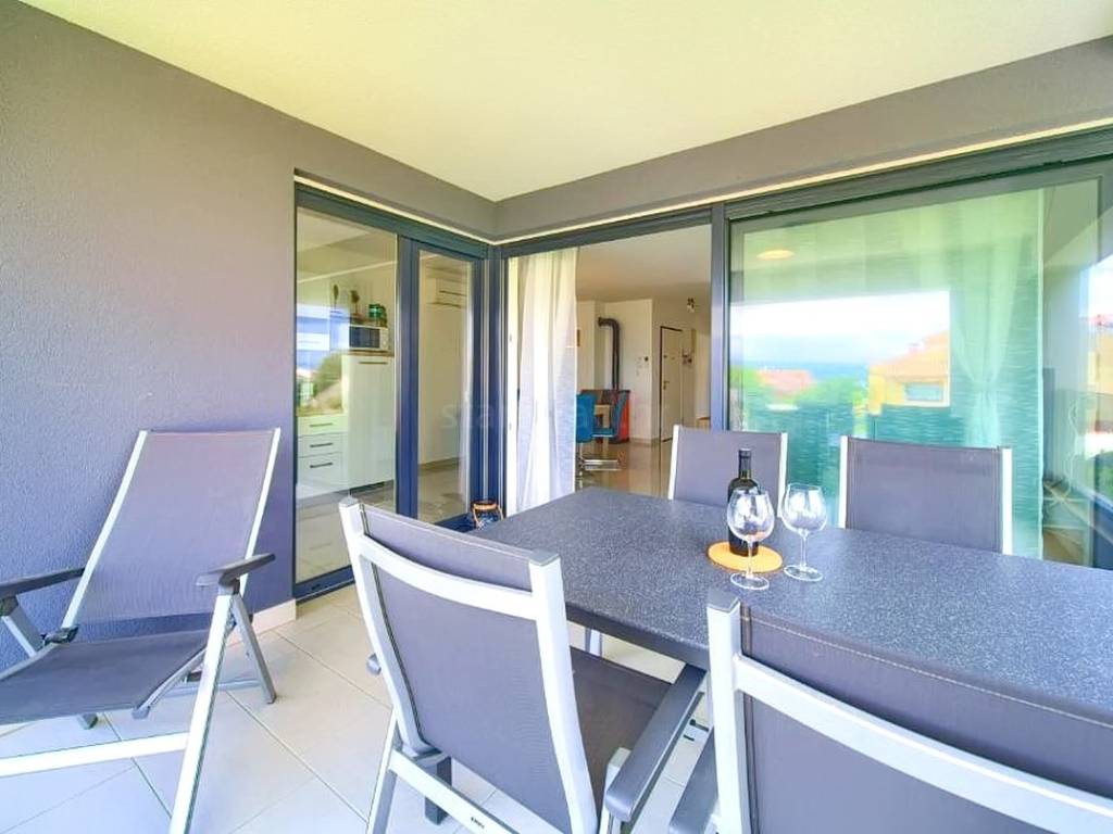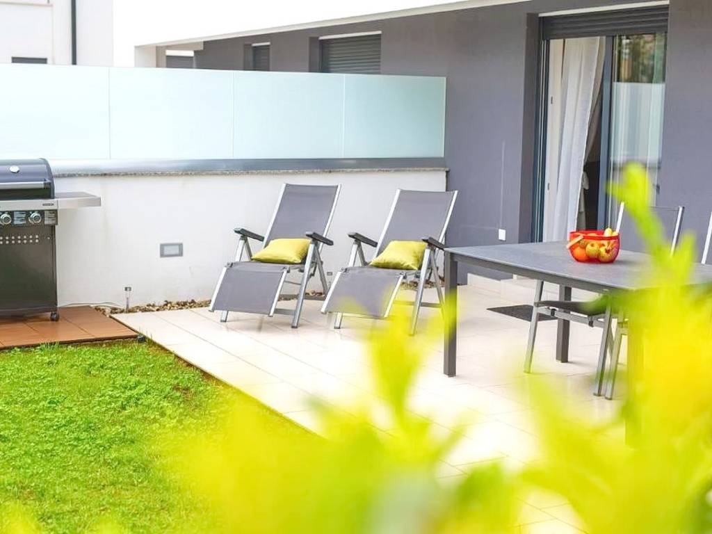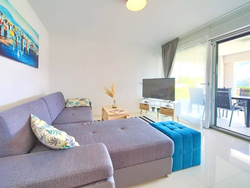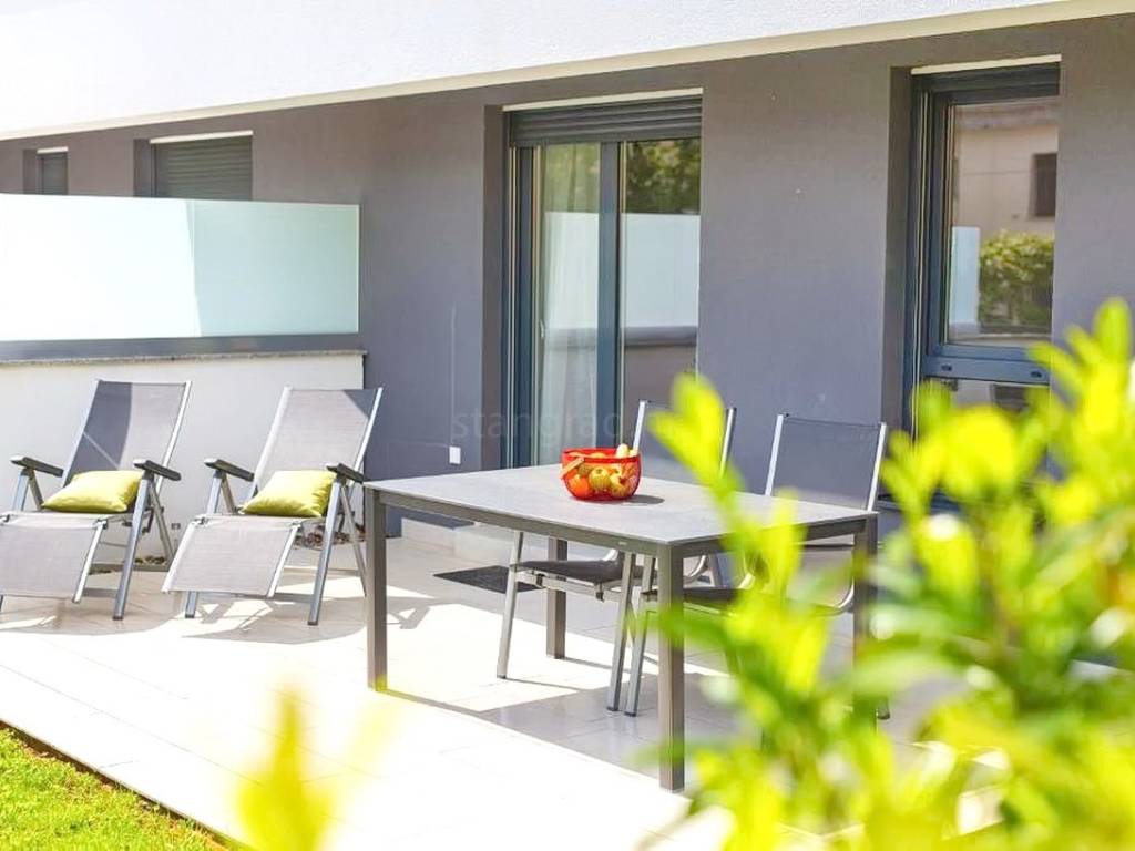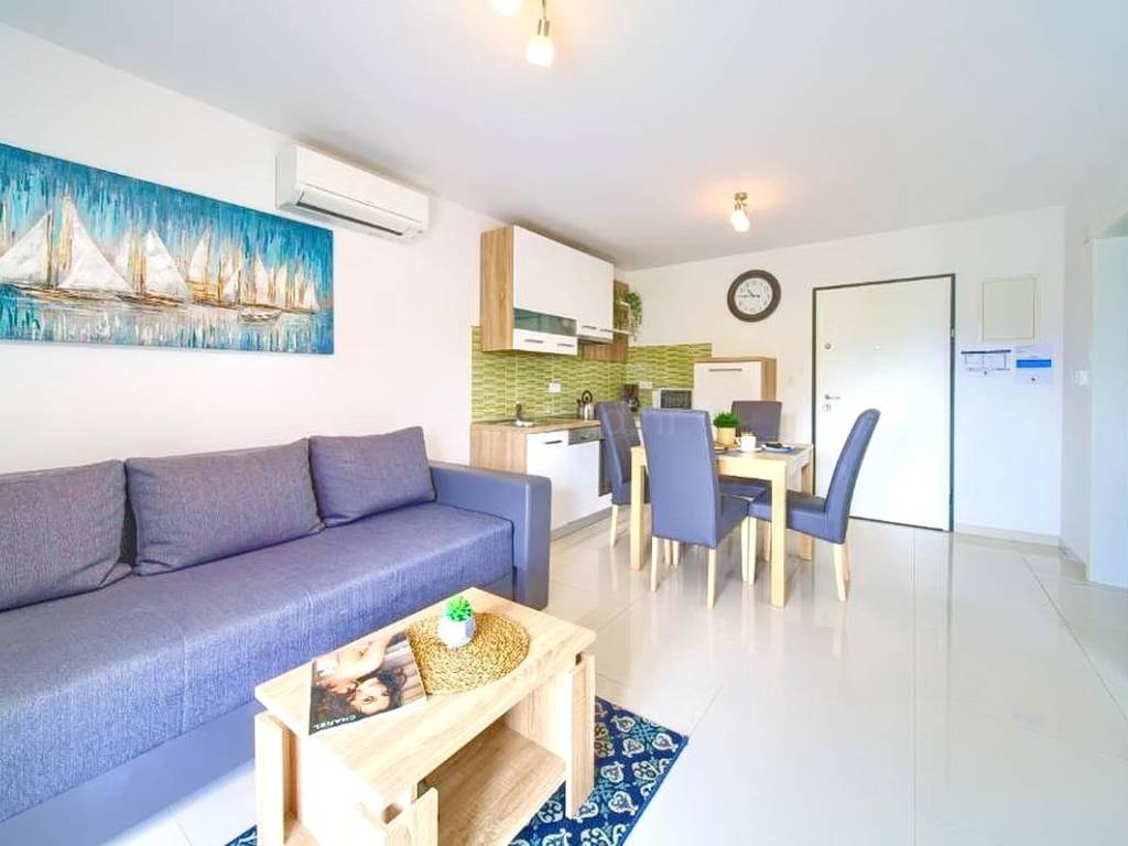 Within a modernly designed building, the apartments extend over the ground floor and the first floor with a total area of 107 m². On the first floor, there is a living room, a kitchen with a dining area, two bedrooms, a bathroom, and a terrace with a beautiful view. The ground floor apartment includes an entrance hall, living room, kitchen with dining area, bathroom, and bedroom, with the added benefit of a landscaped garden of 76 m². The interior spaces are equipped with functional furniture and the necessary technical equipment, ensuring comfortable living.