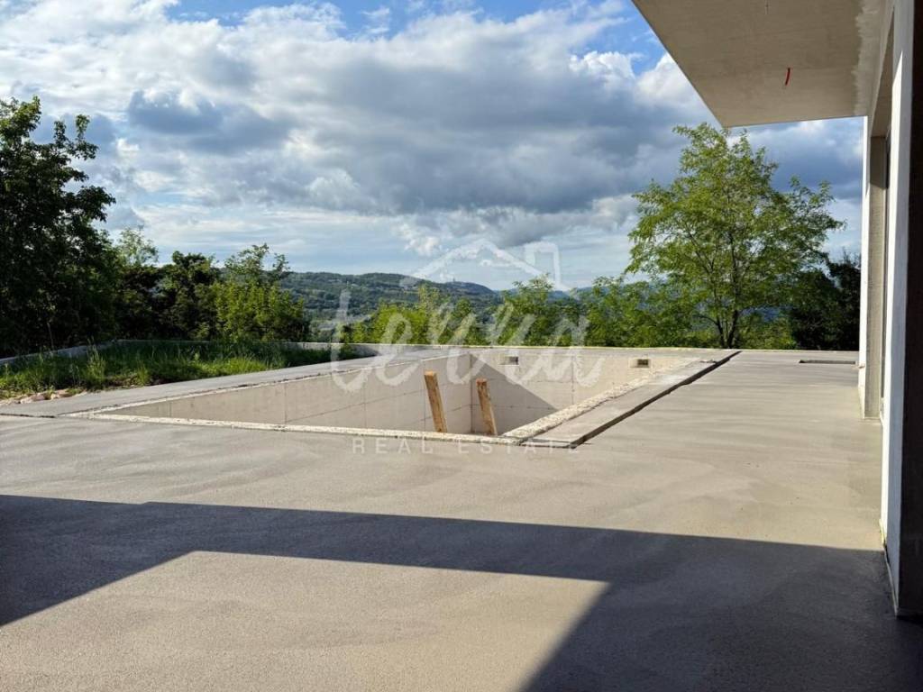 Beautiful villa near Labin. This modern villa of 150m2, on a spacious plot of 1328m2, offers complete privacy. It is designed as a modern and elegant space, illuminated by large glass walls that provide an open panoramic view. On the ground floor there is an entrance hall, open space living room, kitchen and dining room with access to a covered terrace and sunbathing area, a 36m2 swimming pool and a barbecue and socializing area. On the ground floor there is also a bedroom and a bathroom. On the first floor there are two bedrooms, each with its own bathroom, balcony and utility room.