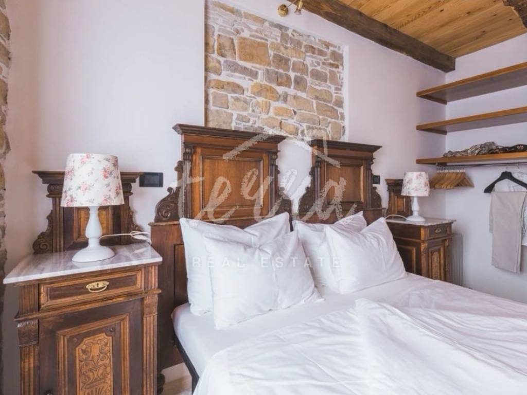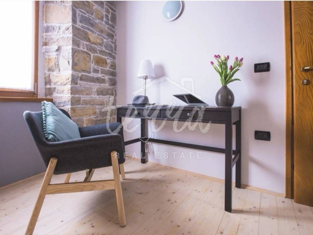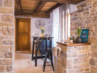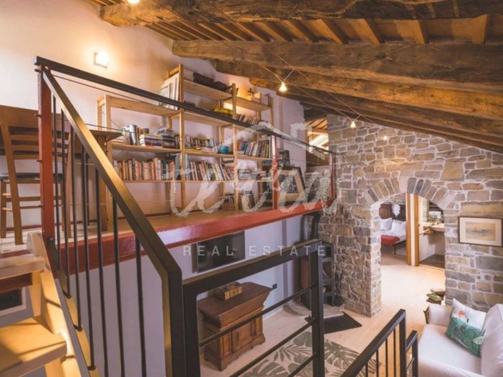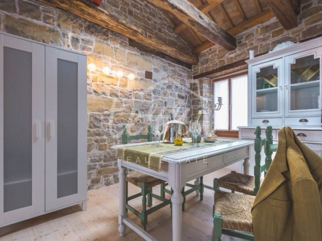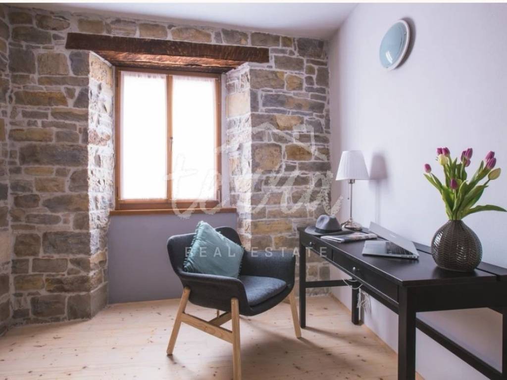 A beautiful and fully furnished house with two office spaces is located in the historical center of Oprtlje. The house is spread over three floors, on each there is an apartment with a separate entrance, the advantage is that each apartment can be used as a separate unit. The apartment consists of a living room, an open kitchen and dining room, a bedroom and a bathroom. The apartment at the top has a mansard with a library and a room for: rest-study-playroom... depending on what the owner wants. The house is entered by stone stairs, at the entrance there is a small hall and internal wooden stairs lead to each floor with a separate entrance to the apartment. Every detail was taken care of in the decoration of the apartment, which can be seen from the attached photos. There are two business spaces on the ground floor. This property offers numerous possibilities to the future buyer.