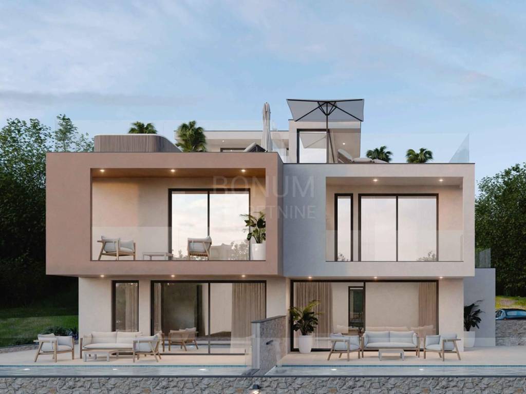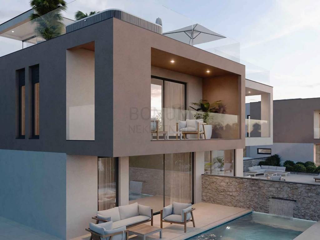 A luxurious semi-detached house is for sale in Vodice, a new building of modern architecture that will be built with high-quality materials and equipped according to the highest construction standards. This property is particularly valuable due to numerous modern details and equipment such as a polystyrene facade, PVC joinery, roller shutters with electric lifts, lift-sliding walls, ceramic flooring in the bathrooms, kitchen and living room, laminate flooring in the bedrooms, modern bathroom fixtures, electric hot water heaters, inverter air conditioners for heating and cooling in all bedrooms and living room, underfloor heating with a heat pump and a video surveillance system. Each residential unit will have its own 22 m² swimming pool, garden and two parking spaces. The planned start of construction is in March 2025, and completion is expected at the end of 2026.