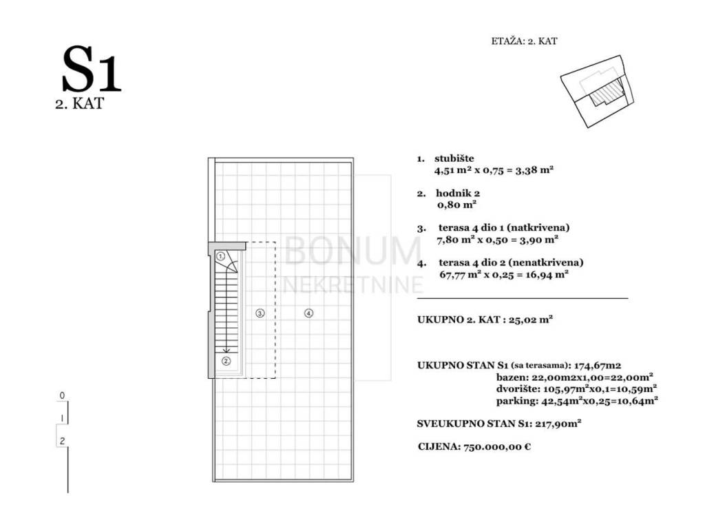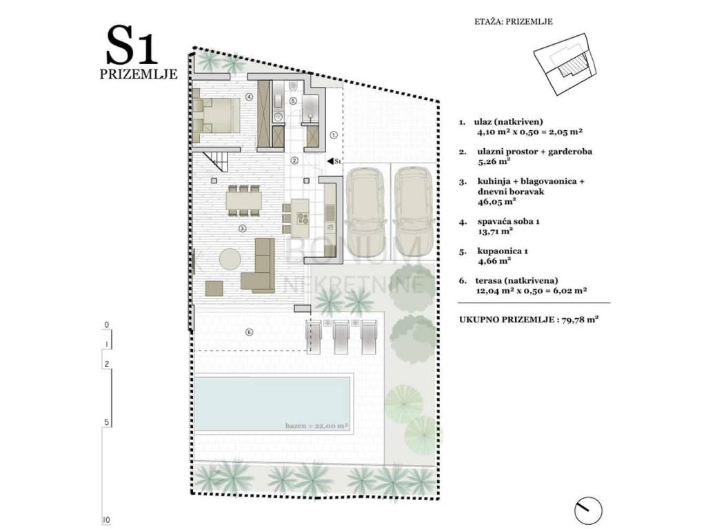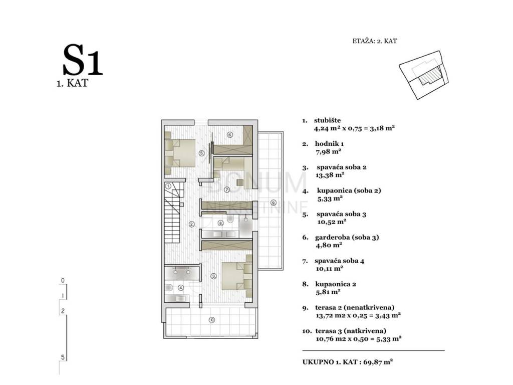 The house is located in a quiet and attractive location with a beautiful view of the sea and the surrounding area, only 800 meters from the beach and 1,100 meters from the center of Vodice. Residential unit S1 has a total net area of 217.90 m² and is spread over three floors - ground floor, first floor and second floor. The ground floor of 79.78 m² consists of an entrance, hallway, one bedroom, bathroom, spacious living room with kitchen and dining room and a covered terrace of 12.04 m². On the first floor of 69.87 m² there is a staircase, hallway, two bedrooms (one of which has a dressing room), a second bathroom, a terrace of 13.72 m² and a master bedroom with a private bathroom and a terrace of 10.76 m². An internal staircase leads to the second floor of 25.02 m², which includes access to a spacious roof terrace with a covered area of 7.80 m² and an uncovered area of 67.77 m², perfect for enjoying the view and privacy.
