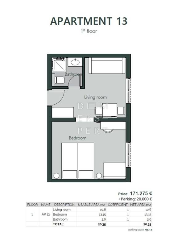The building consists of a ground floor and two upper floors. The apartment has an area of 26.35 m². It has an excellent and functional layout, is bright, and luxuriously furnished.