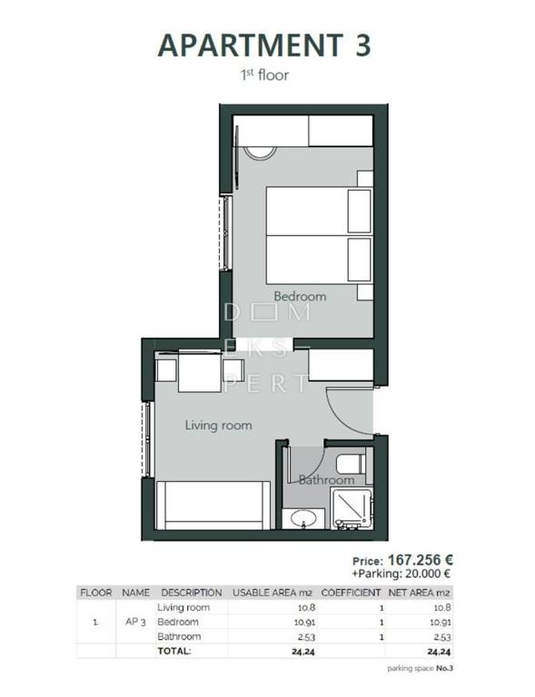 The building consists of a ground floor and two upper floors. The apartment has an area of 24.24 m². It has an excellent and functional layout, is bright, and luxuriously furnished.