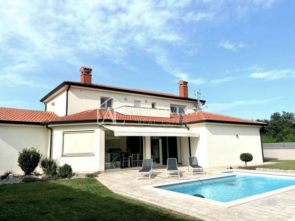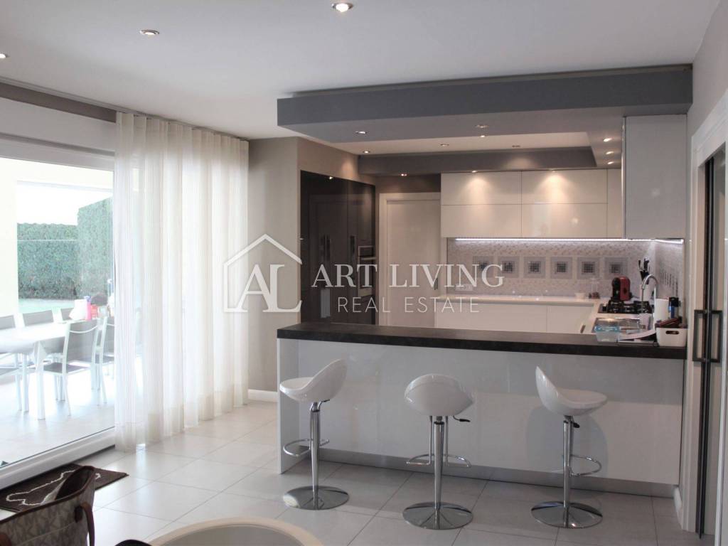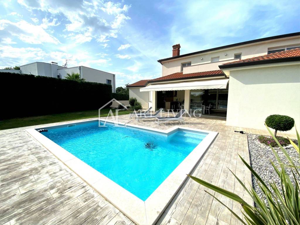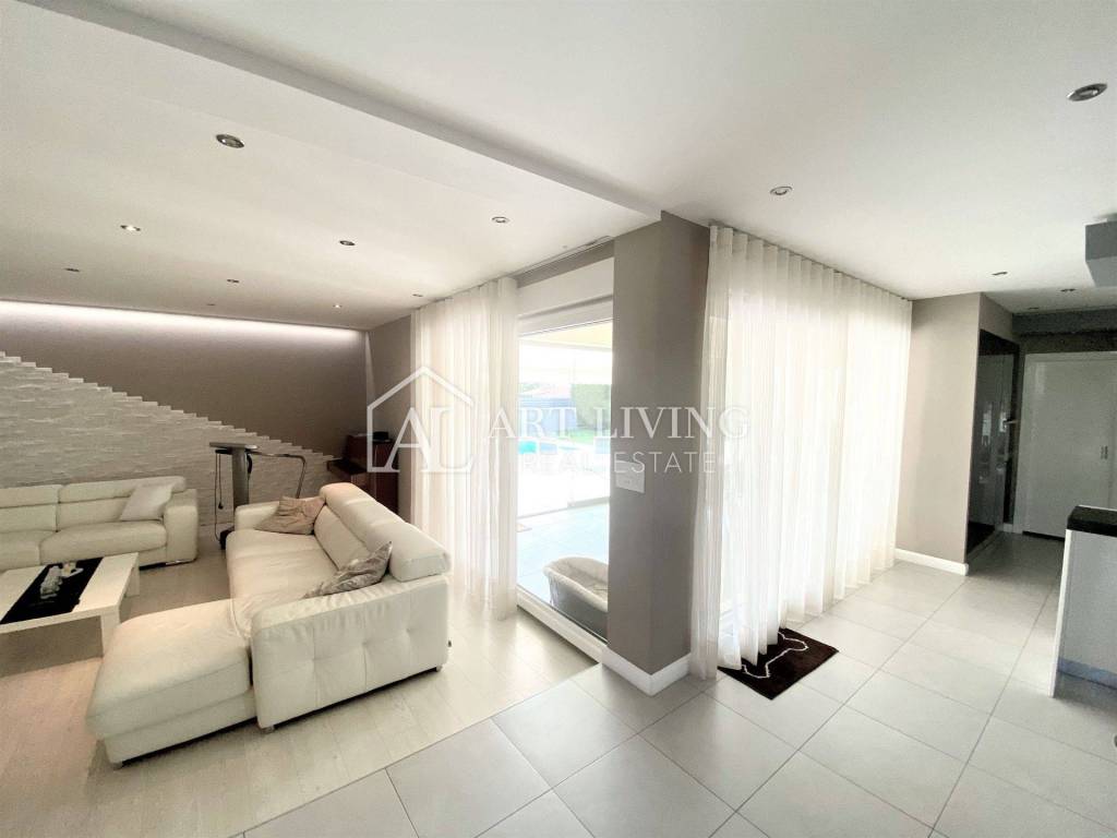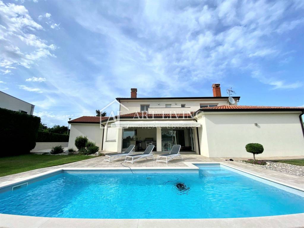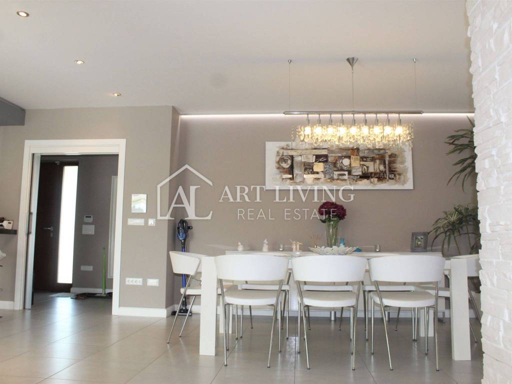 Porec, modern villa with pool This exclusive villa with a net area of 288.07 m2 is located near the town of Porec and only 2 km from the sea. The house has a beautifully landscaped garden with a pool that can be accessed directly from the living room, which together with the kitchen and dining room forms a beautiful, open whole. From the living room there is also access to a covered terrace with a summer kitchen, which can be open or closed, which allows it a glass wall along the terrace. On the ground floor there is also a room with a private bathroom. From the living room, lighted stairs lead to the first floor where there are two spacious bedrooms with private bathrooms and a spacious dressing room between them. Upstairs are two terraces with a beautiful view. This modern villa stands out with its design and quality of workmanship, and is equipped with the most modern appliances and furniture.