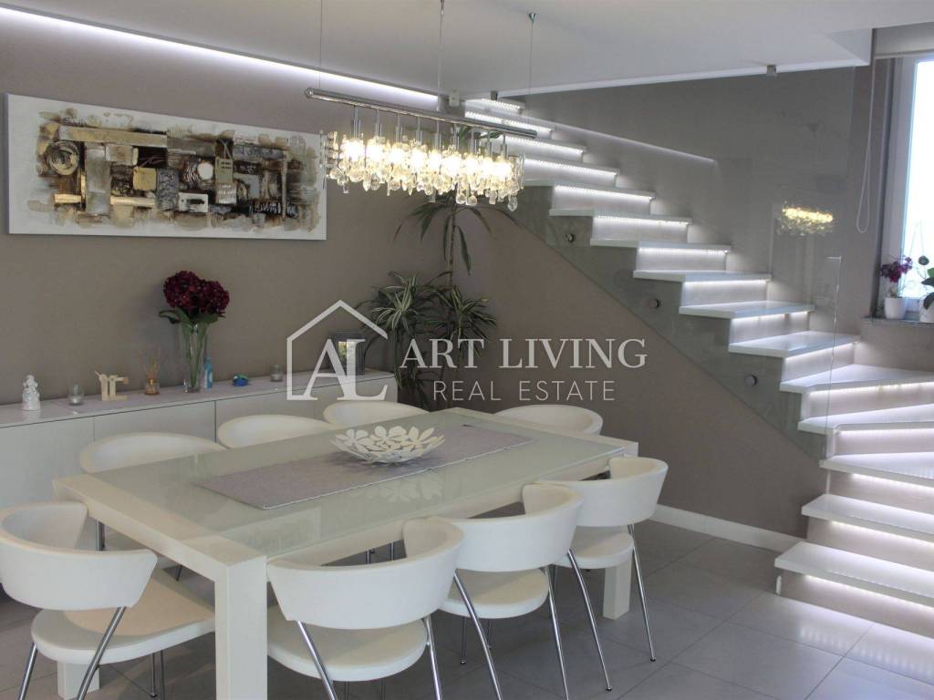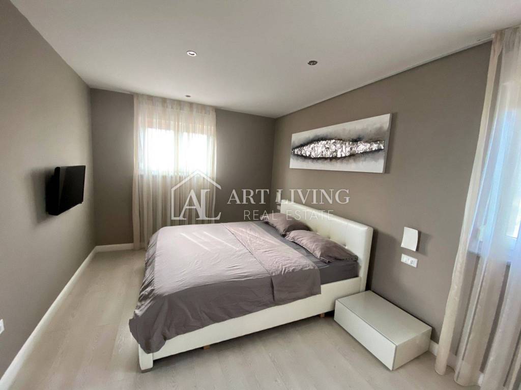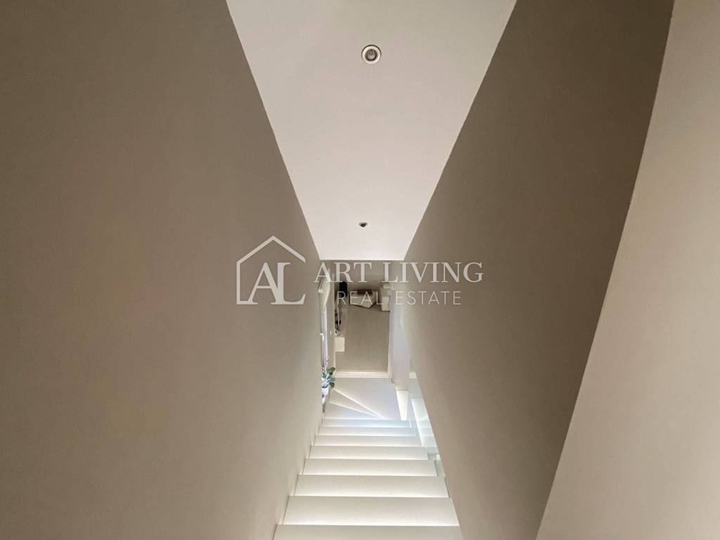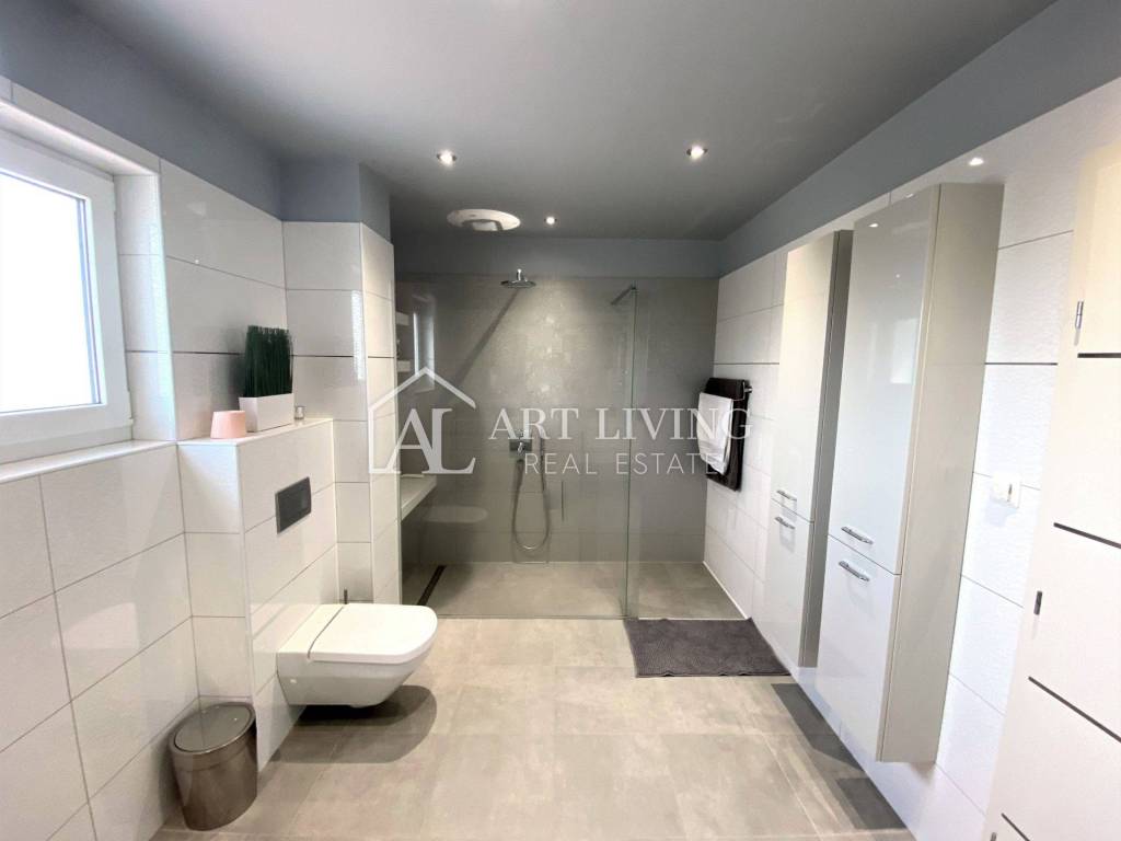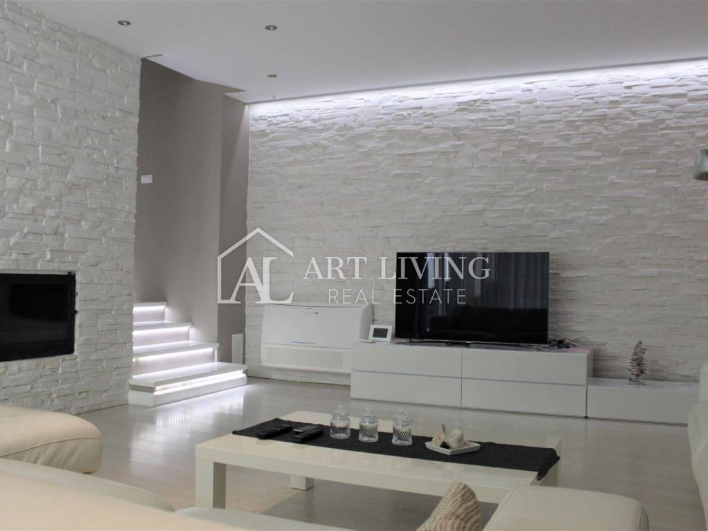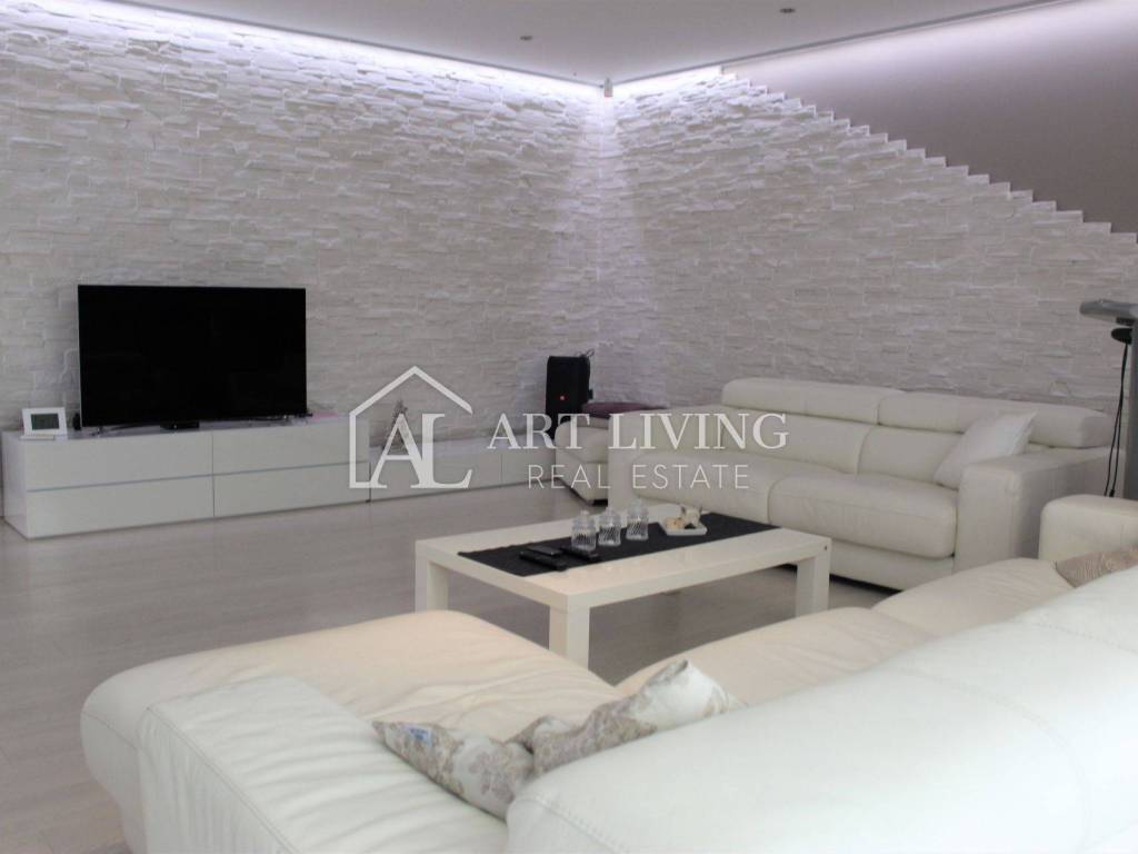 Porec, modern villa with pool This exclusive villa with a net area of 288.07 m2 is located near the town of Porec and only 2 km from the sea. The house has a beautifully landscaped garden with a pool that can be accessed directly from the living room, which together with the kitchen and dining room forms a beautiful, open whole. From the living room there is also access to a covered terrace with a summer kitchen, which can be open or closed, which allows it a glass wall along the terrace. On the ground floor there is also a room with a private bathroom. From the living room, lighted stairs lead to the first floor where there are two spacious bedrooms with private bathrooms and a spacious dressing room between them. Upstairs are two terraces with a beautiful view. This modern villa stands out with its design and quality of workmanship, and is equipped with the most modern appliances and furniture.