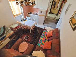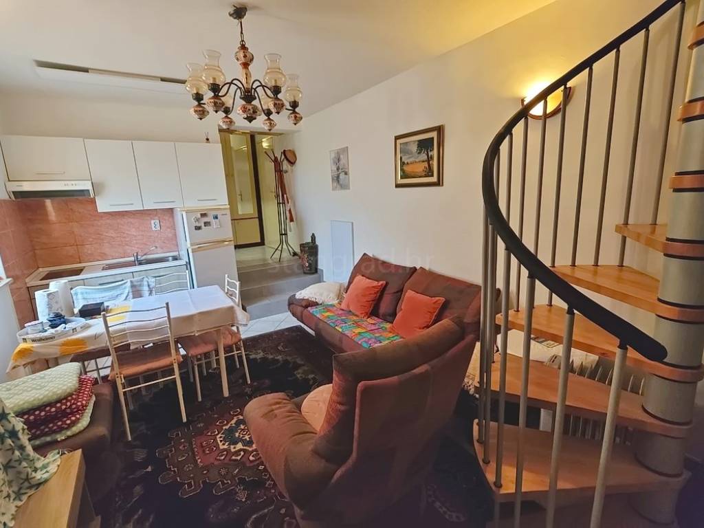 Situated within a well-constructed residential building, the apartment spans the ground floor and the first floor, with a total area of approximately 40 square meters. The ground floor comprises an entrance hall, living room with an open-plan kitchen and dining area, and a terrace. An internal staircase leads to the upper floor, which houses the bedroom. The interior is well-maintained and comes equipped with quality furniture and reliable technical appliances, making it move-in ready without the need for additional investment. The apartment is positioned in a way that it does not directly adjoin neighboring units, offering peace and a sense of privacy.