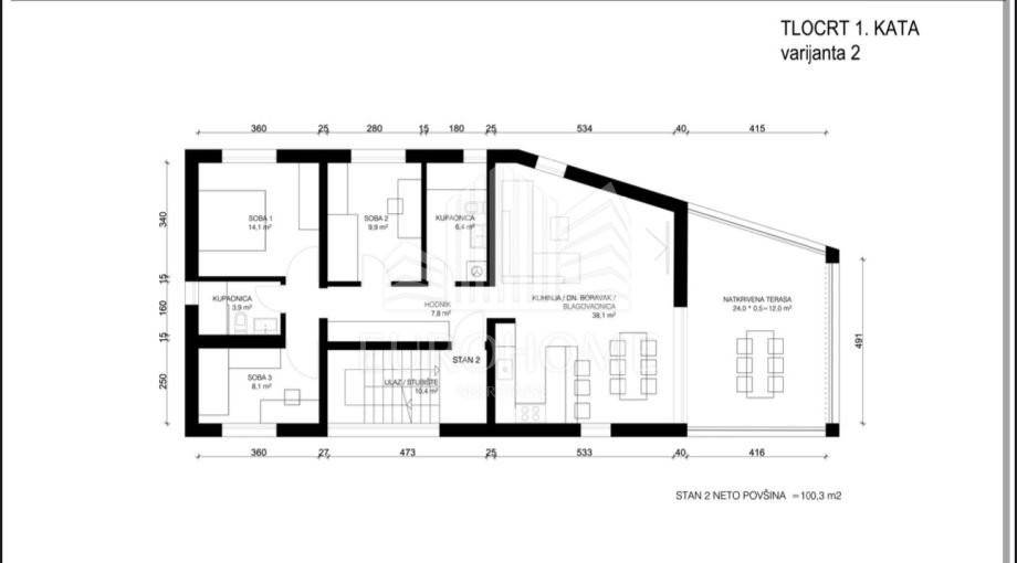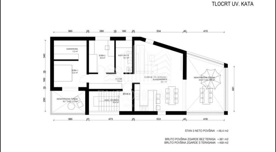 Bruto površina zgrade bez terasa 381m2, bruto površina s terasama 459m2.