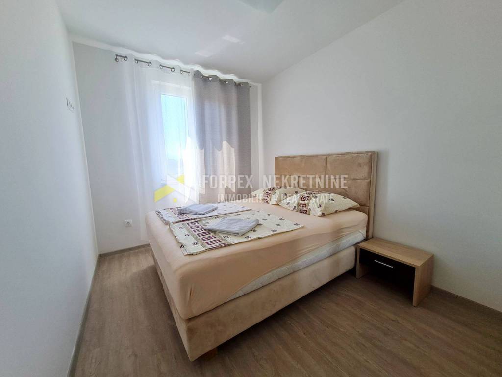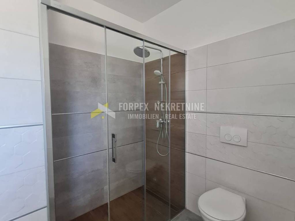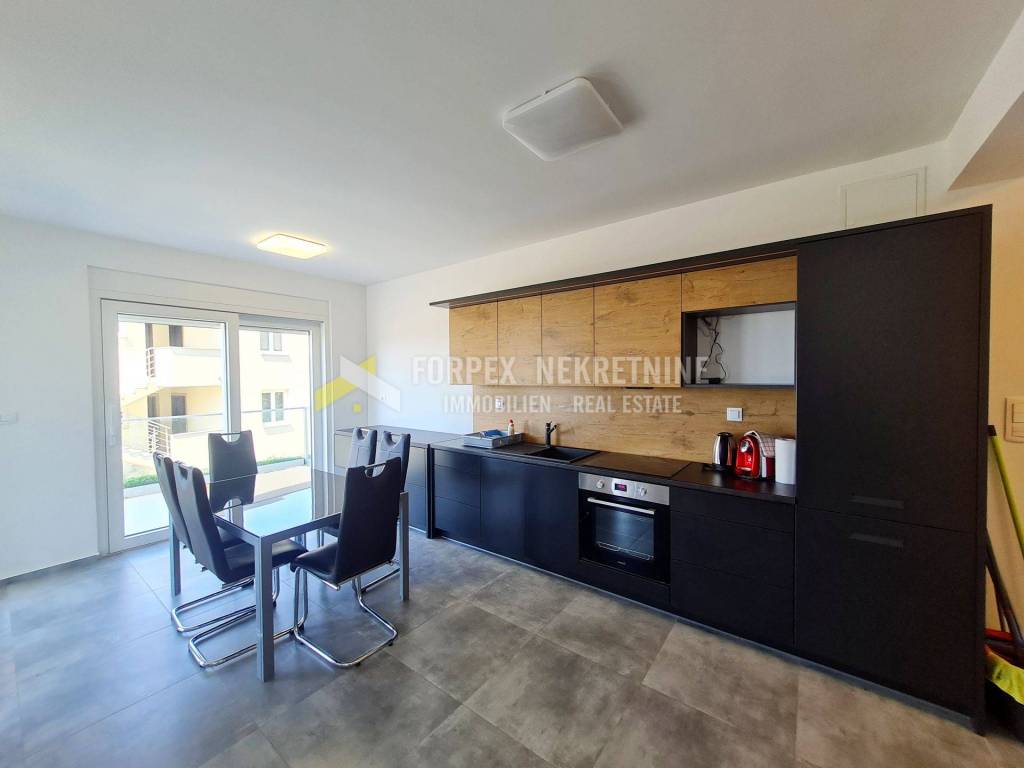 In Novi Vinodolski, the village of Smokvica, a 75 m2 apartment with a garden is for sale. The apartment consists of two bedrooms, a toilet, a bathroom, a kitchen, a dining room, a living room and a spacious terrace with a view of the sea. It is located on the first floor of a newly built building. During construction, quality materials were used, such as ceramics, interior and exterior carpentry, and kitchen furniture. The apartment is equipped with air conditioning and underfloor heating, which provides the possibility of a year-round stay. There is also a swimming pool within the building.