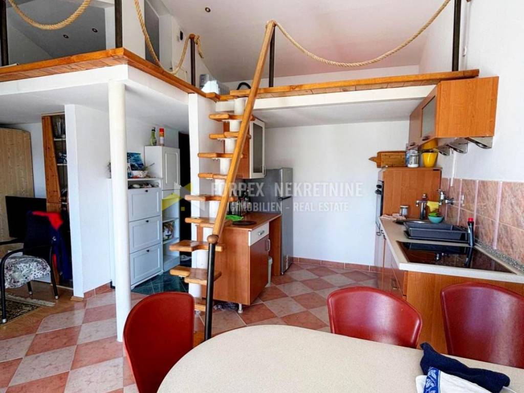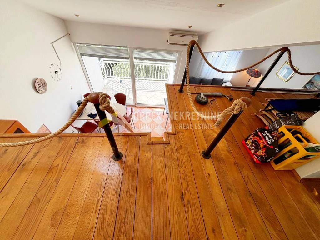 A charming apartment in Novi Vinodolski with a beautiful sea view is for sale. Although it is not right on the coast, thanks to its elevated position it offers complete tranquility and a view that you would hardly find by the sea. The apartment consists of two comfortable bedrooms, a decorated bathroom and an open concept kitchen, dining room and living room, which is ideal for socializing and enjoying everyday life. The living area opens onto a balcony of sufficient size. A special value of this property is the gallery as a multifunctional space that can be used as an additional bedroom, work area, hobby area or playroom for children. Located in a quiet environment, the apartment offers the perfect balance between relaxation and the practicality of living close to all amenities. If you want a home or investment with a seaside atmosphere, this is an opportunity worth exploring!